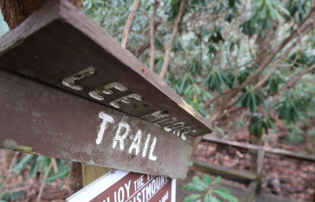 The trail eventually climbs up to a rocky fork in the road. A pile of blue-painted rocks denotes the continuation of Blue Ridge, while a stack of green-slathered stones indicates the beginning of Azalea Trail. If you miss both, there is also a brown sign imbedded in a nearby tree to show the way. Go green and take Azalea.