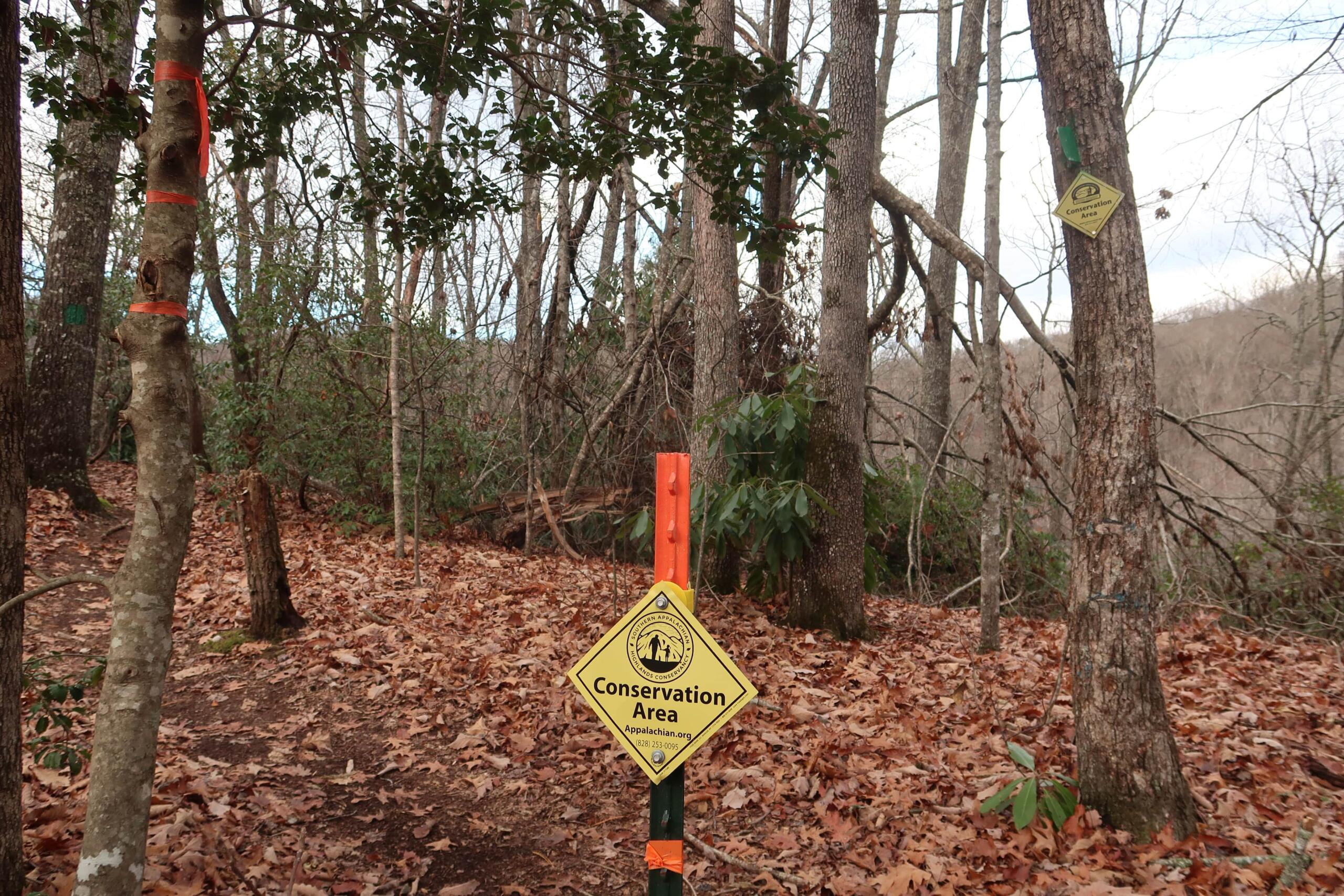 Azalea is the longest segment of the loop, but most important is to keep following the green blazes. At a certain juncture, orange conservation signs will appear, but these are merely an indication of the 600 acres of the Southern Appalachian Highlands Conservancy that Christmount is nestled inside. Head right on past them.