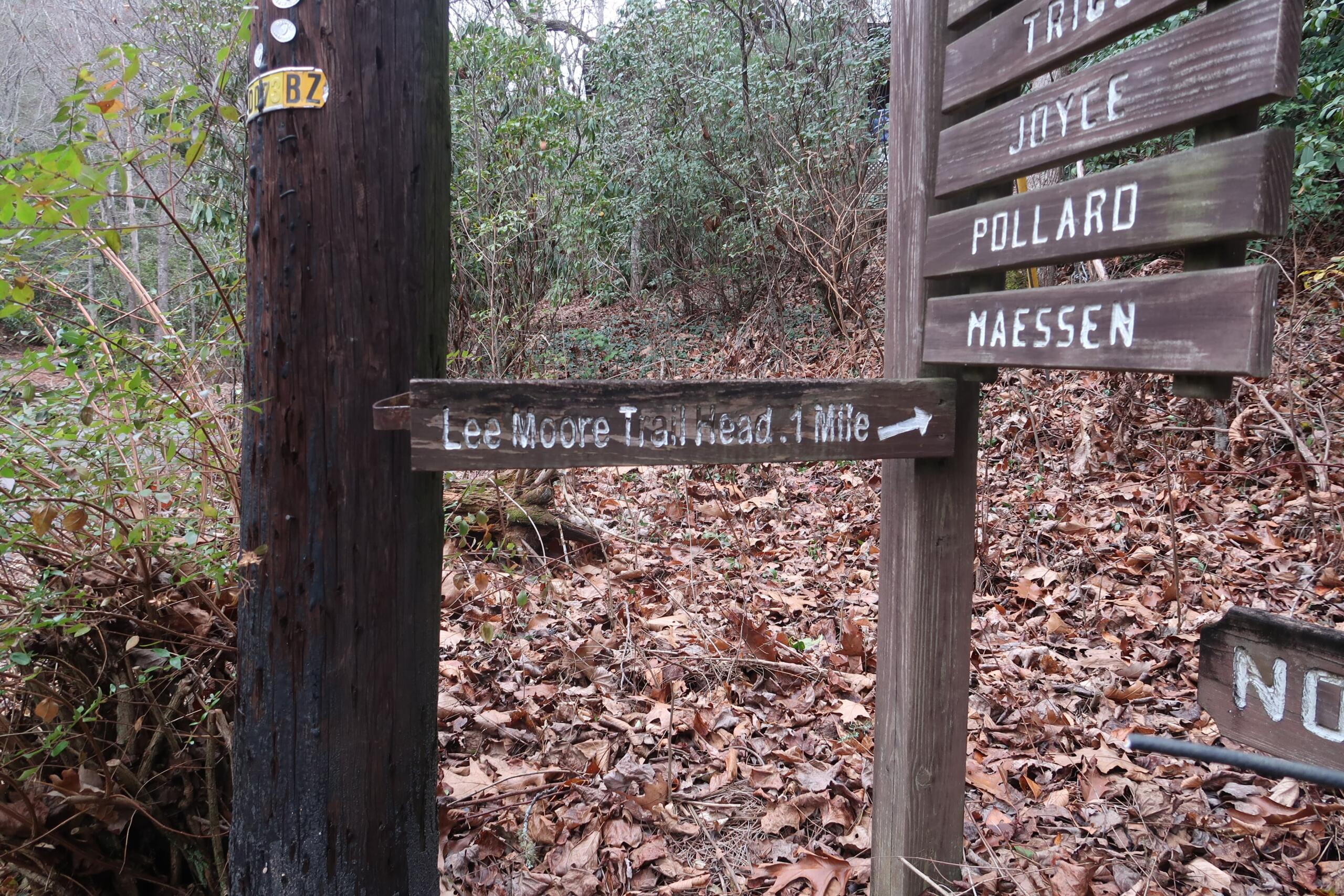 Keeping to the right, you’ll know you’re getting close when a collection of brown signposts appear, including one labeled “Lee Moore Trailhead .1 Mile ->.” An additional sign marked with a red band will herald the arrival of the first of three trails to follow: Lee Moore Trail. Lee Moore is marked by red blazes on the trees.