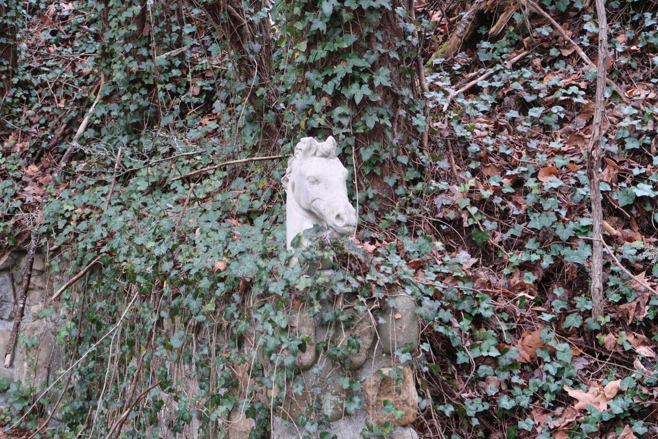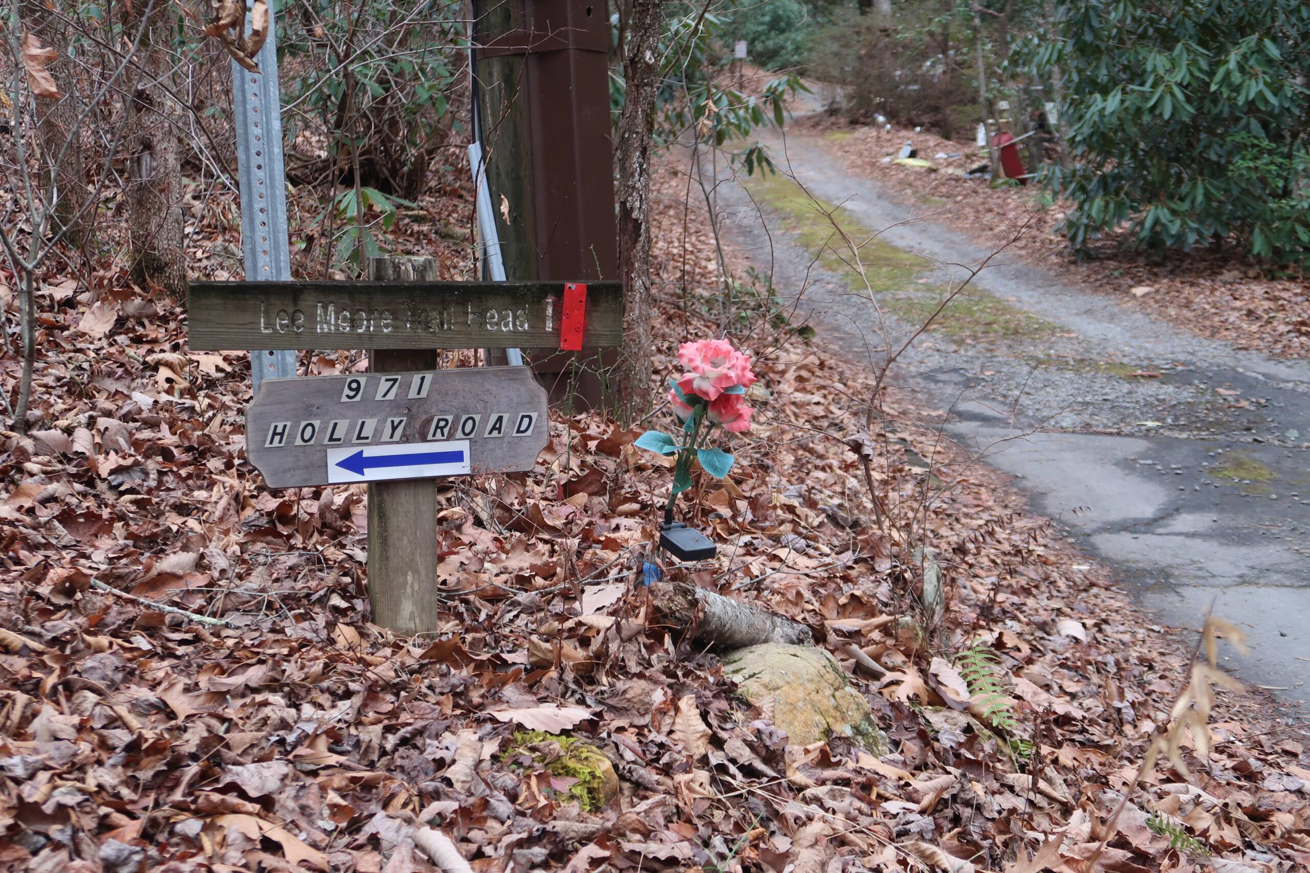 After parking, walk up Holly Road, minding traffic along the way. Christmount is scenic and quaint, with homes filled with small yard curios, like a leaf-strewn treehouse, log-propped slide and a bust of a horse’s head.