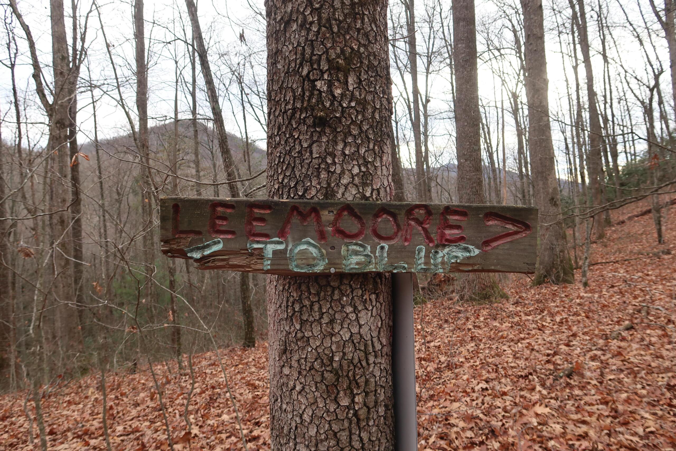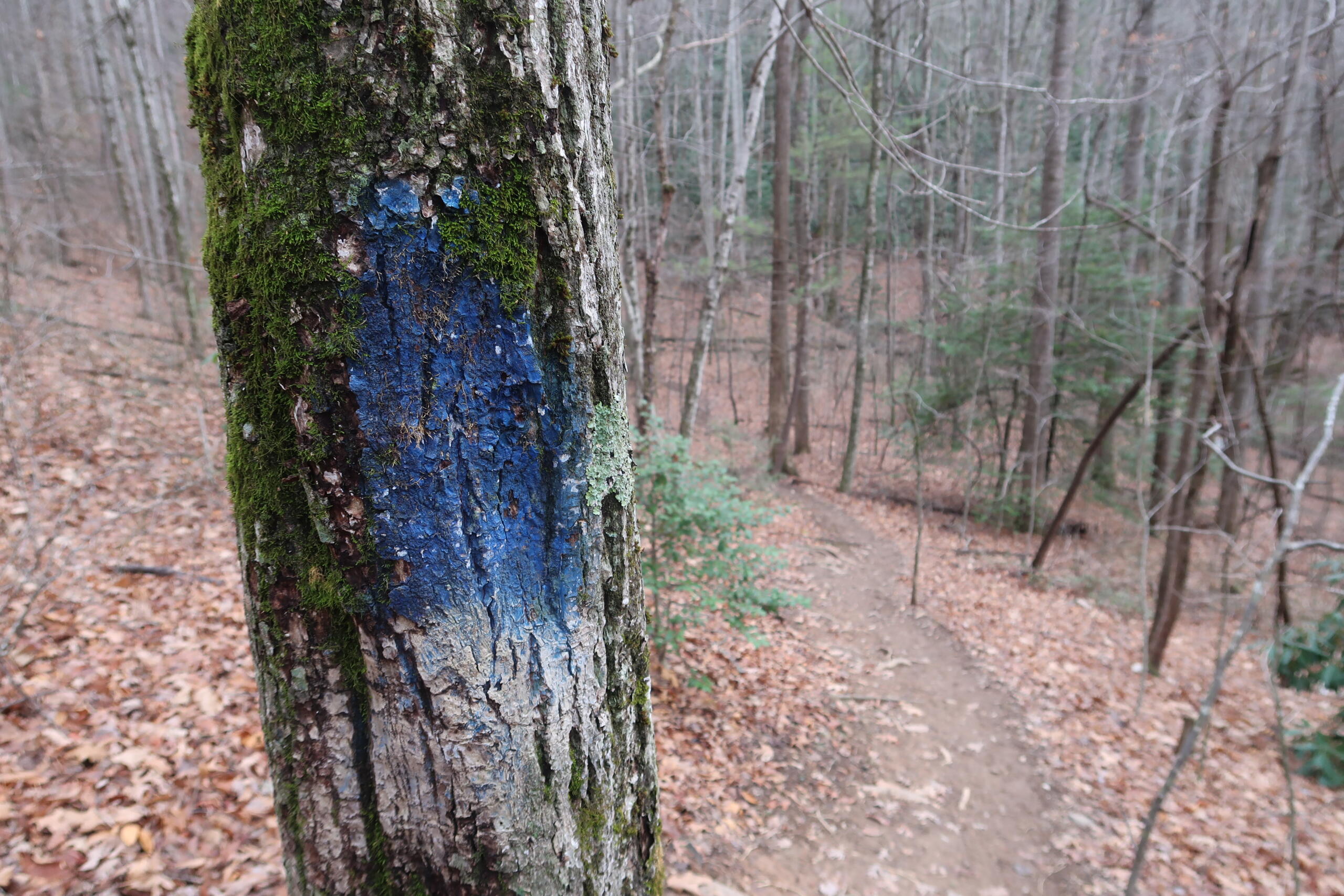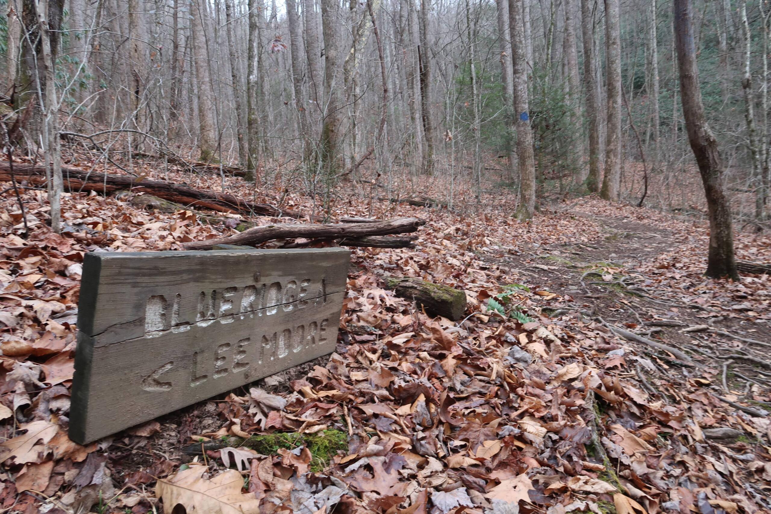 The trail climaxes on top of a ridge, where a sign points right in red paint for Lee Moore and left in light blue paint for “Blue,” or Blue Ridge Trail, which is marked by dark blue blazes.