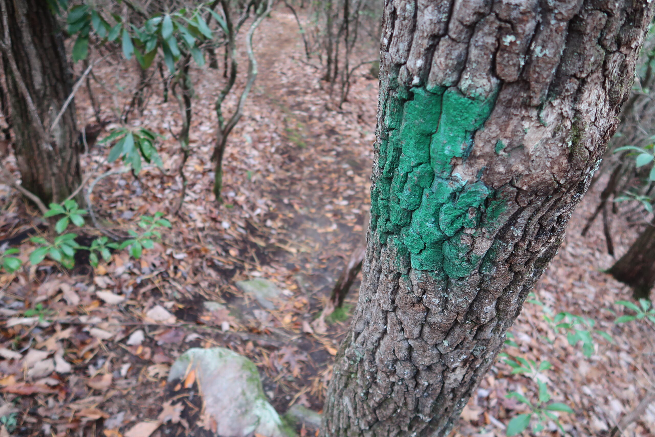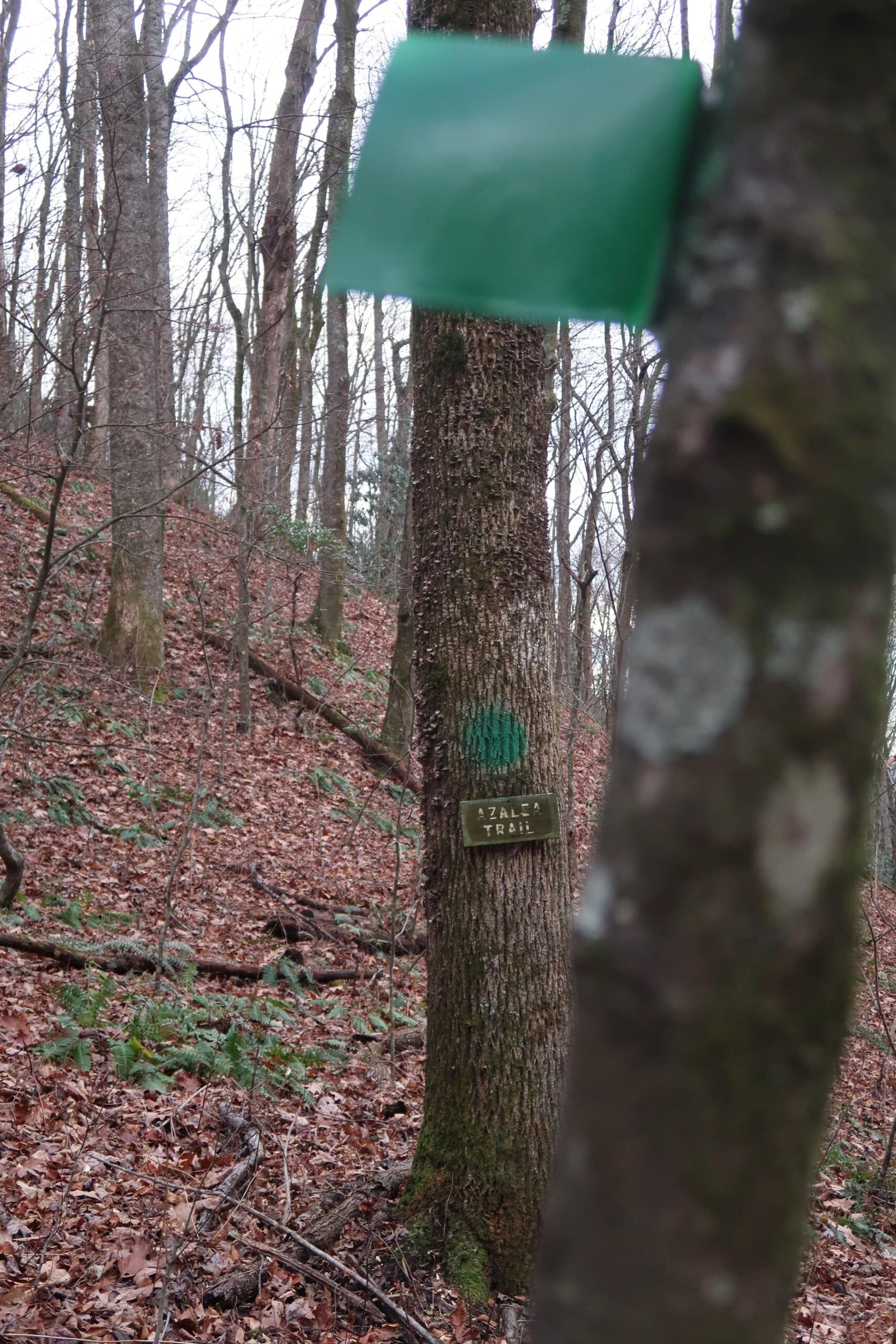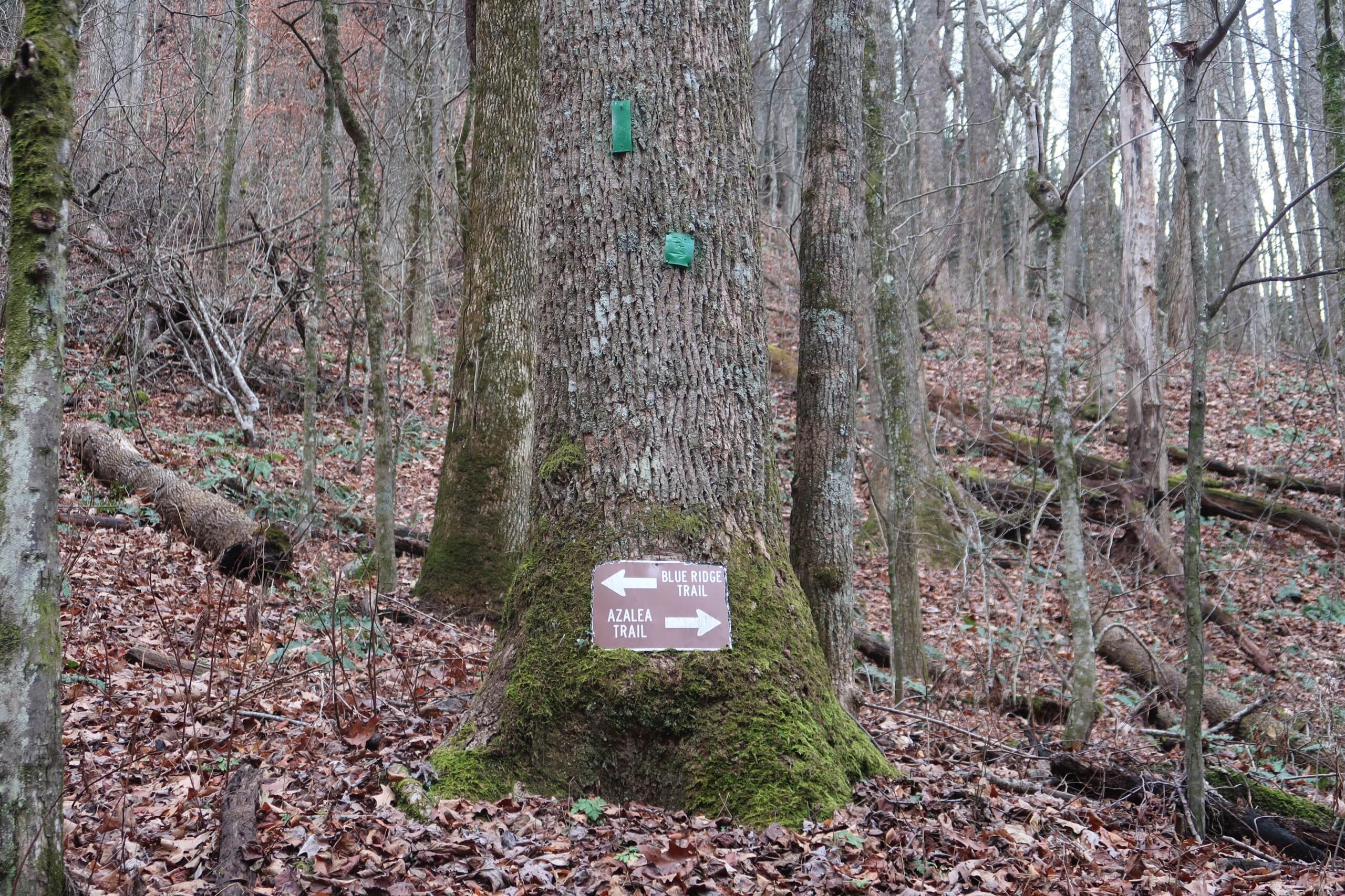 The trail eventually climbs up to a rocky fork in the road. A pile of blue-painted rocks denotes the continuation of Blue Ridge, while a stack of green-slathered stones indicates the beginning of Azalea Trail. If you miss both, there is also a brown sign imbedded in a nearby tree to show the way. Go green and take Azalea.