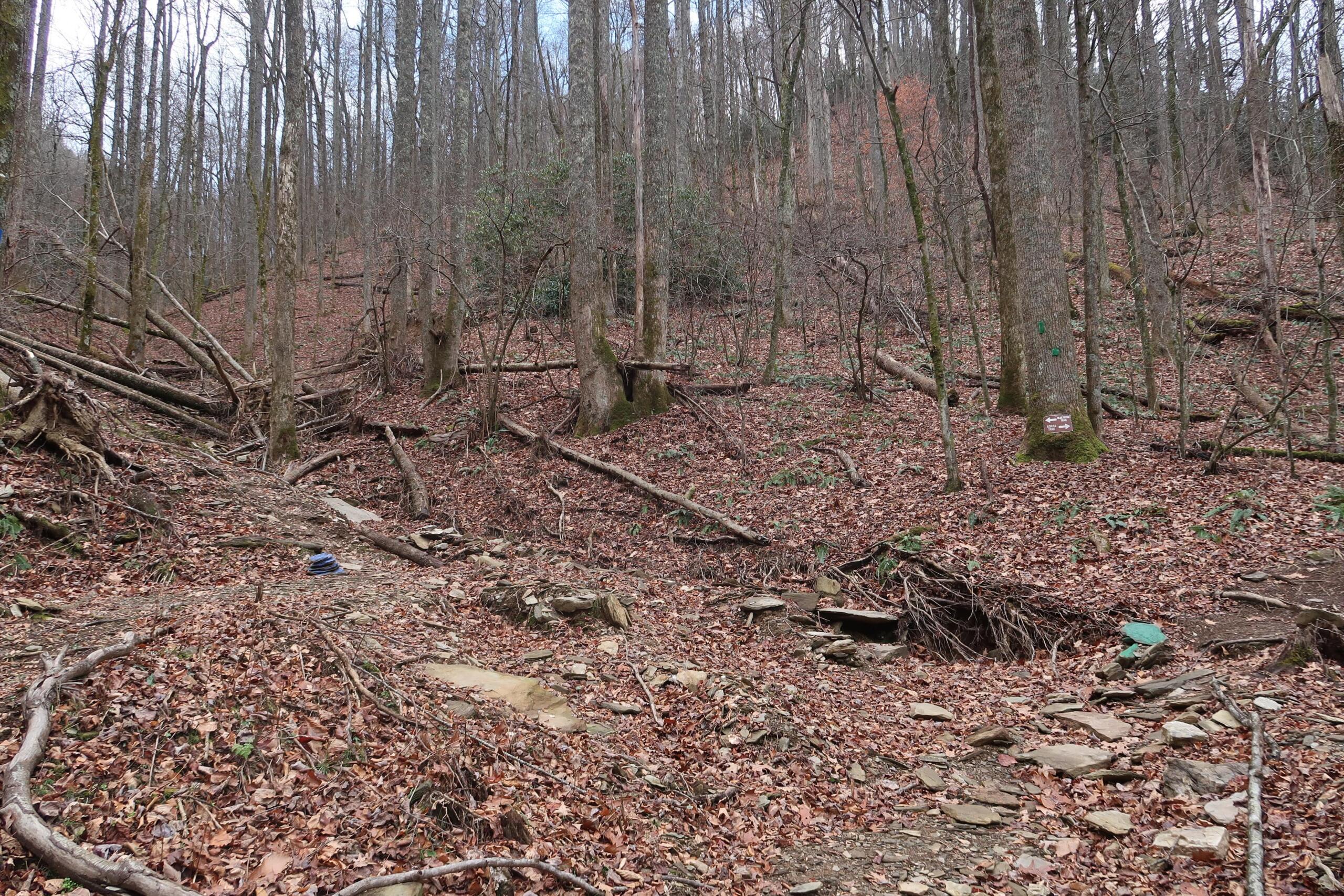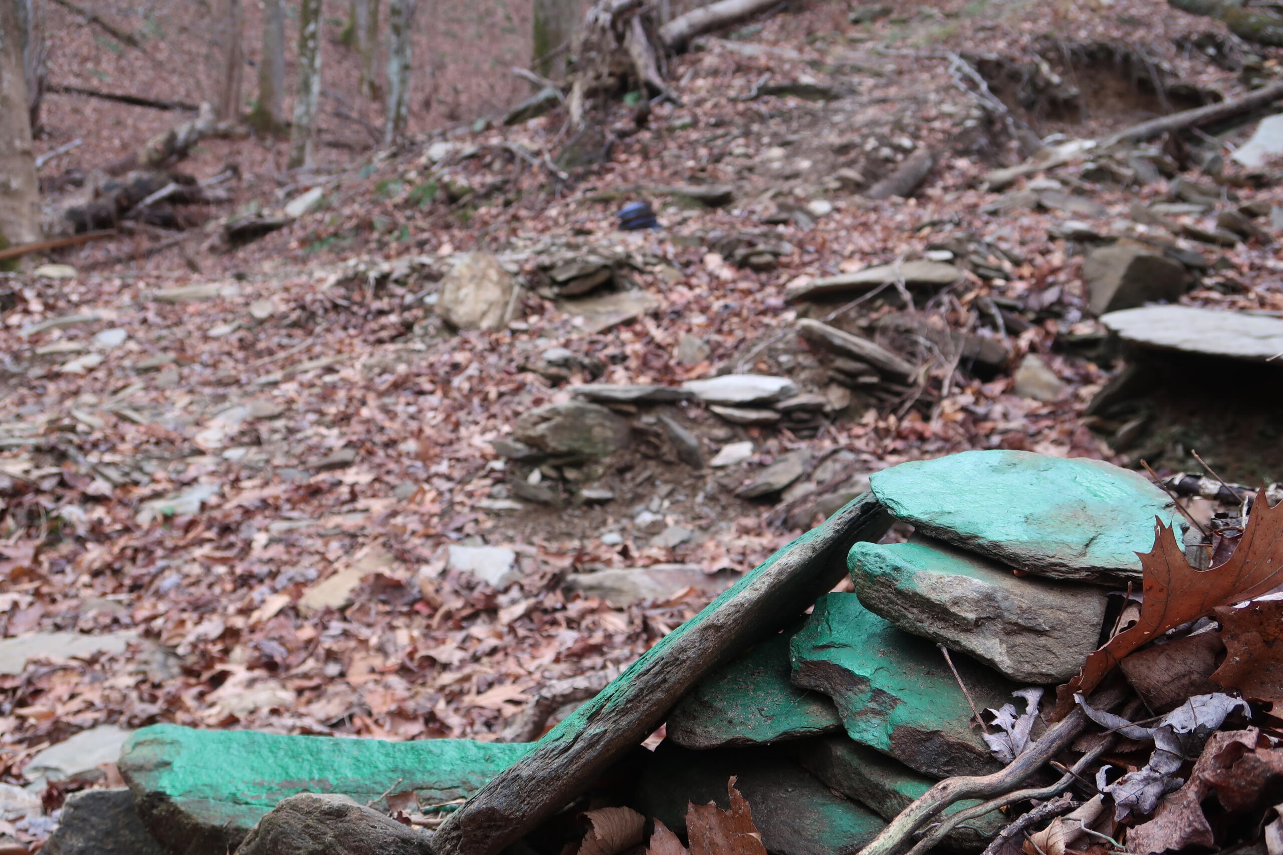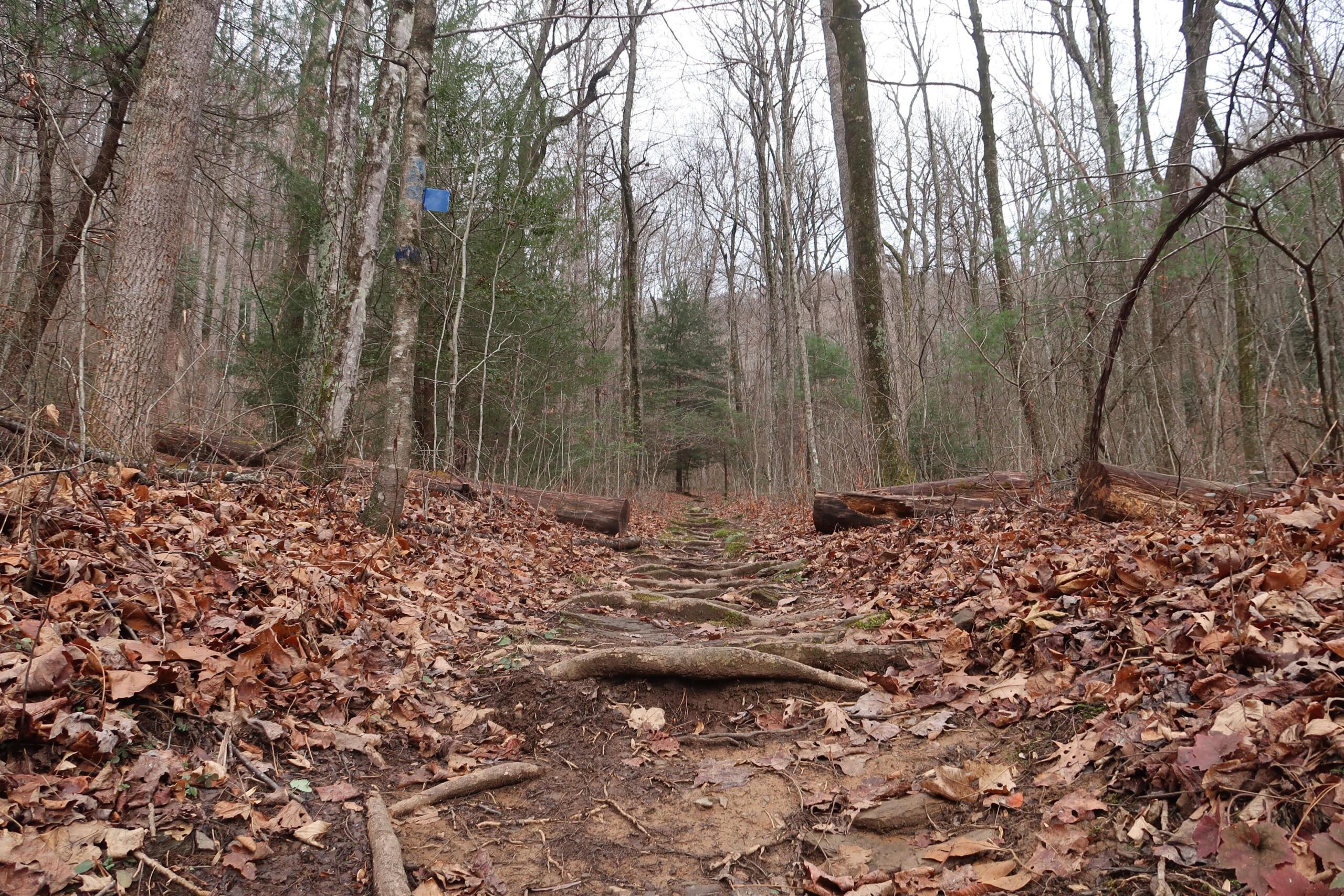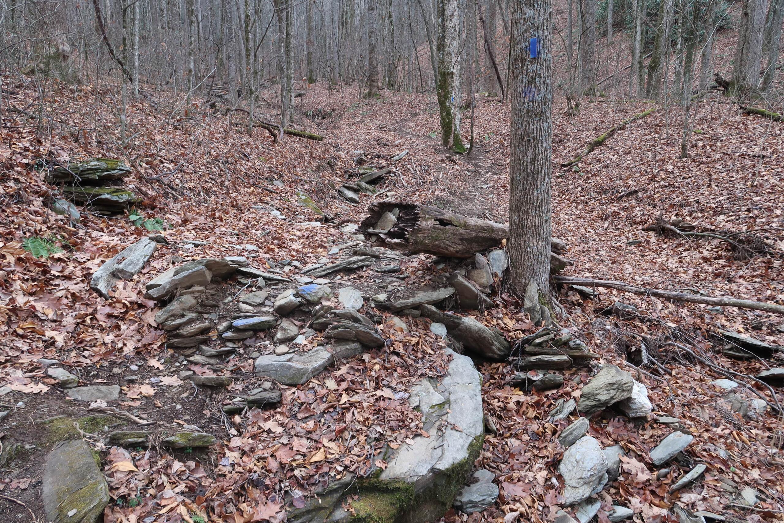 The trail eventually climbs up to a rocky fork in the road. A pile of blue-painted rocks denotes the continuation of Blue Ridge, while a stack of green-slathered stones indicates the beginning of Azalea Trail. If you miss both, there is also a brown sign imbedded in a nearby tree to show the way. Go green and take Azalea.