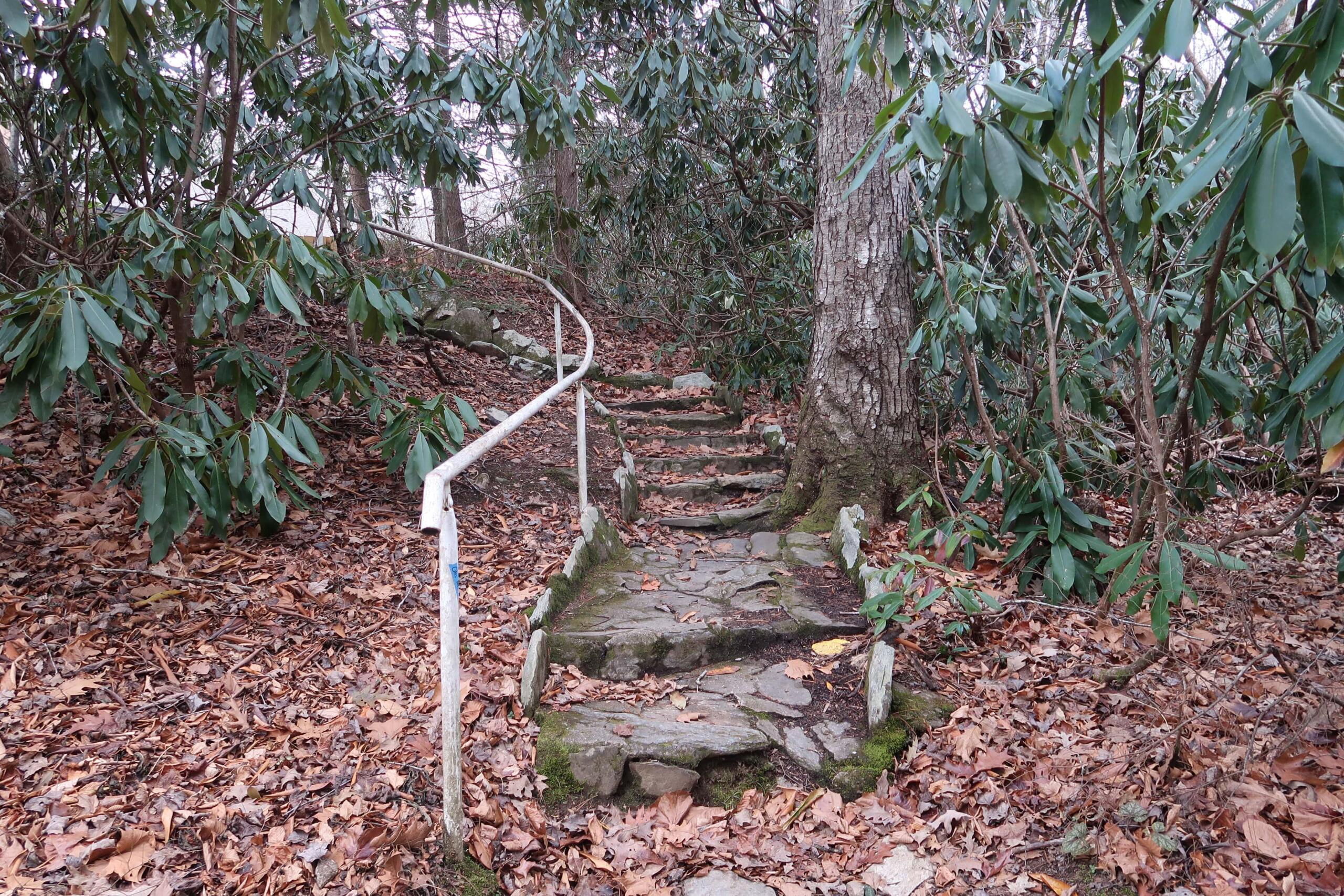 Heading down the stairs, watch out for slick wood and unstable rocks. Hold onto the railing when possible.