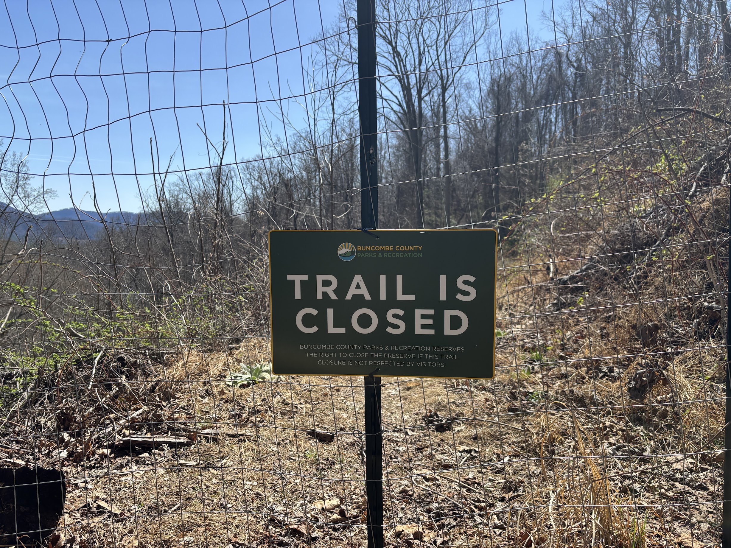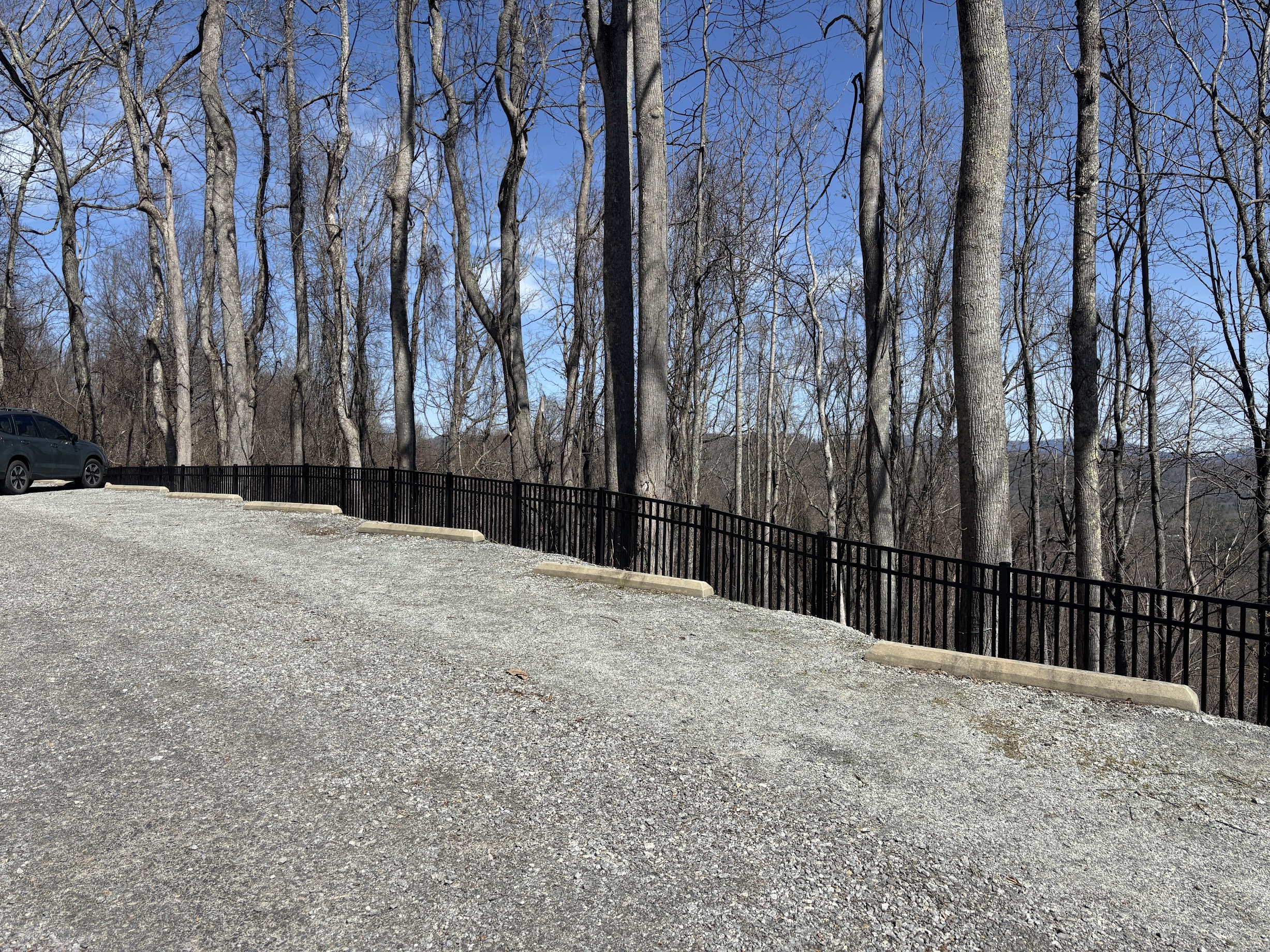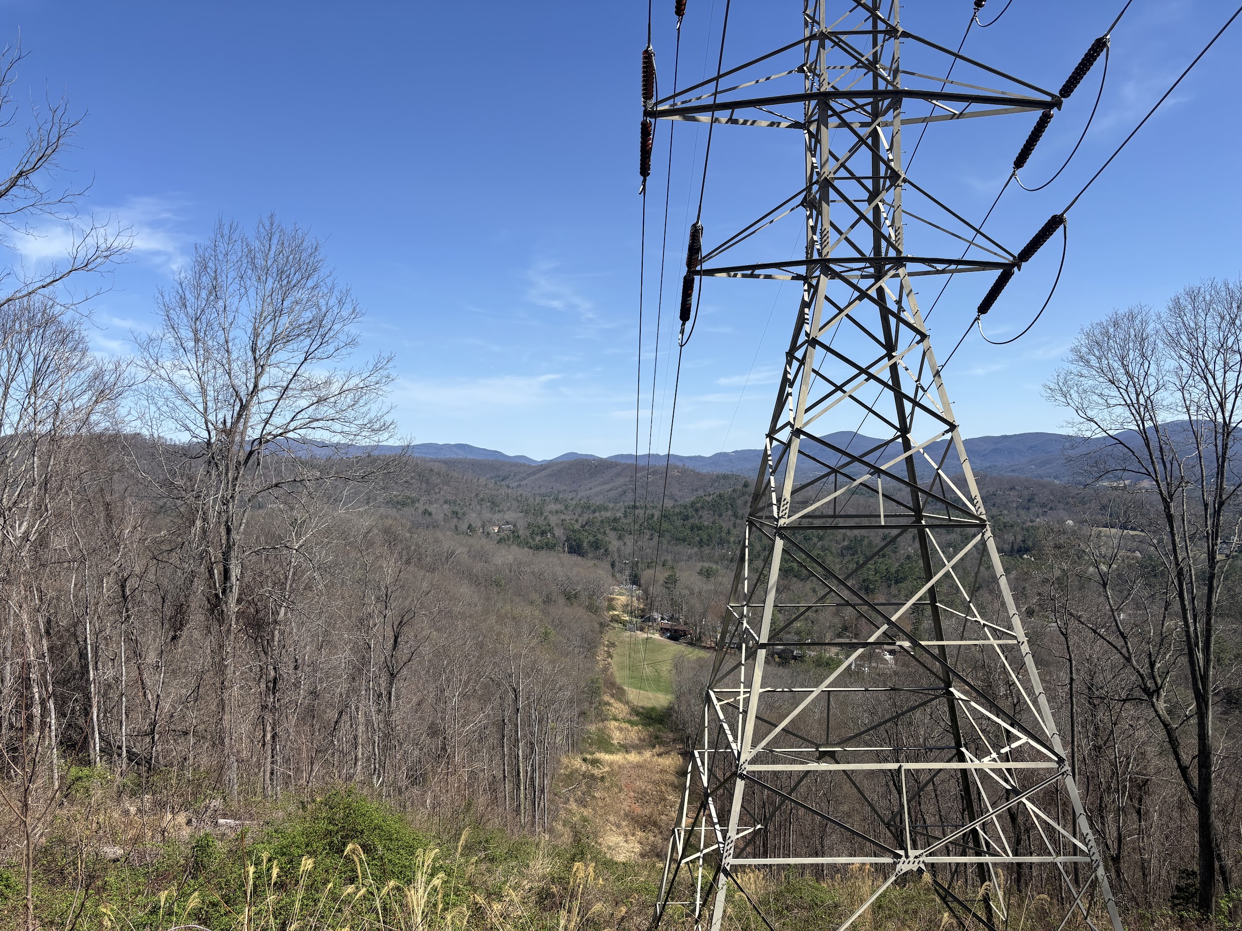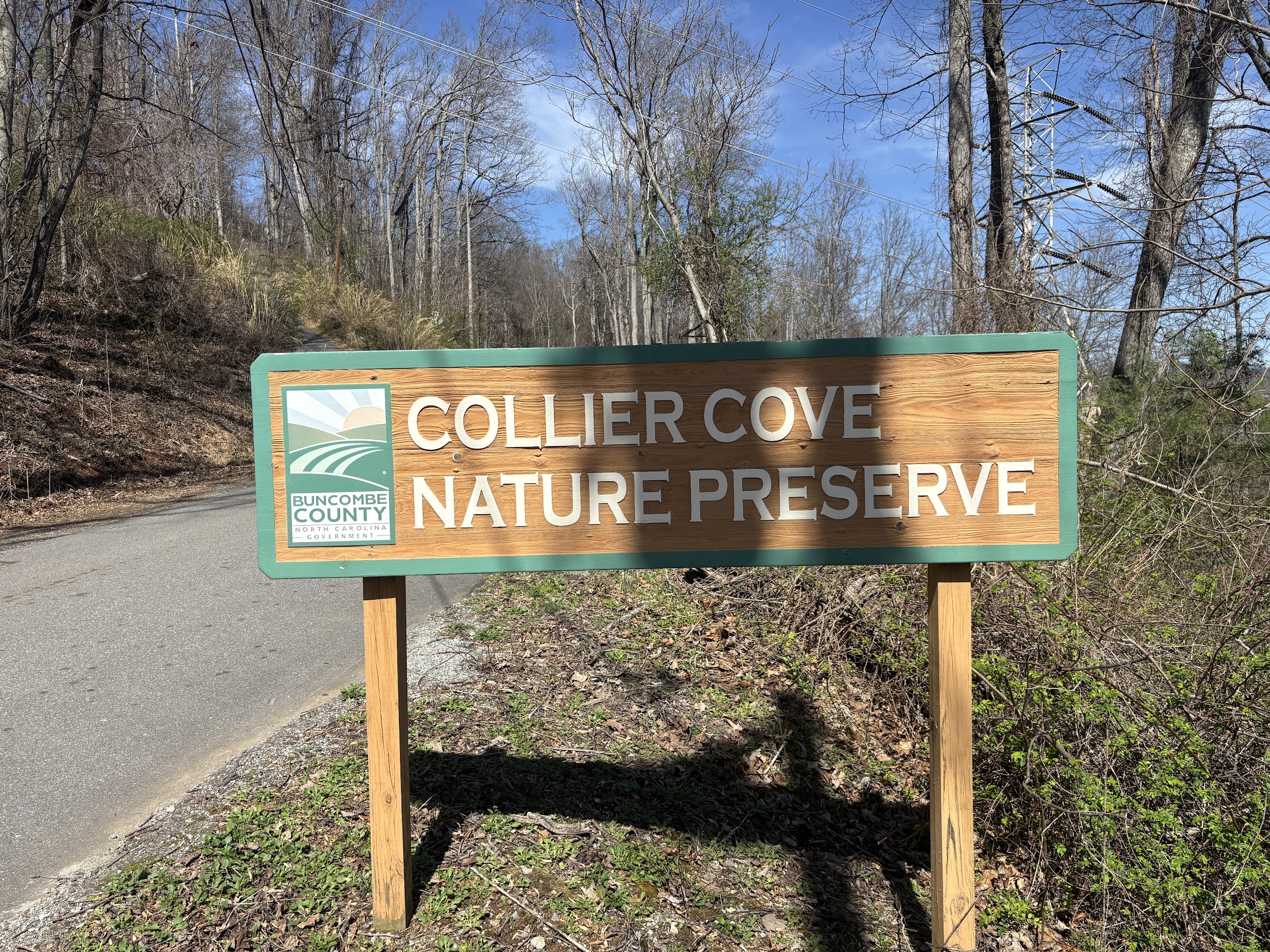 After the mildly distressing ascent to Collier Cove Nature Preserve, it is nice to have such an easy time parking. There are a good number of parking spots in a gravel area just inside property gates. The nearby electrical tower also serves as a great vantage for beholding the task before you: far below is the bell curve bottom of the park trails.
