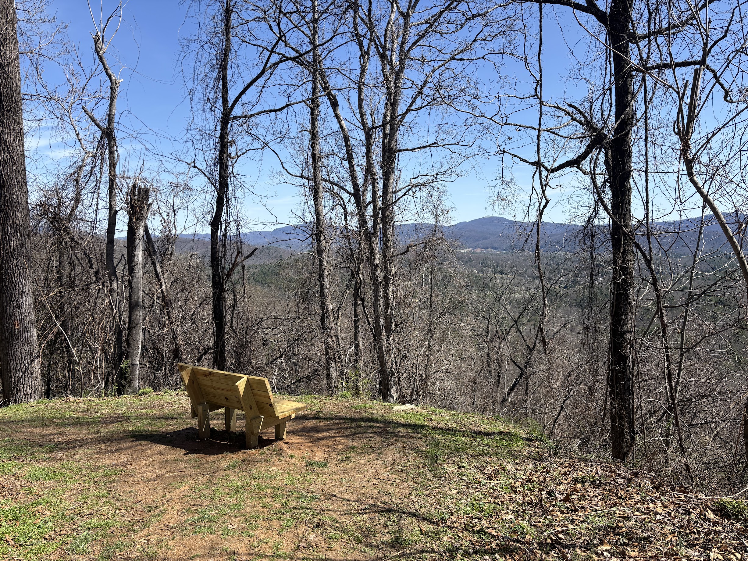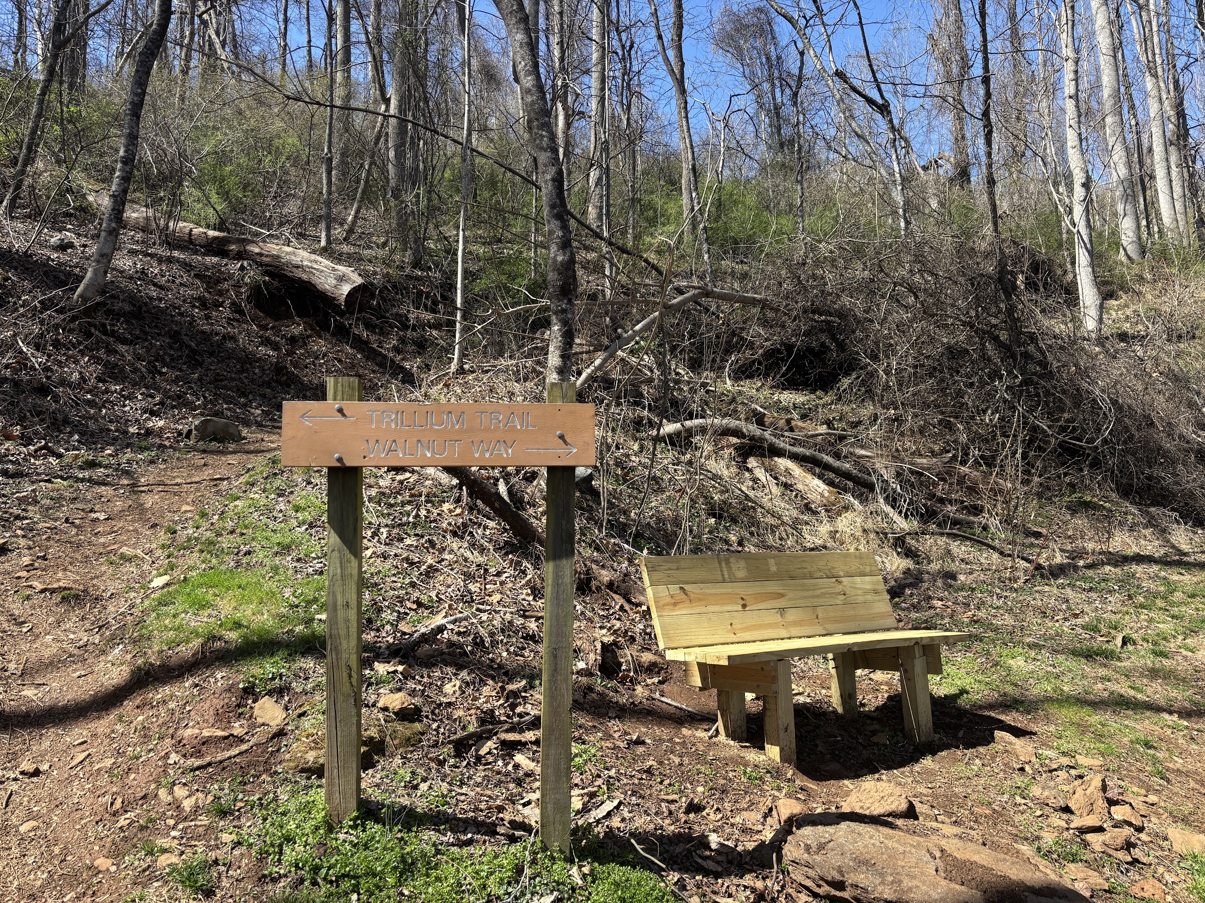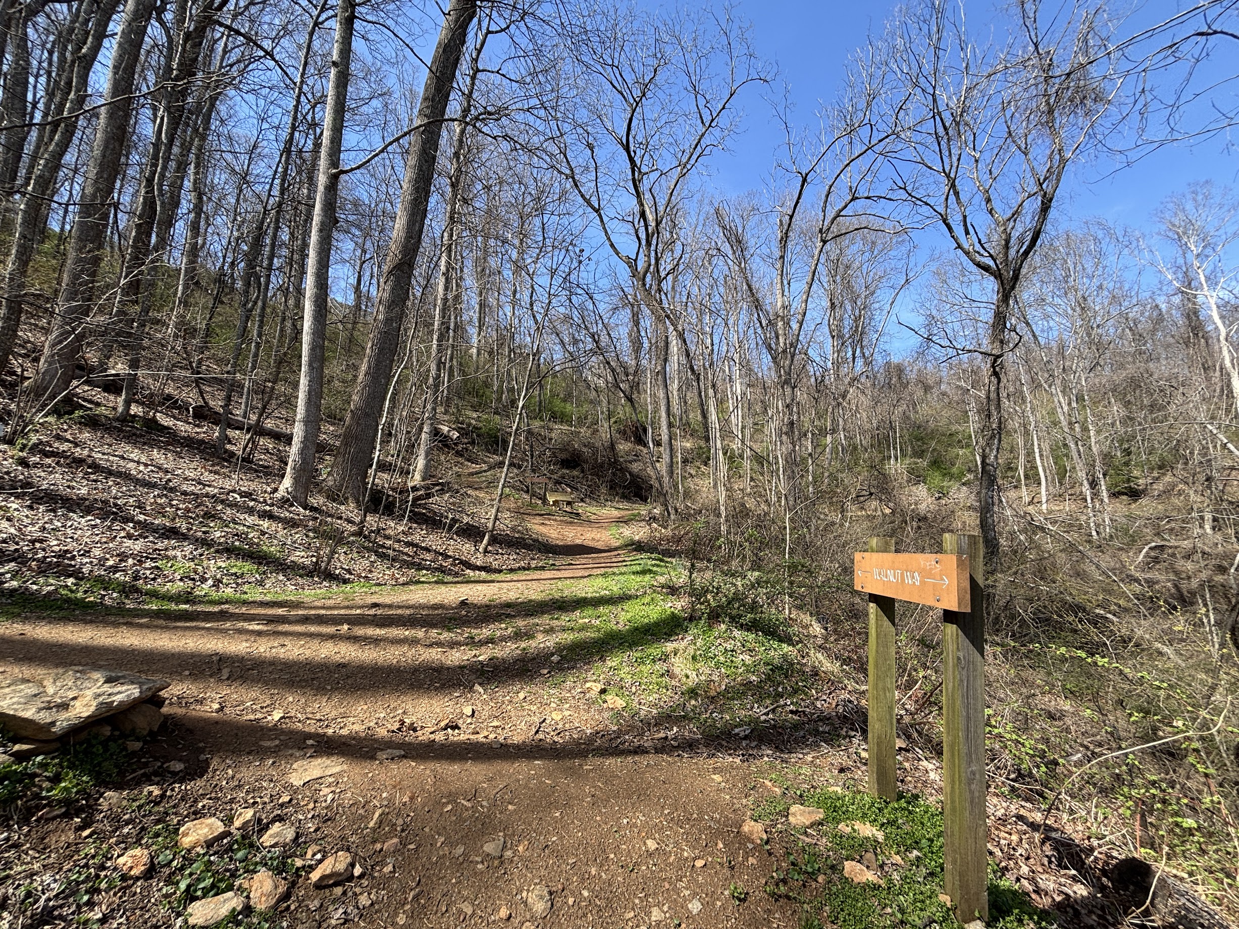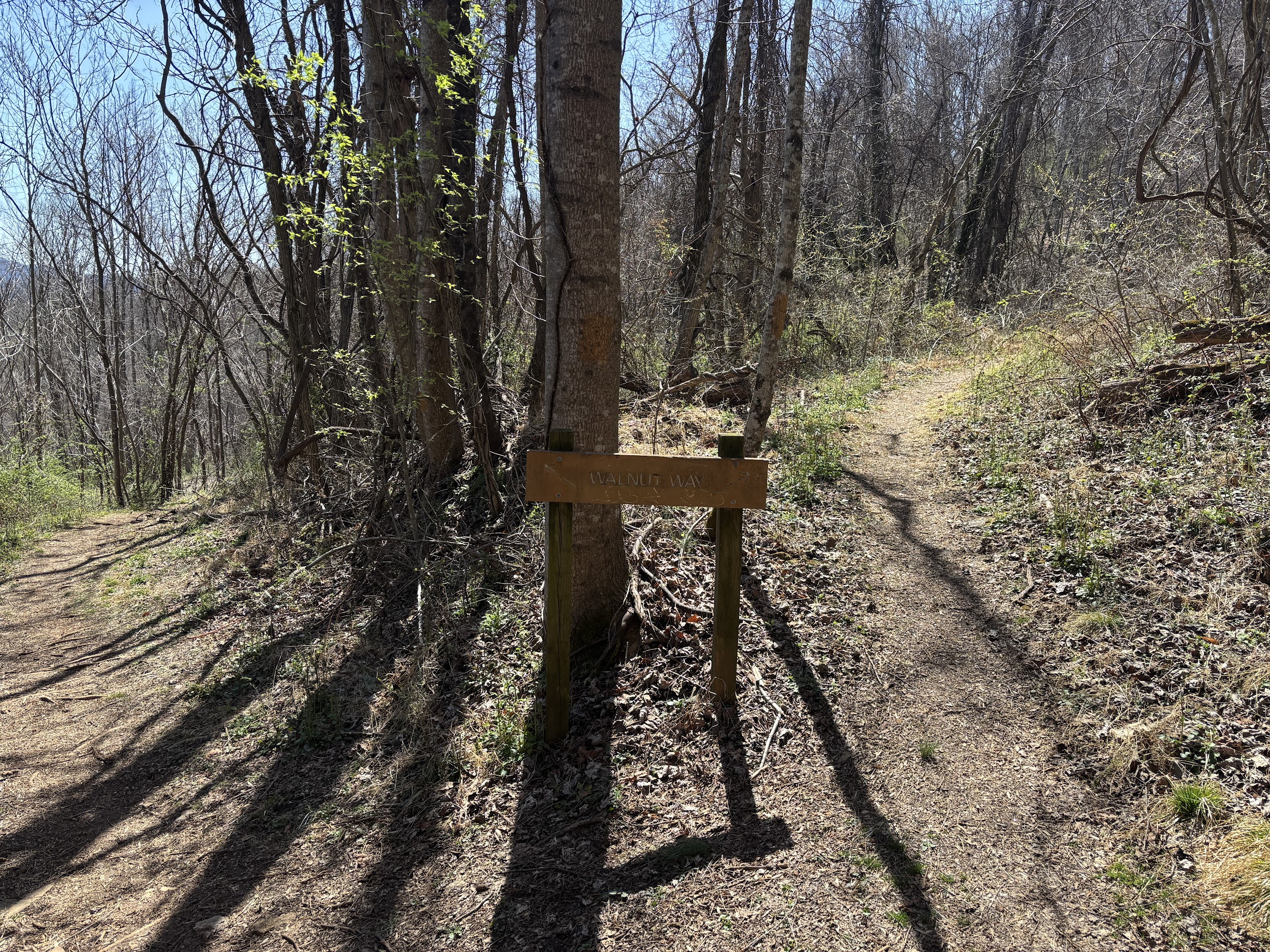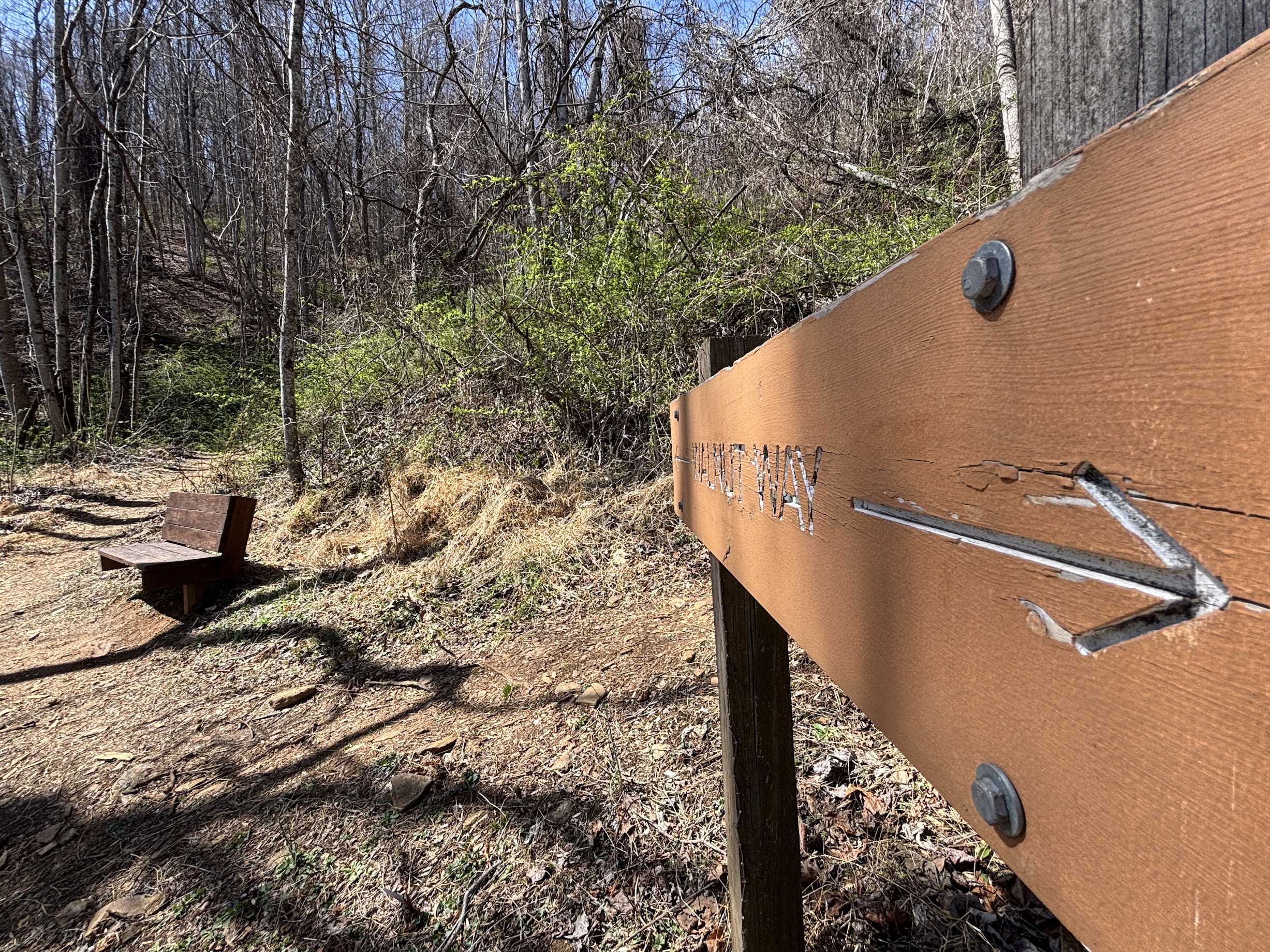 Check out the park rules on the kiosk to the far left of the parking lot, and then pick your poison. For my hike, I chose to trot along a primrose path, otherwise known as Walnut Way. There are numerous wooden signs indicating the direction of the trail, but head straight forward. After a short distance, you will be treated to a seat on a wooden bench – also prevalent, precious presences throughout the park – and a view of the mountains of Arden.