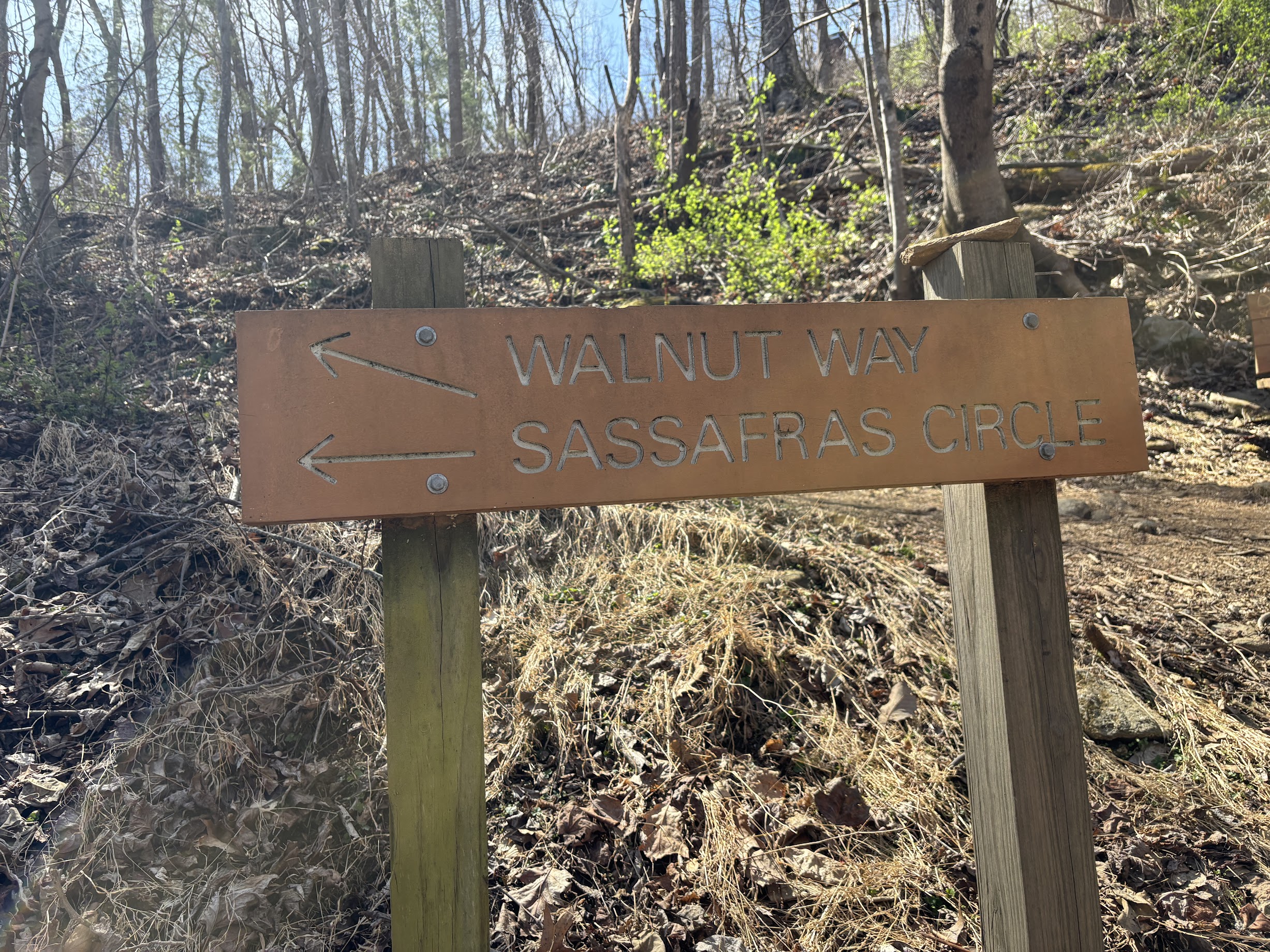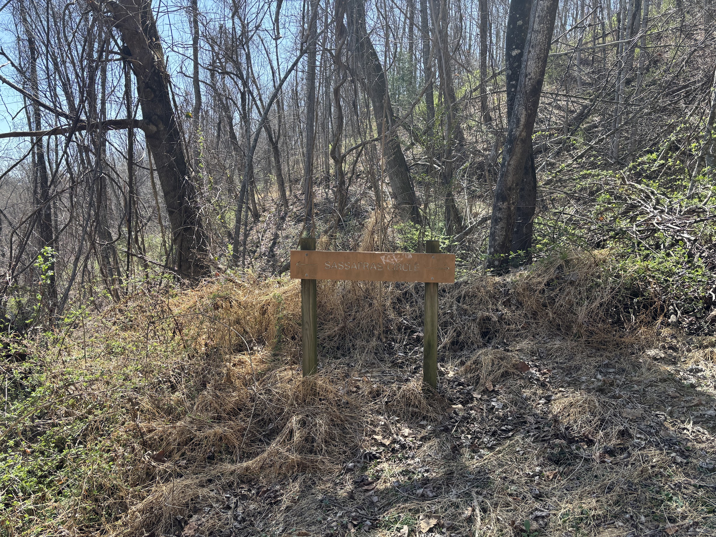 However, Walnut Way is not forever. At the bottom of the slope, the route intersects with Sassafras Circle. Attempts to hike to the right will be precluded by a trail closed sign, so head to the left around the meadow, instead. Sassafras Circle is marked with blue blazes.