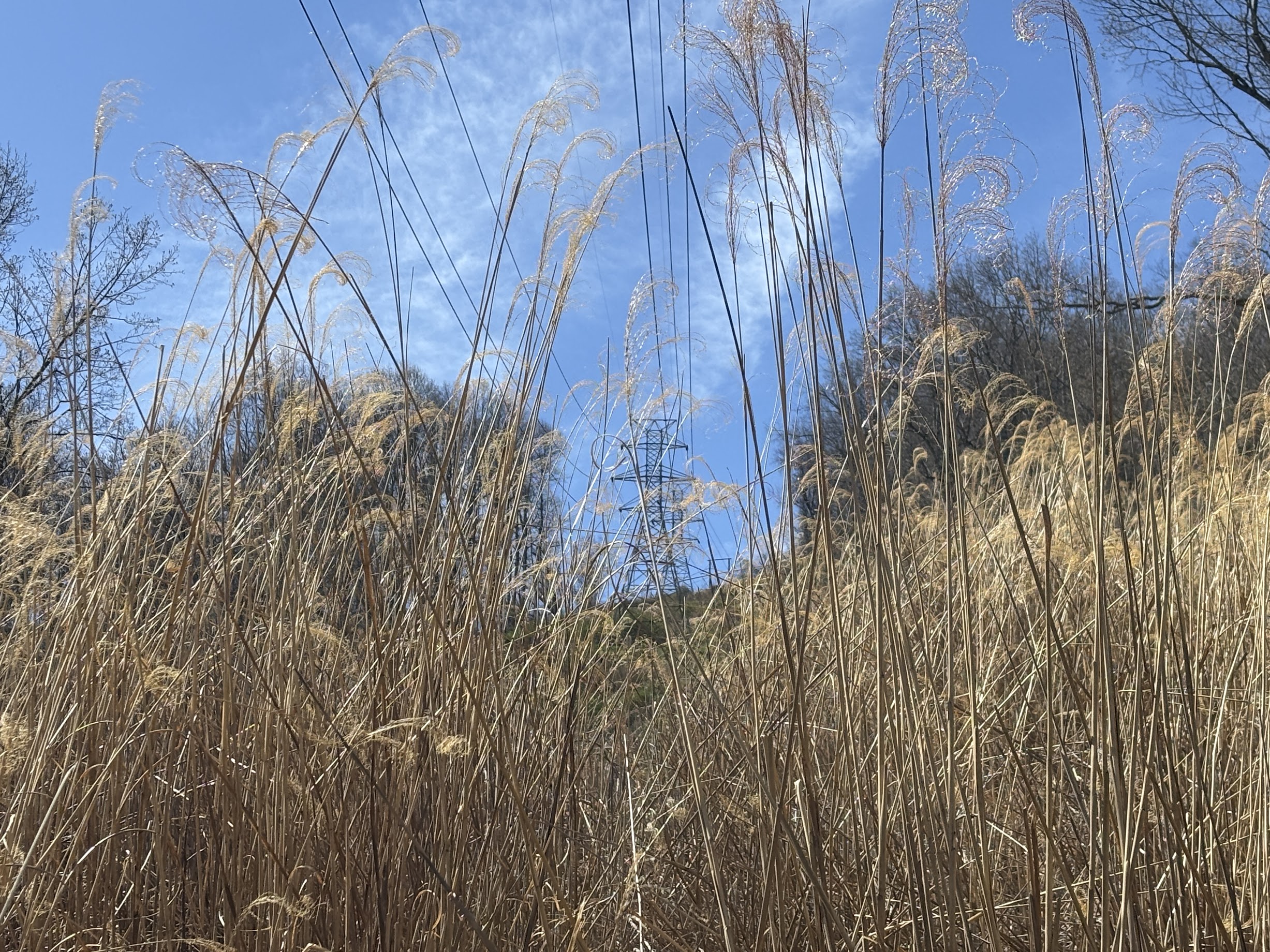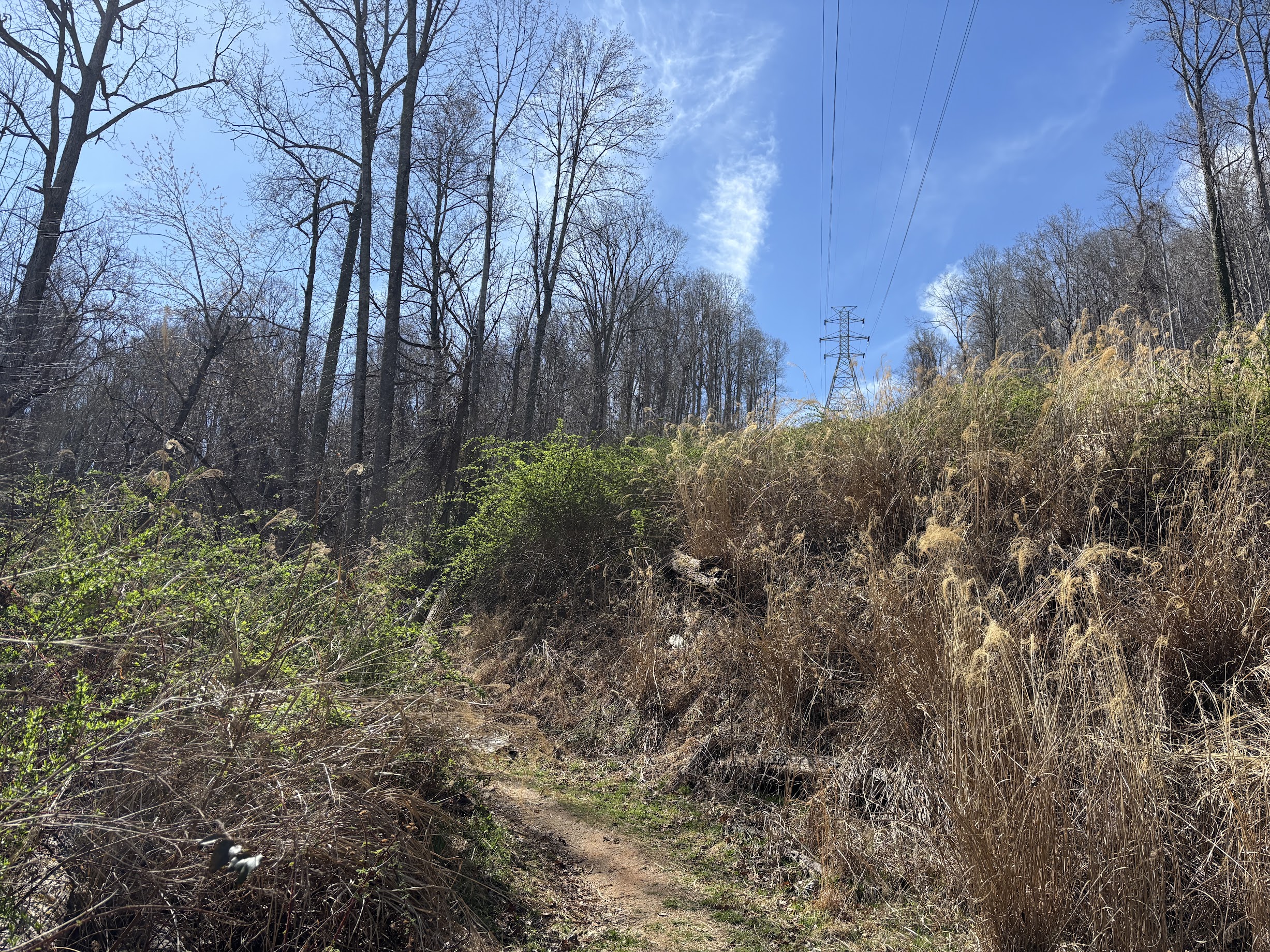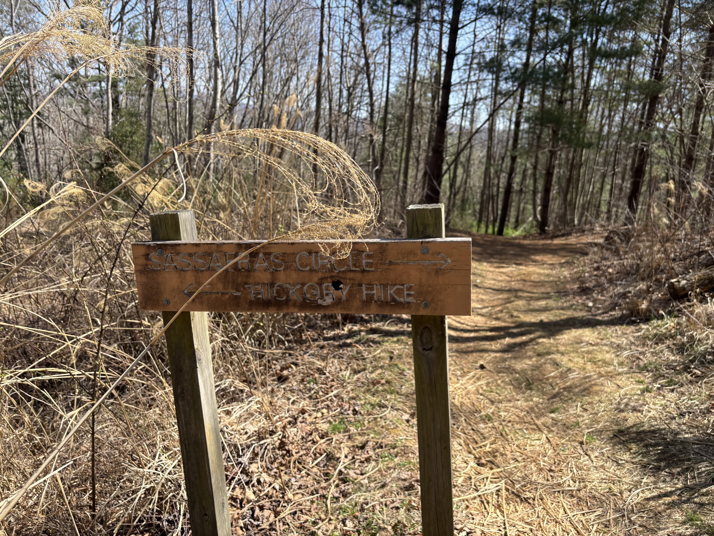 Eventually, Sassafras Circle will spit you out along the same electric line as the parking lot, which you can spot far away through the tall yellow grass. There is an option here to take a branch onto Hickory Hike, but that route exits to a different trailhead. To return to the parking lot, you must take the Herculean route of returning from Sassafras Circle to Walnut Way, which in turn leads back to the beginning.