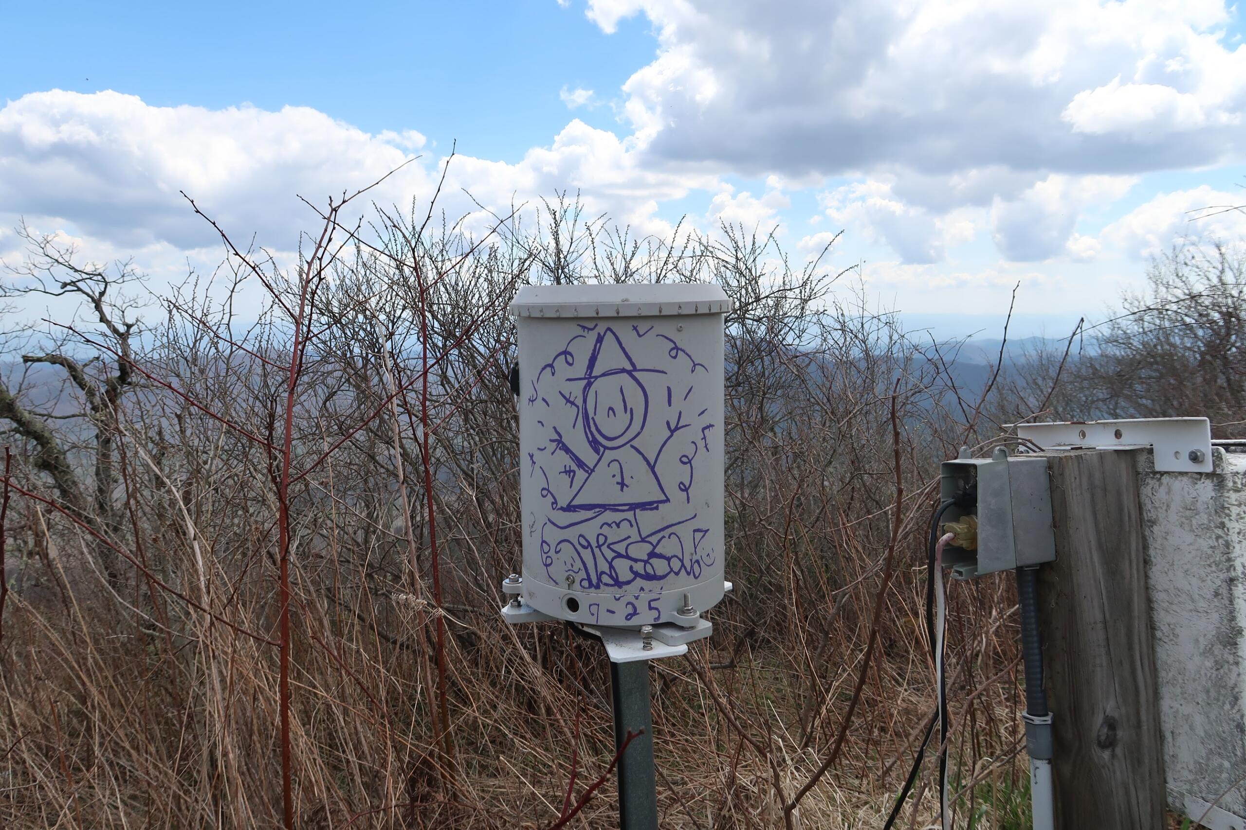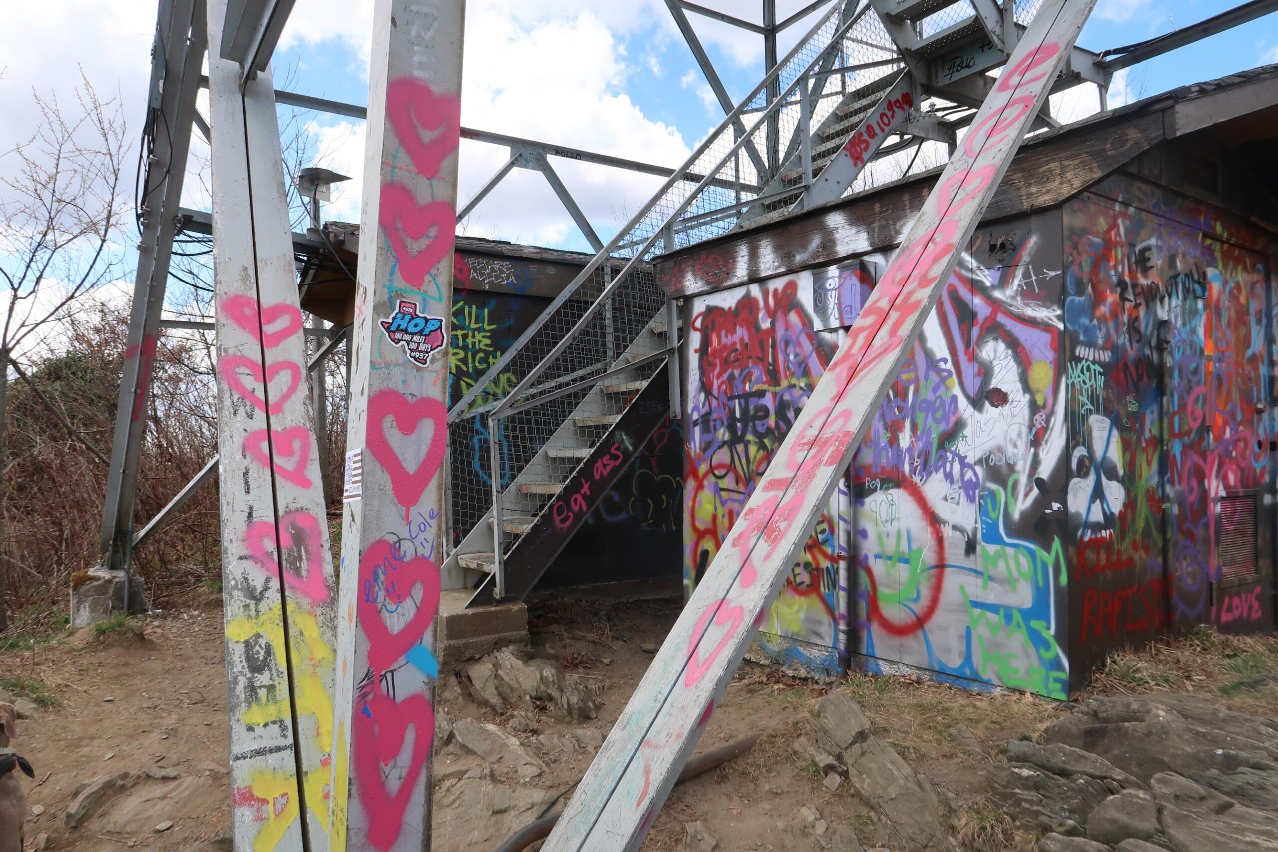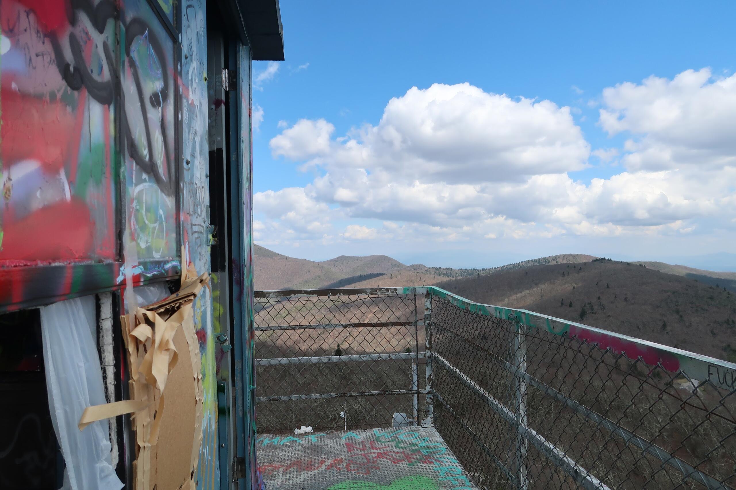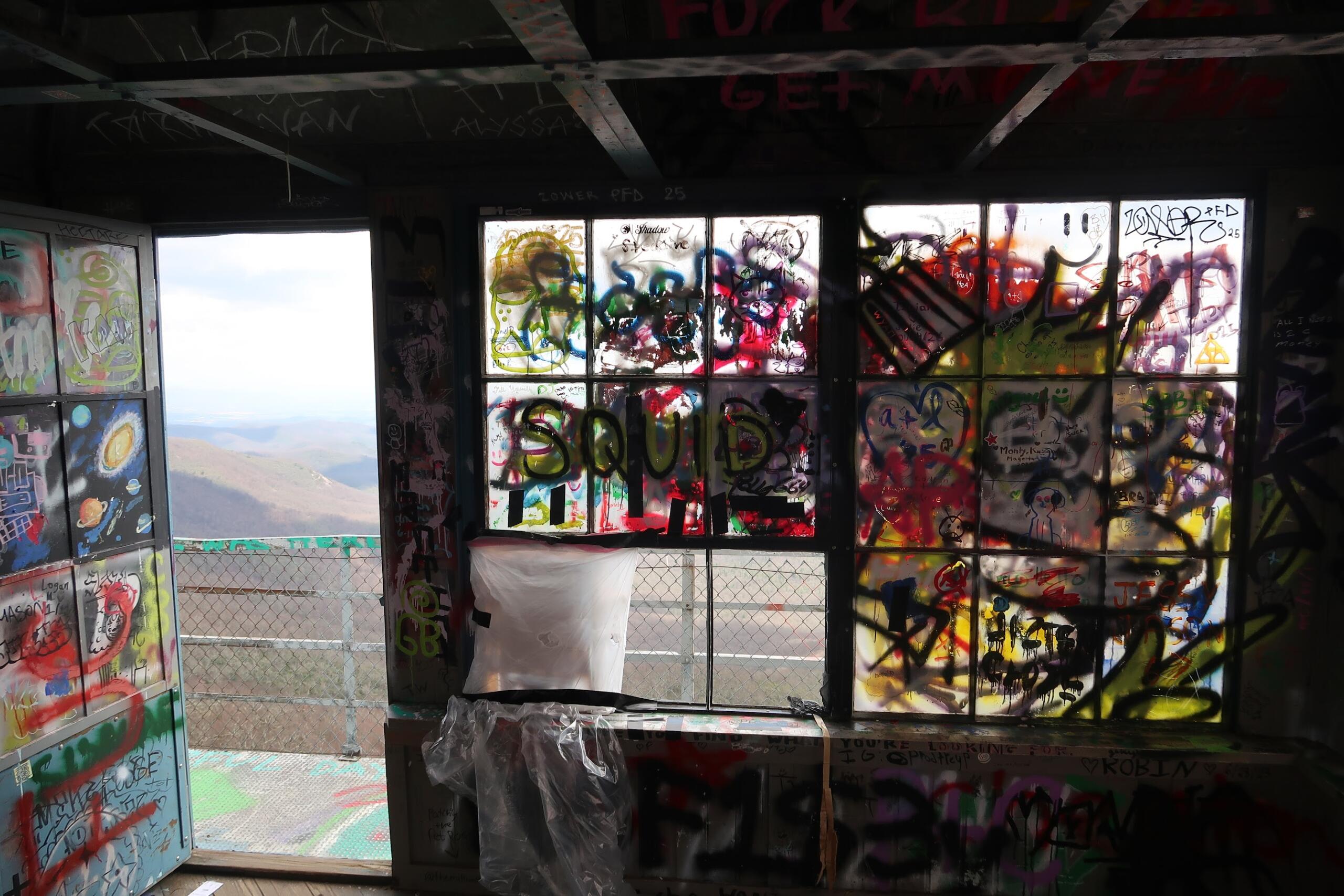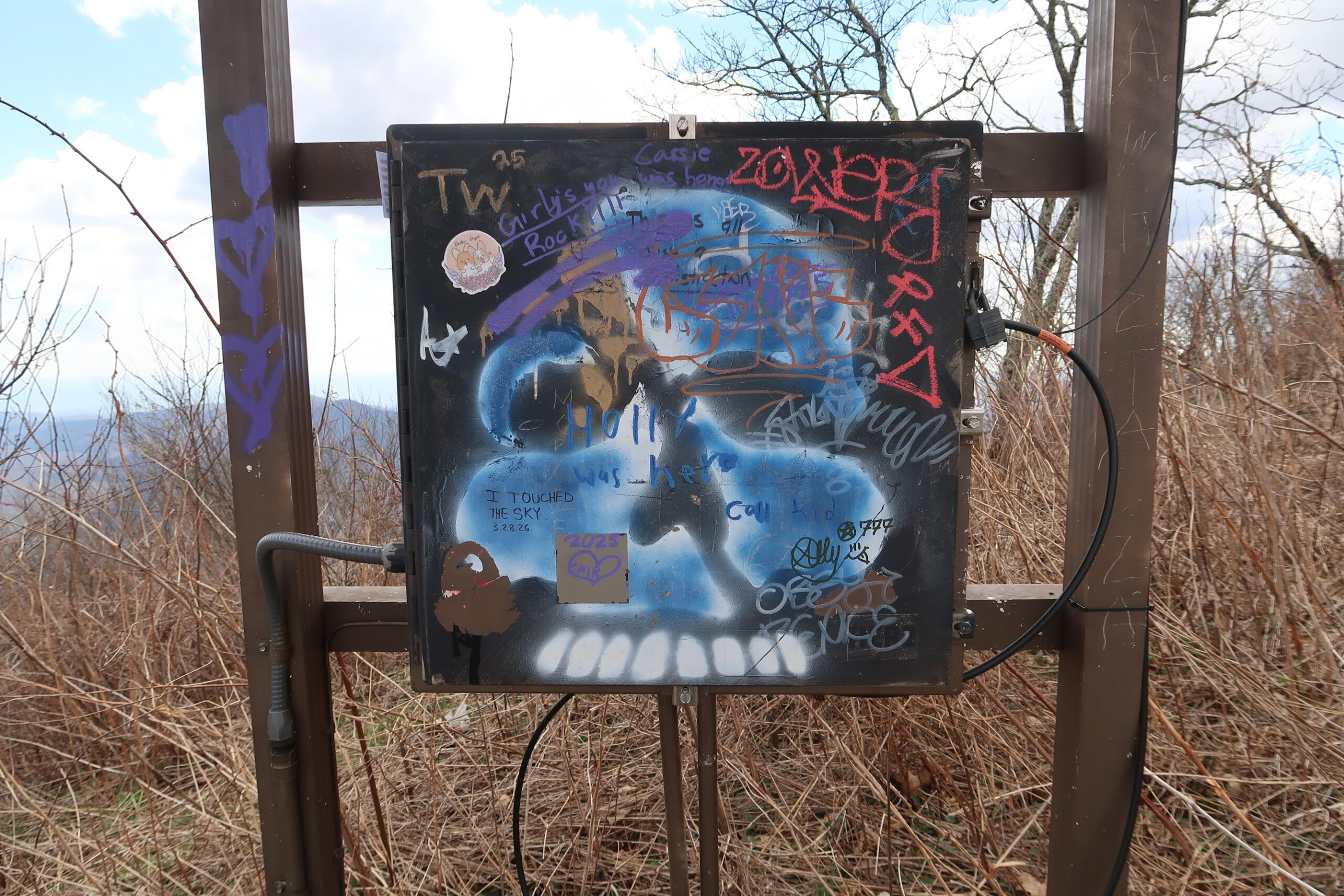 Fryingpan Mountain Lookout Tower could be considered a modern art museum as much as a Blue Ridge Parkway hiking staple. The base of the tower and its accompanying electrical sheds are covered with colorful graffiti, from contemporary additions like “RIP Chuck Norris” and “67 67 67 67” to tags a year or older.