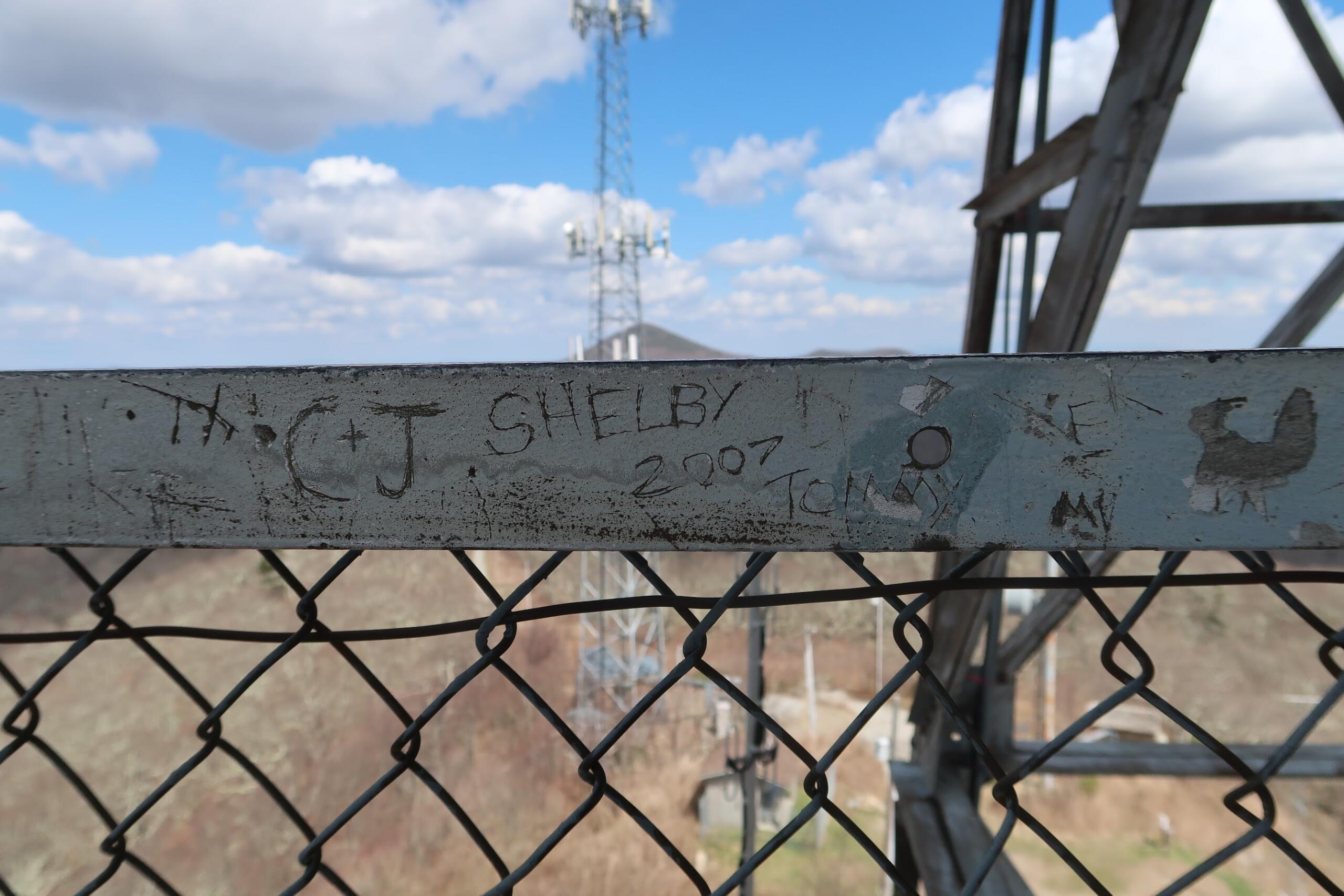 Today, the structure shows its age, particularly during the wobbly way up. To be fully candid, I had to take a couple of stabilizing deep breaths near the end of my ascent, and I was white-knuckling the railings the entire time. Climbing Fryingpan Mountain Lookout Tower is not for the faint of heart. However, the bravery involved in the climb hasn’t stopped the tower from being a popular destination for hikers for at least two decades. Scratches in the paint of the tower staircase sport dedications like “SHELBY TOMMY 2007.”
