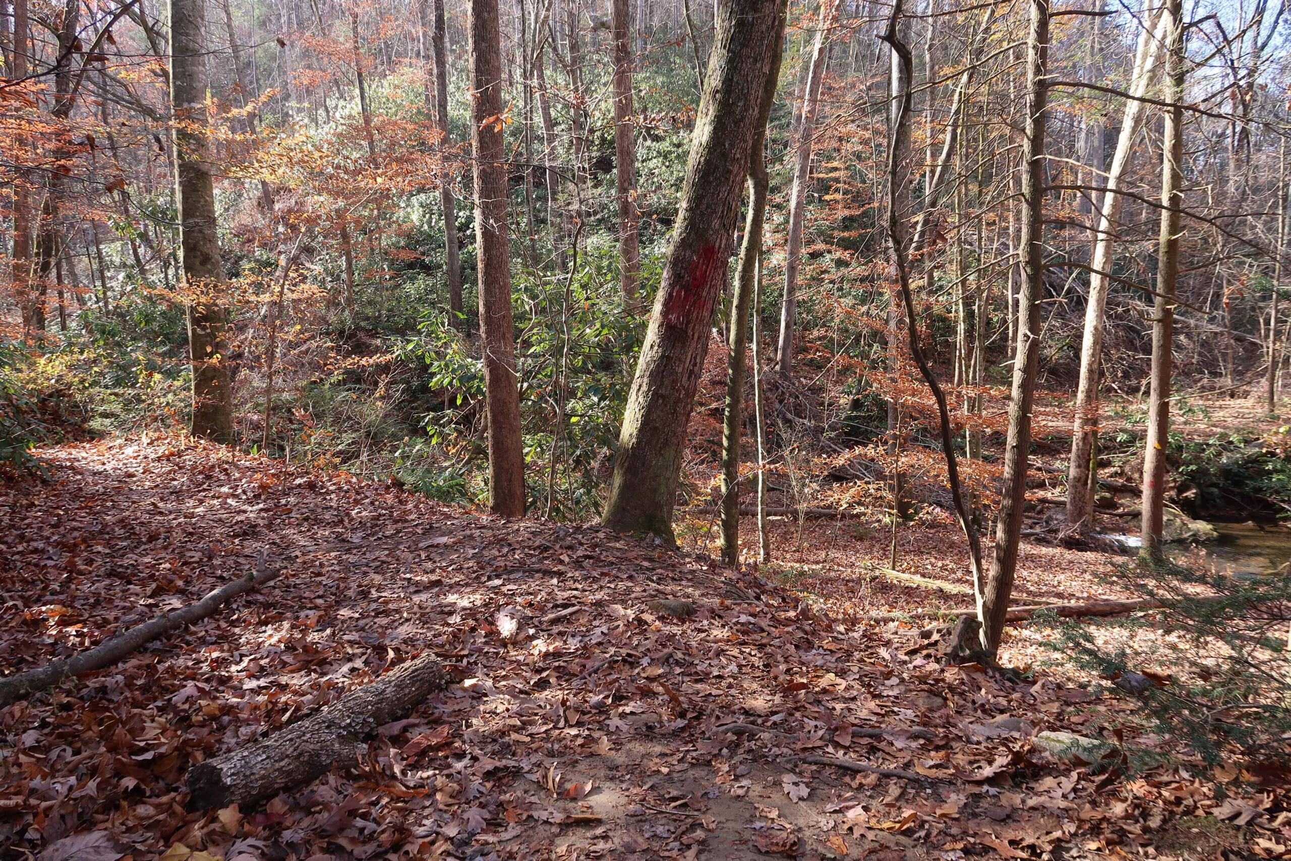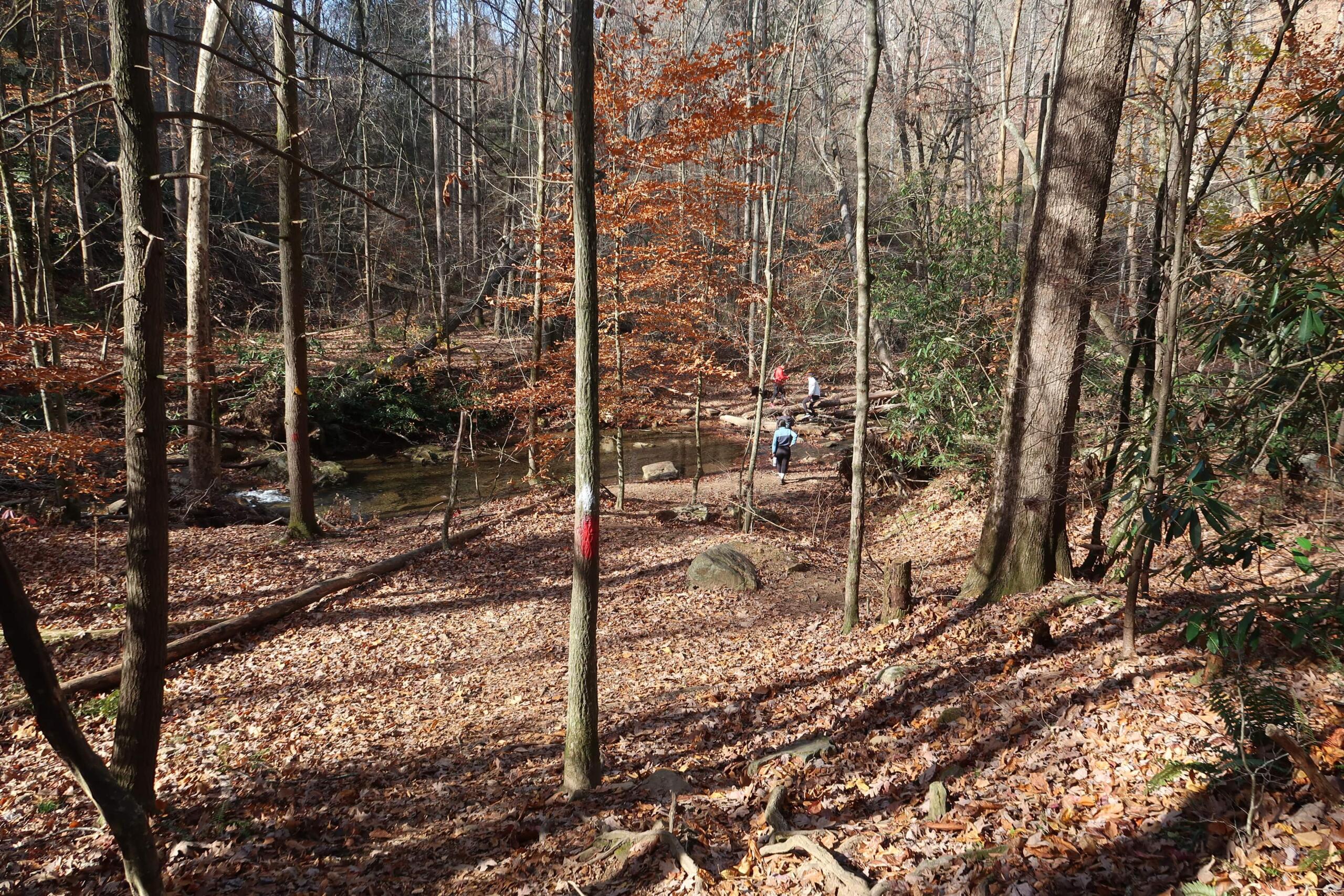 Watch carefully for the red blazes. The first of the Cove Creek crossings will take place to the right of the trail, leading hikers down a leafy slope to carefully make their way across the stream. For those who want to avoid the chance of falling in, a sturdy tree trunk has fallen over the creek, ready to be shimmied over.