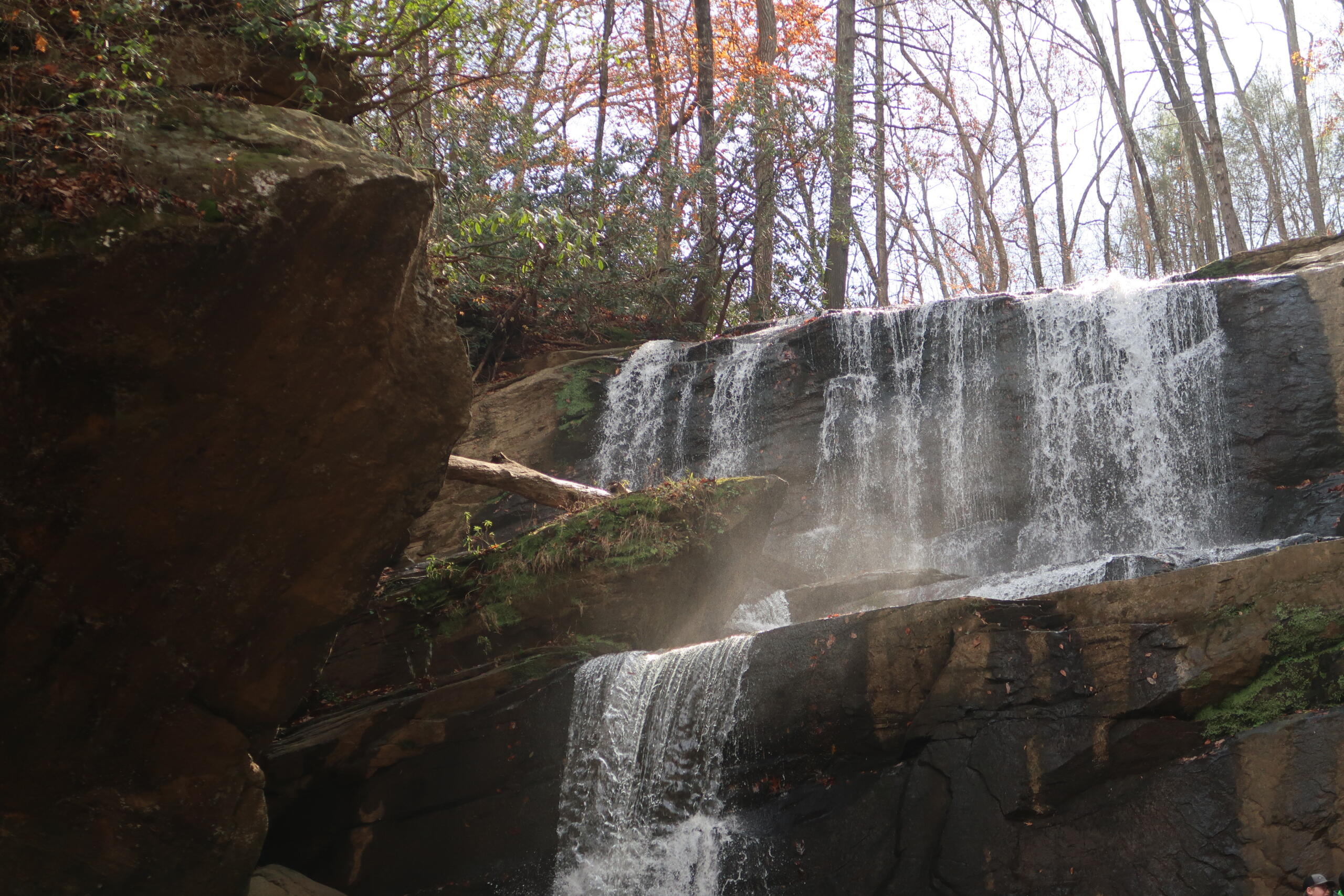 After navigating the rocks, it’s just a short distance to the waterfall. Fallen trees have made a kind of autumnal tunnel along one section of the trail, with branches still sporting red and yellow leaves for light fixtures.