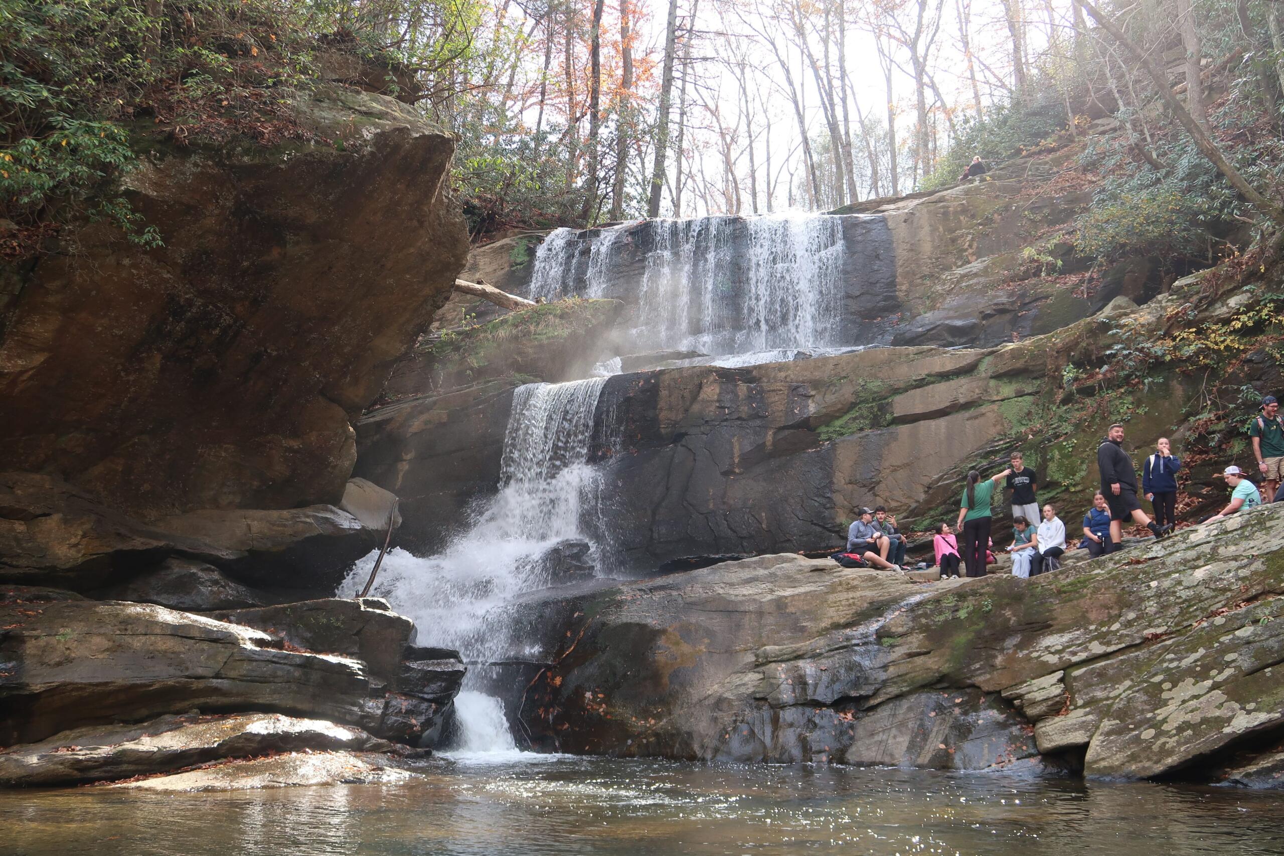The waterfall itself can be heard from here. The falls have a large, clear pool at the bottom and several seating options at different levels. Make your way up the trail to the right of the falls to access them.