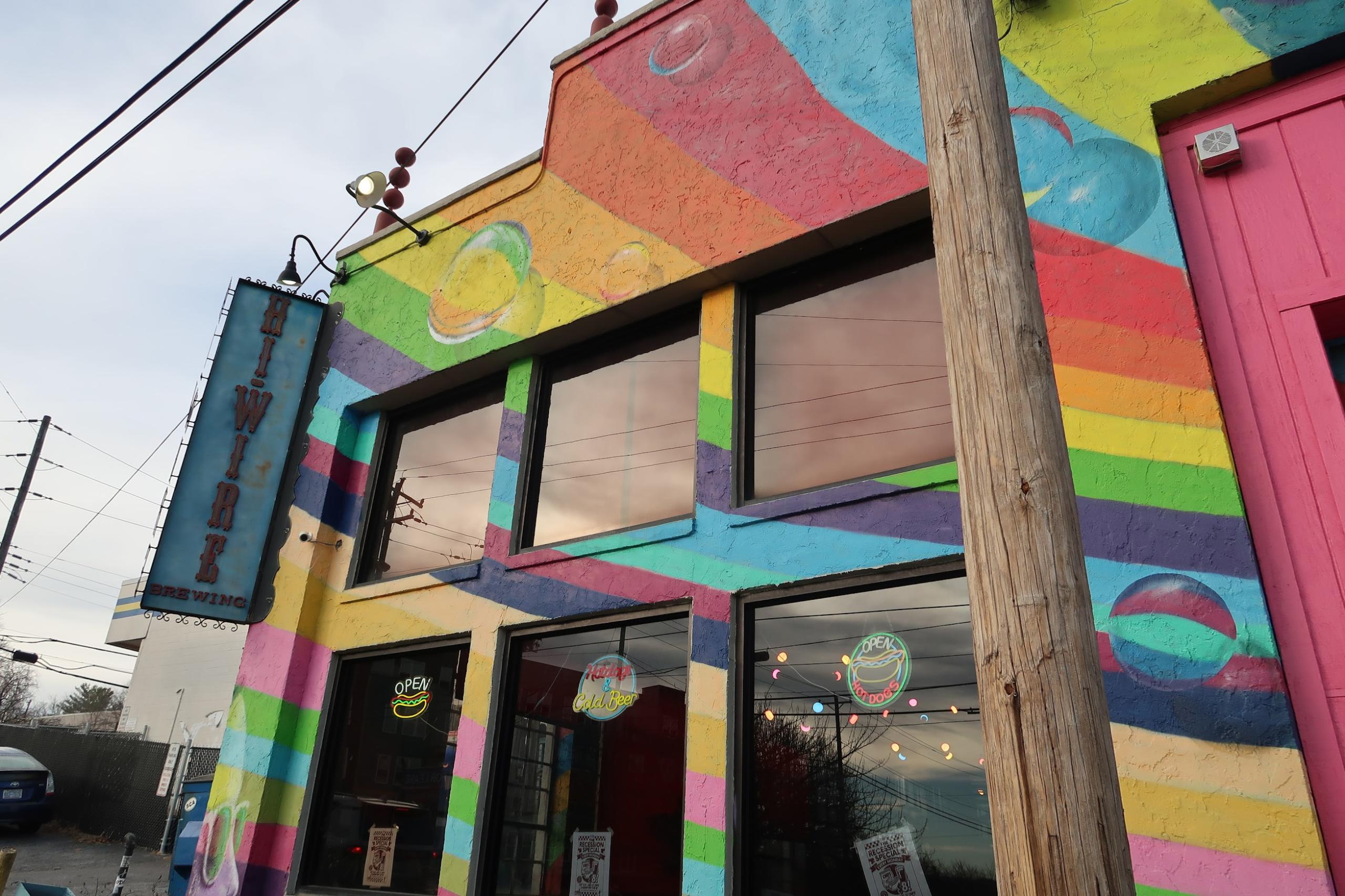 Next, walk downhill toward Hilliard Avenue. Take a right at the Hilliard intersection and head up for a brief diversion at Hi-Wire Brewing, 197 Hilliard Ave. The building is painted in multicolored rainbow splendor.
