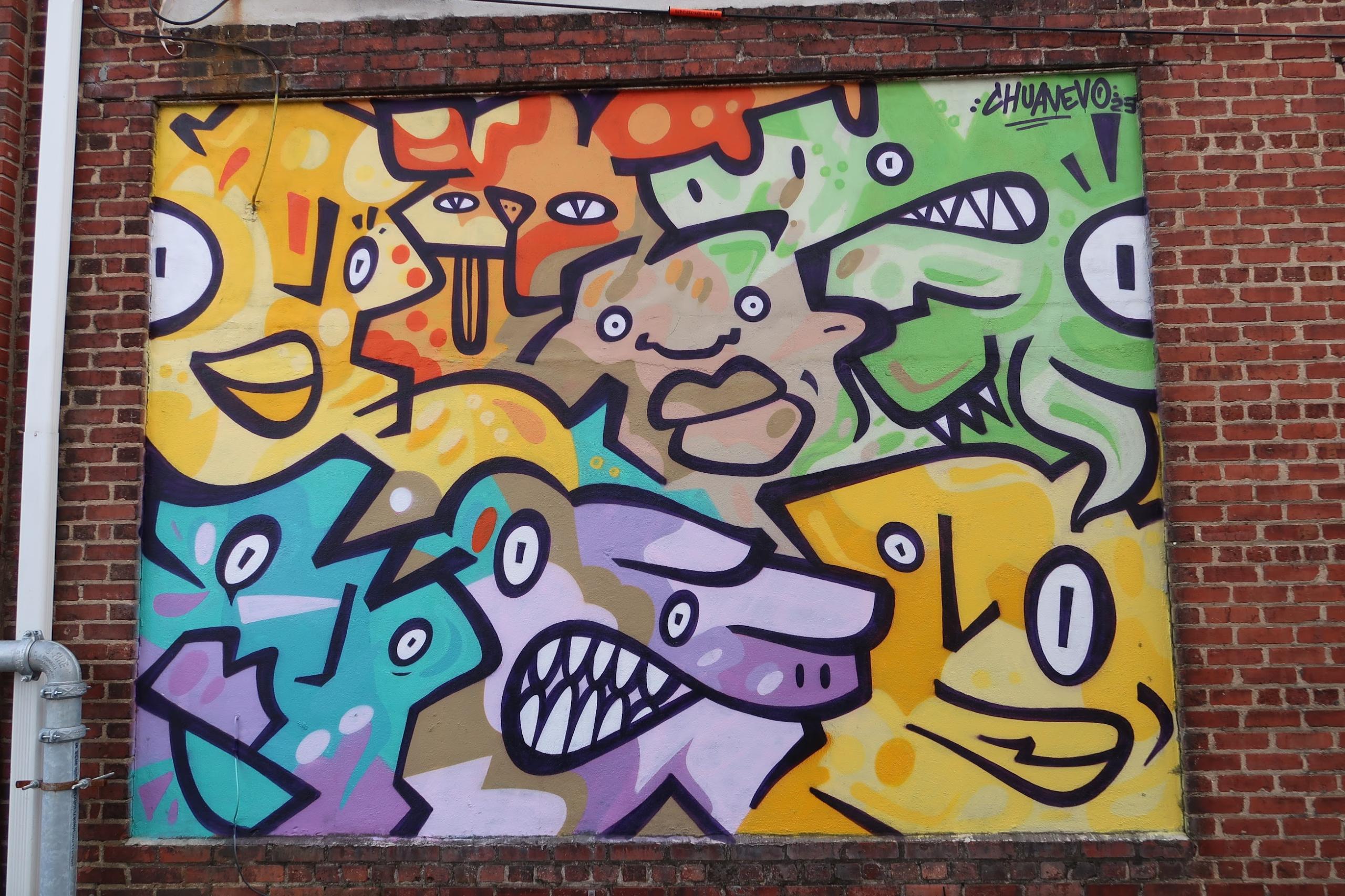 Several secret murals on the trail can be found in the alley between Open Hearts and “Bower Power.” One, my personal favorite, is made up of colorful faces by CHUAVEVO, squished together to fill a fun, silly frame.