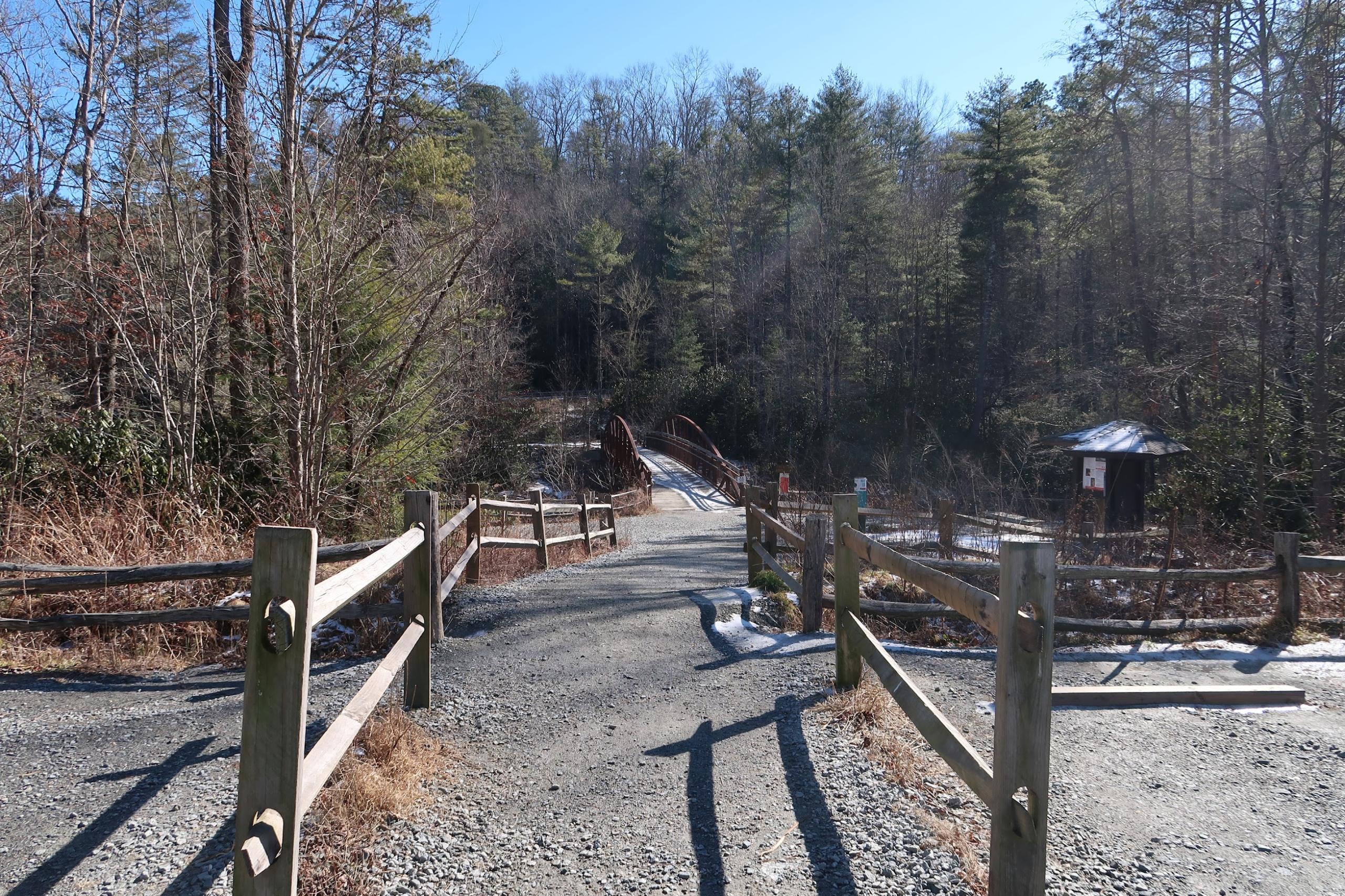 After pulling into DuPont State Recreational Forest, you will want to take a right turn off Staton Road toward the signs marked for Hooker Falls and Triple Falls access. Drive through to the back parking lot for Triple Falls. You should find a spot in the gravel lot, cordoned off by a host of wooden fences. After parking, head down toward the bridge.