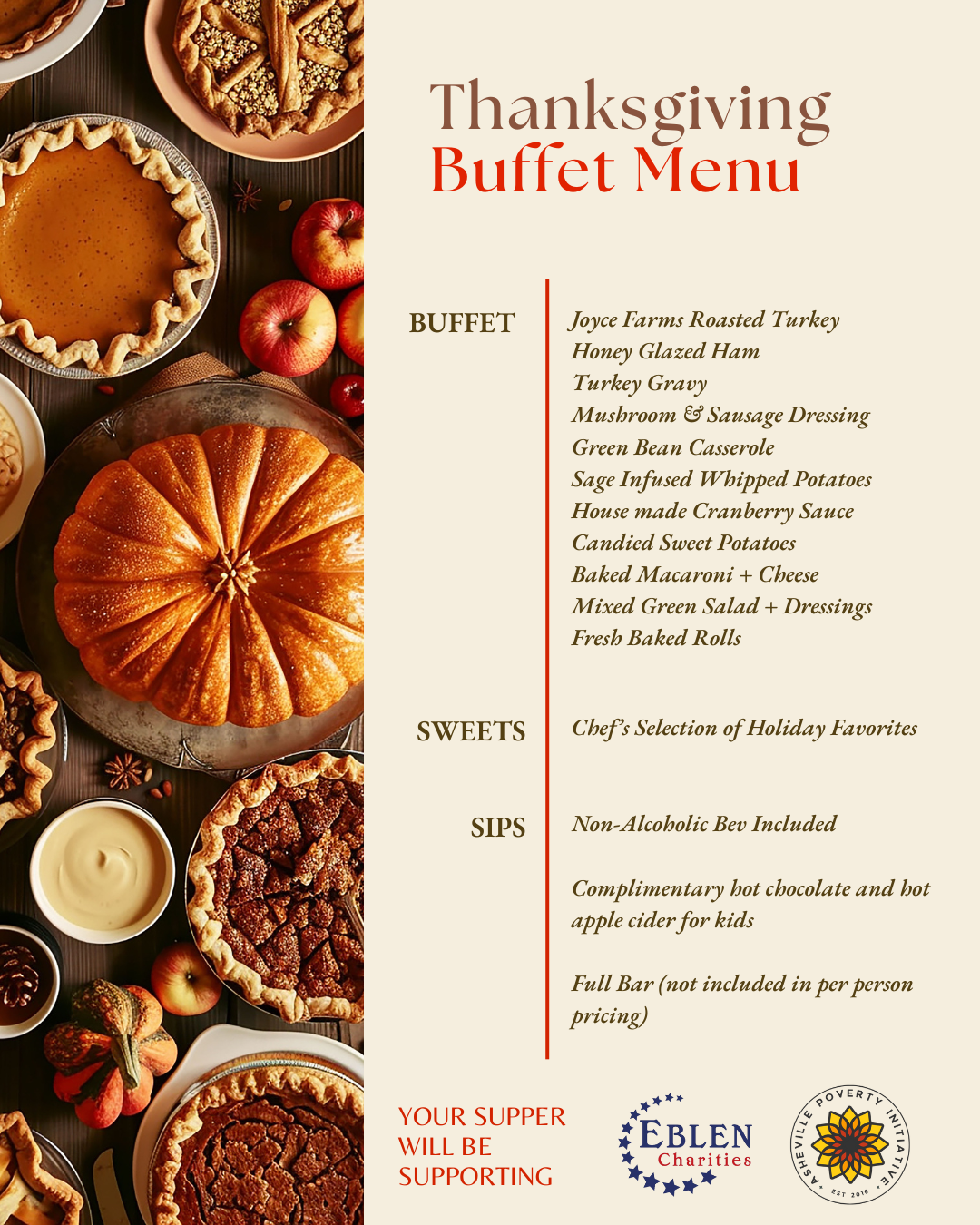 ASHEVILLE, N.C. (828newsNOW) — Next month, Embassy Suites by Hilton Asheville Downtown will host a Thanksgiving Buffet charity benefit. The community is invited to partake in a meal to benefit Eblen Charities and 12 Baskets Café.