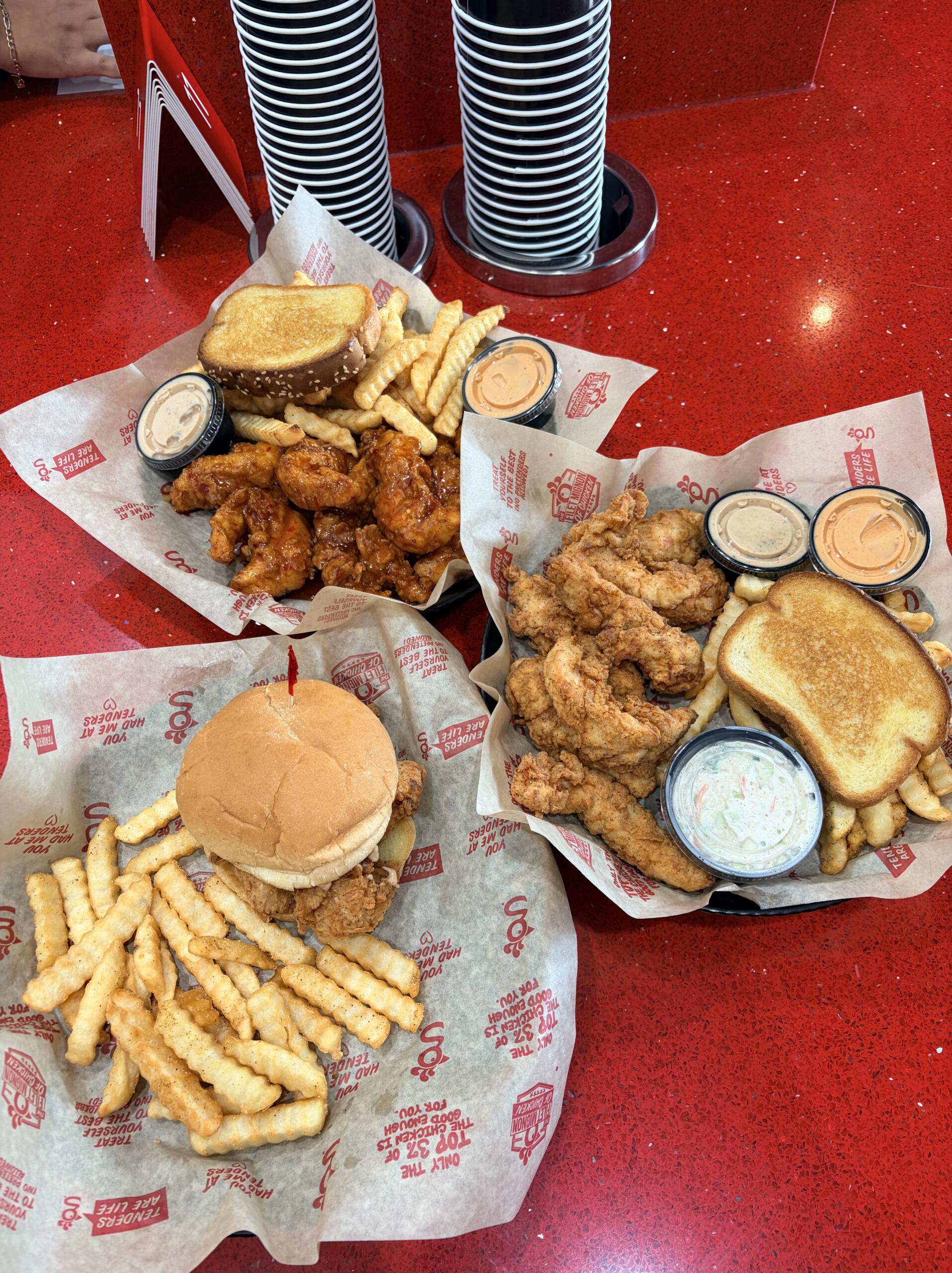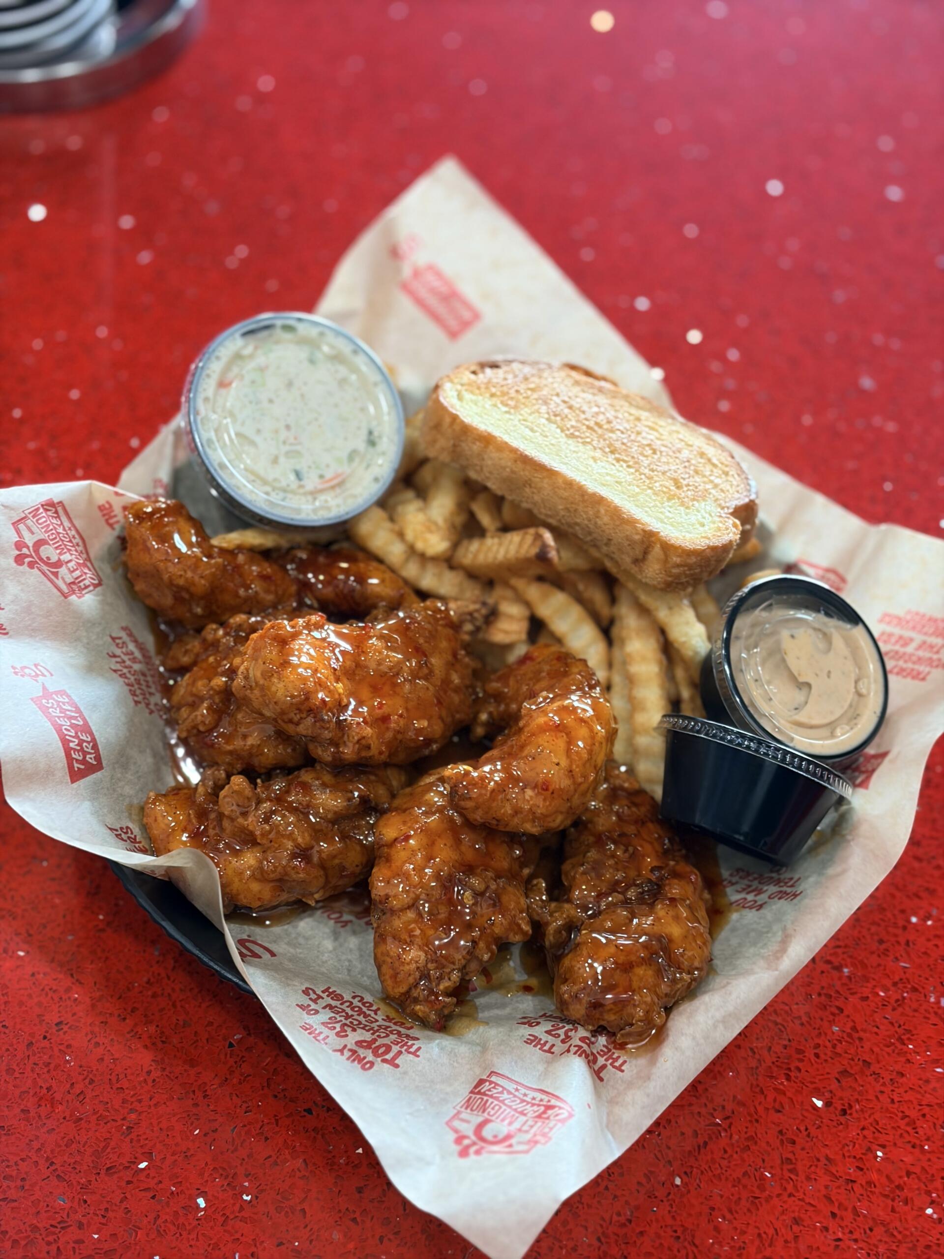 Huey Magoo’s specializes in chicken tender meals made from the top 3 percent of the chicken — the tenderloin — which are hand-breaded, 24-hour marinated and available grilled or tossed in a variety of sauces, including buffalo, sweet red chili, lemon pepper and garlic parmesan. The menu also features salads, sandwiches, wraps, hand-spun chips, coleslaw, banana pudding and house-made dips.