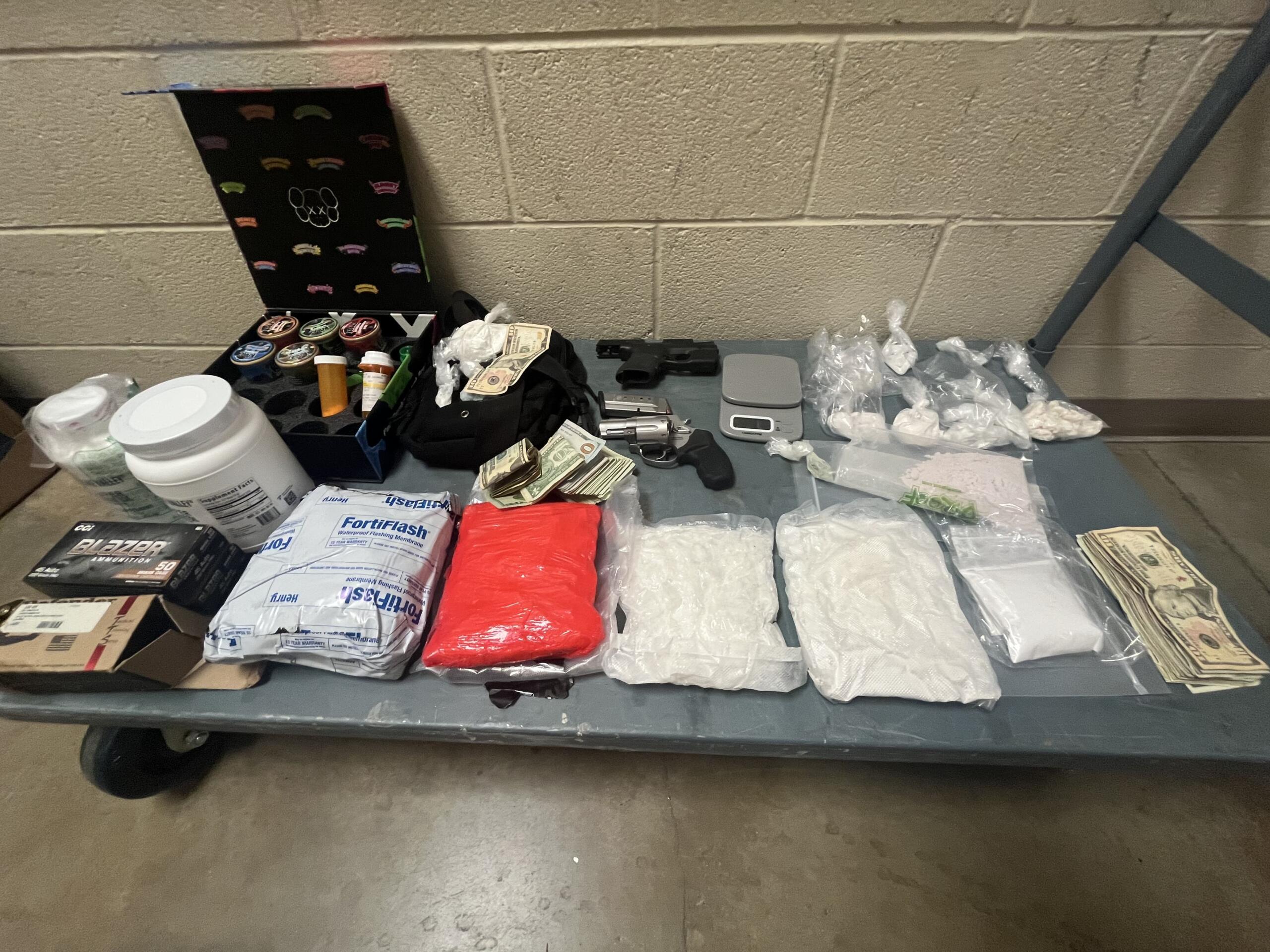 Among the substances seized were nearly 23 grams of blue pills, which authorities suspect to be pressed fentanyl.