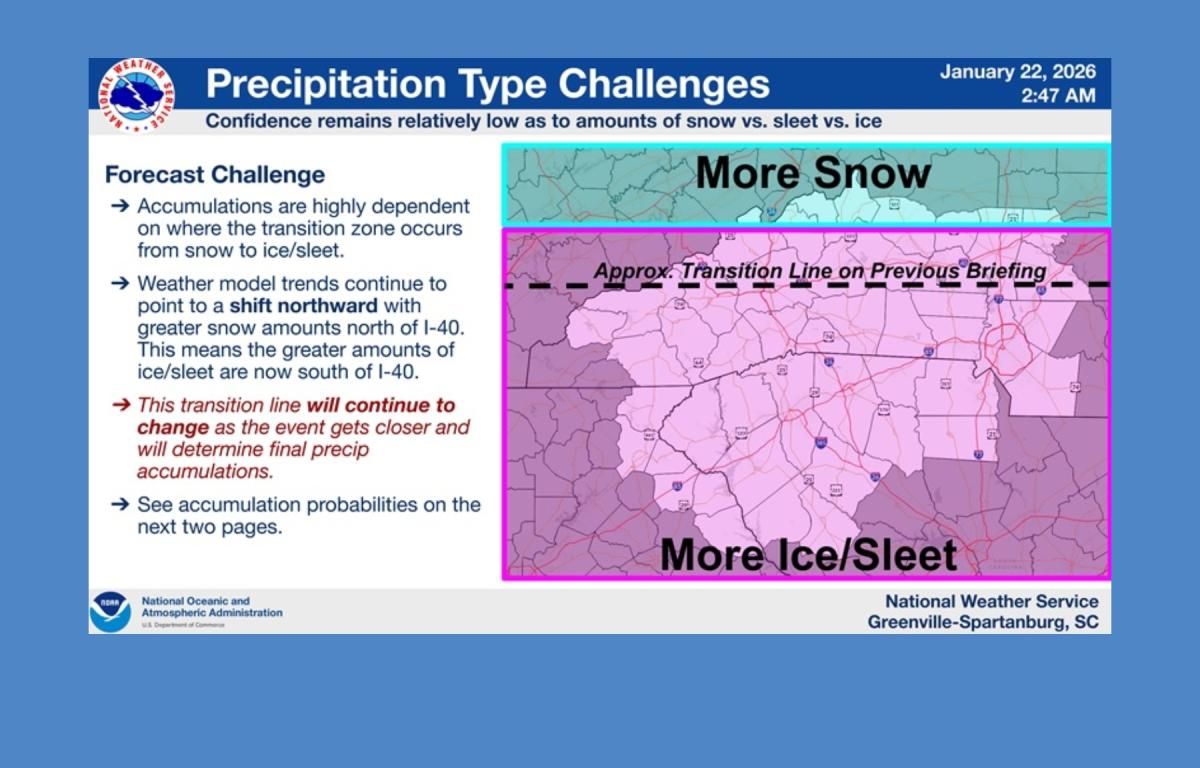 Forecasters said recent model updates show higher snow chances shifting north of Interstate 40, while the threat of ice and sleet has increased for the Asheville area and surrounding mountains. Heavy mixed precipitation is expected to create hazardous travel conditions and could lead to widespread power outages lasting several days.