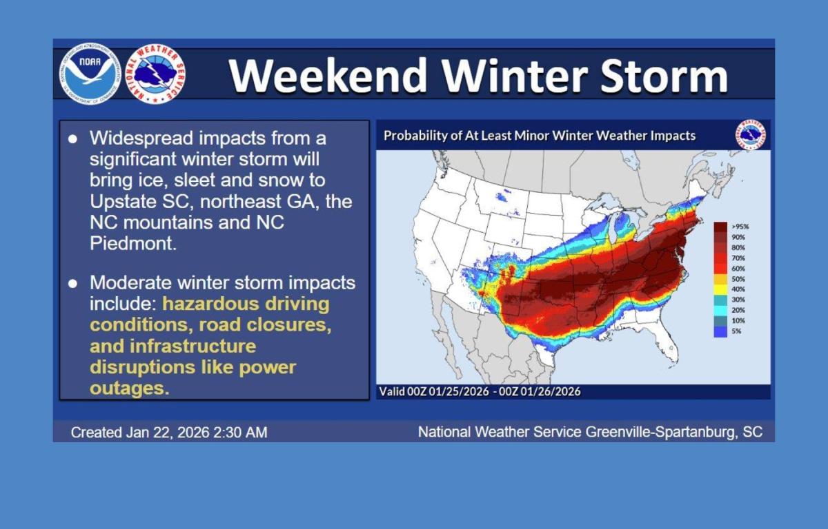 Forecaster say each new model run is adding confidence in a high-impact, long-duration ice event, particularly across WNC and areas farther south into Georgia and South Carolina. Impacts could begin as early as midday Saturday and persist through Sunday.