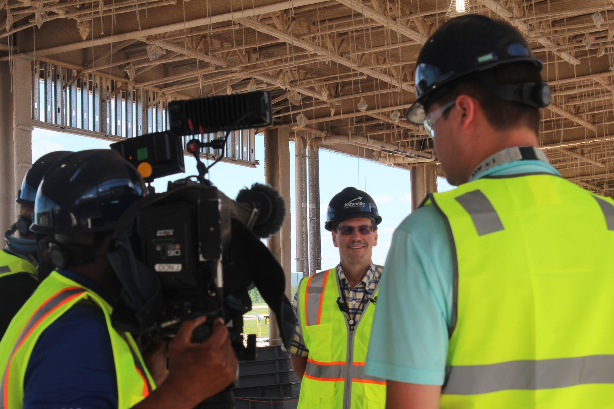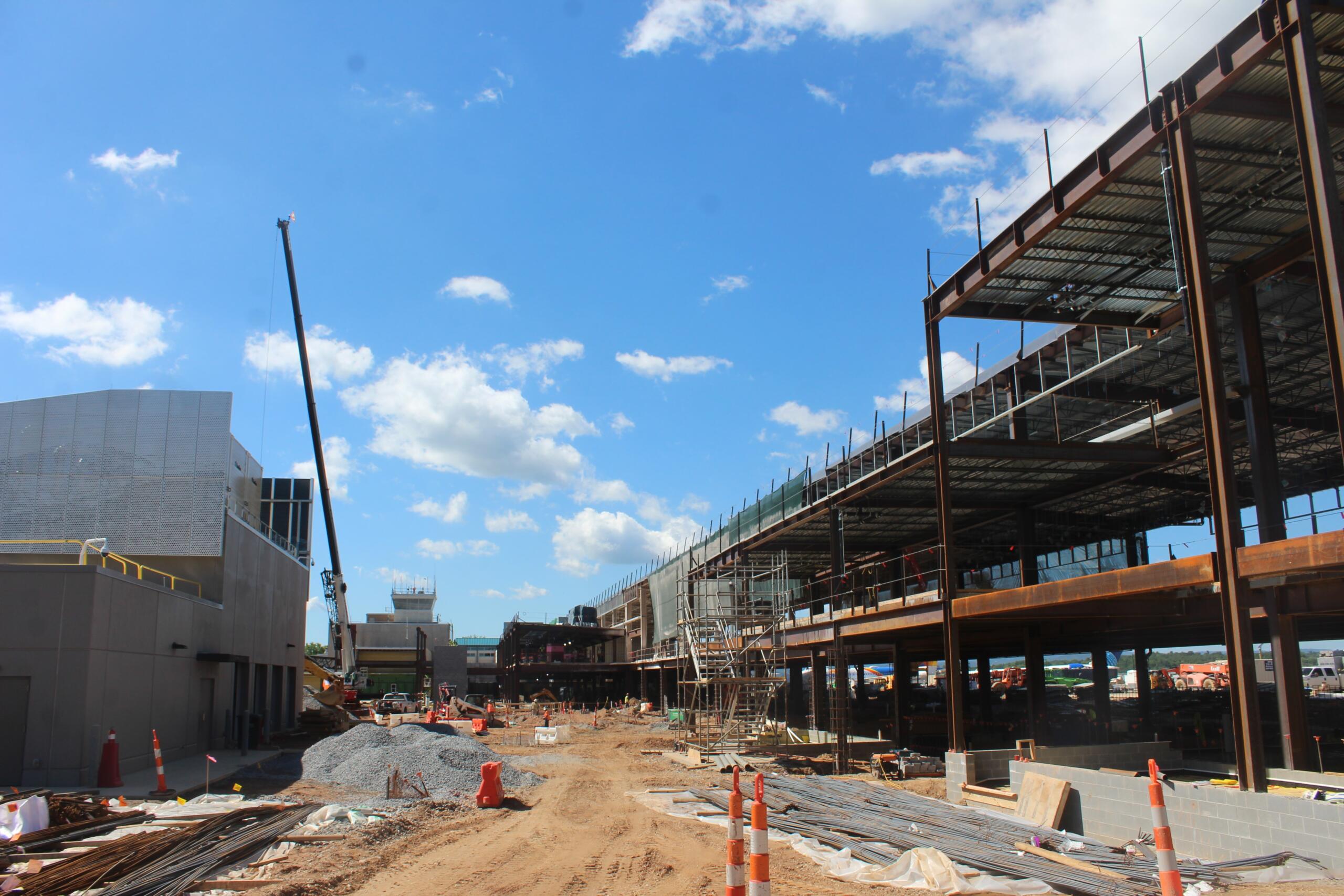 From the spot upstairs in the hard hat zone, reporters could look through the girders — where the windows soon will be — and see passengers queuing up for flight after flight. After flight. These days, about 35 to 40 flights per day take off and land at the airport, spokesperson Tina Kinsey says.