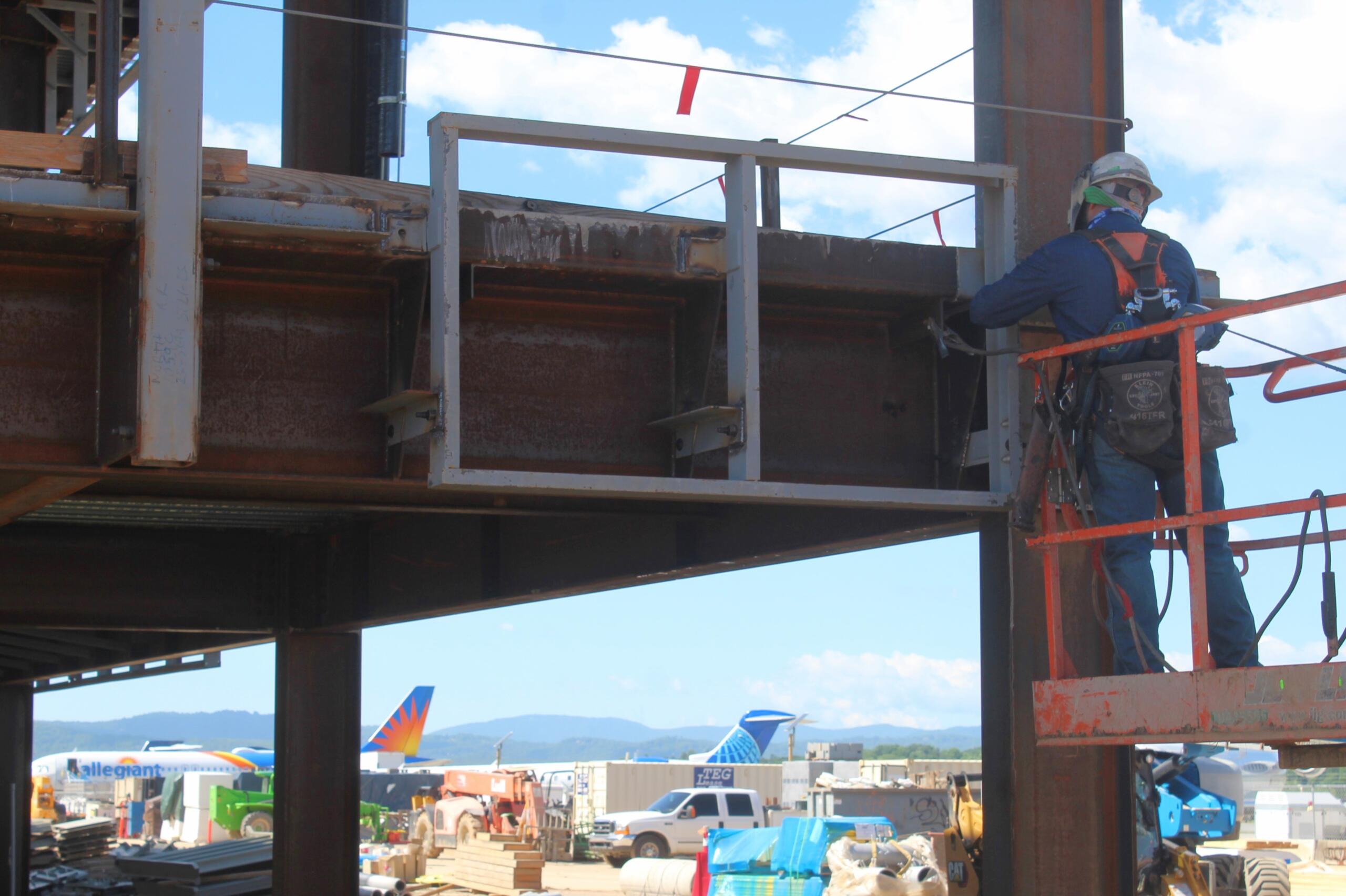 On Friday, contractors were busy preparing concrete in one area, working on girders in another, completing cinderblock walls on the runway side — all while commercial airliners were taking off and landing on the adjacent runways.