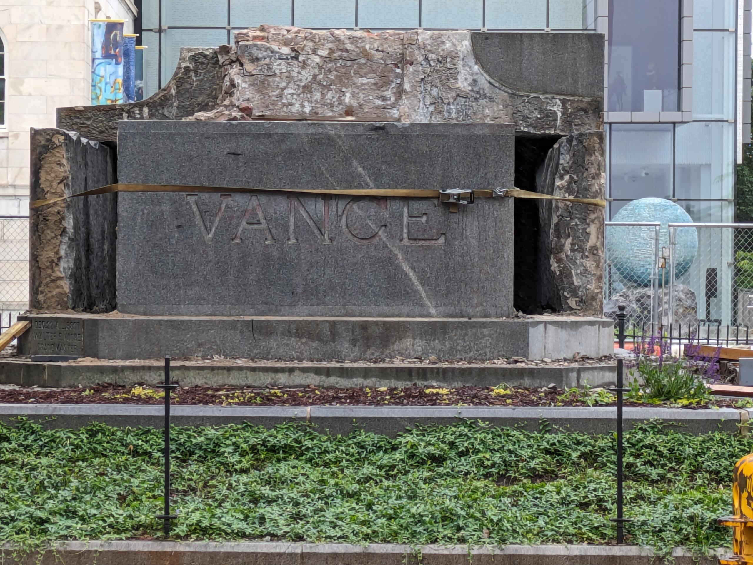 At least one slab was left free-standing on the north side facade, with a gap to the core of the base. Meanwhile, several heavy stone cap and corner pieces were removed and set aside. Some remained, but their removal could expedite the removal of the “VANCE” name altogether.