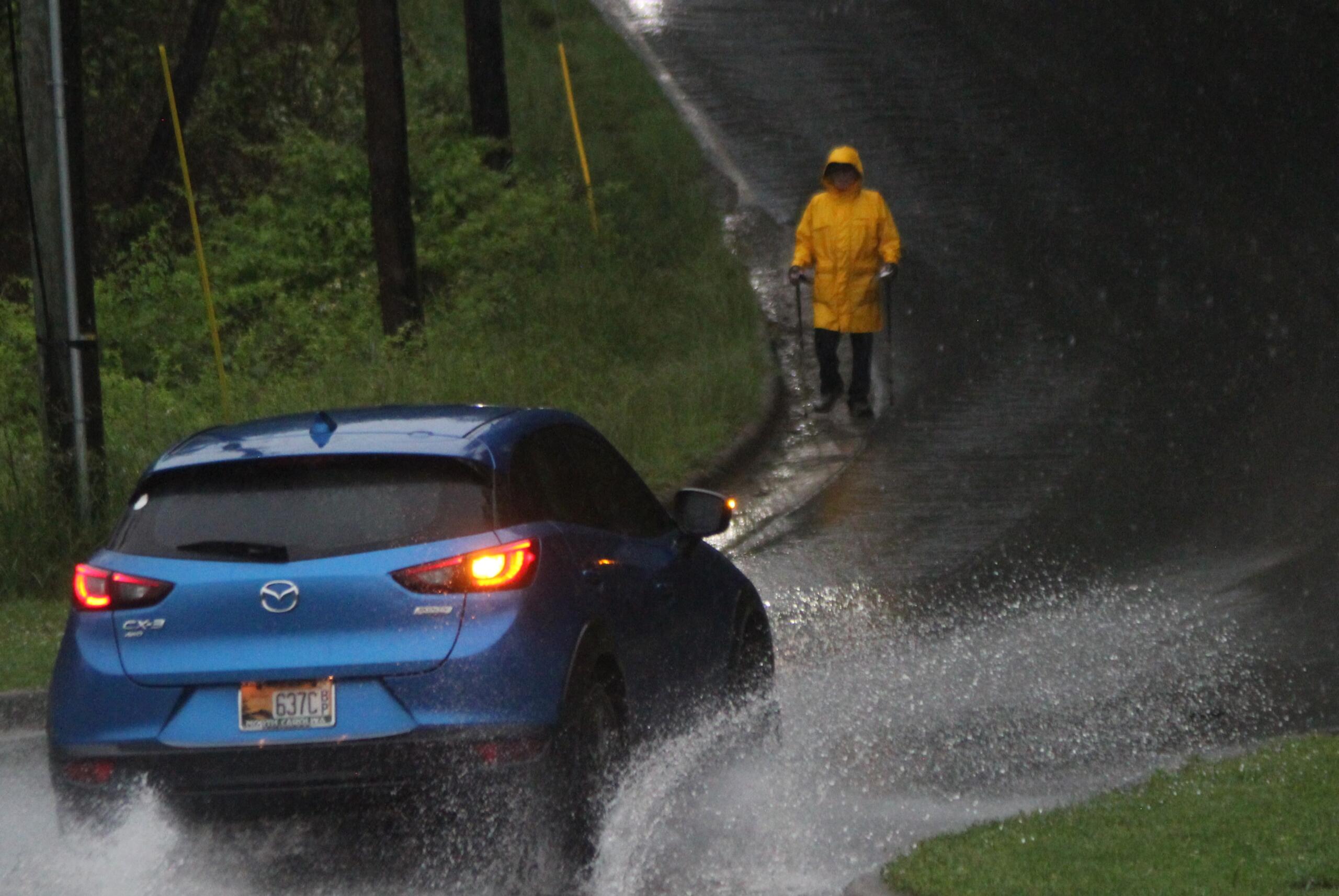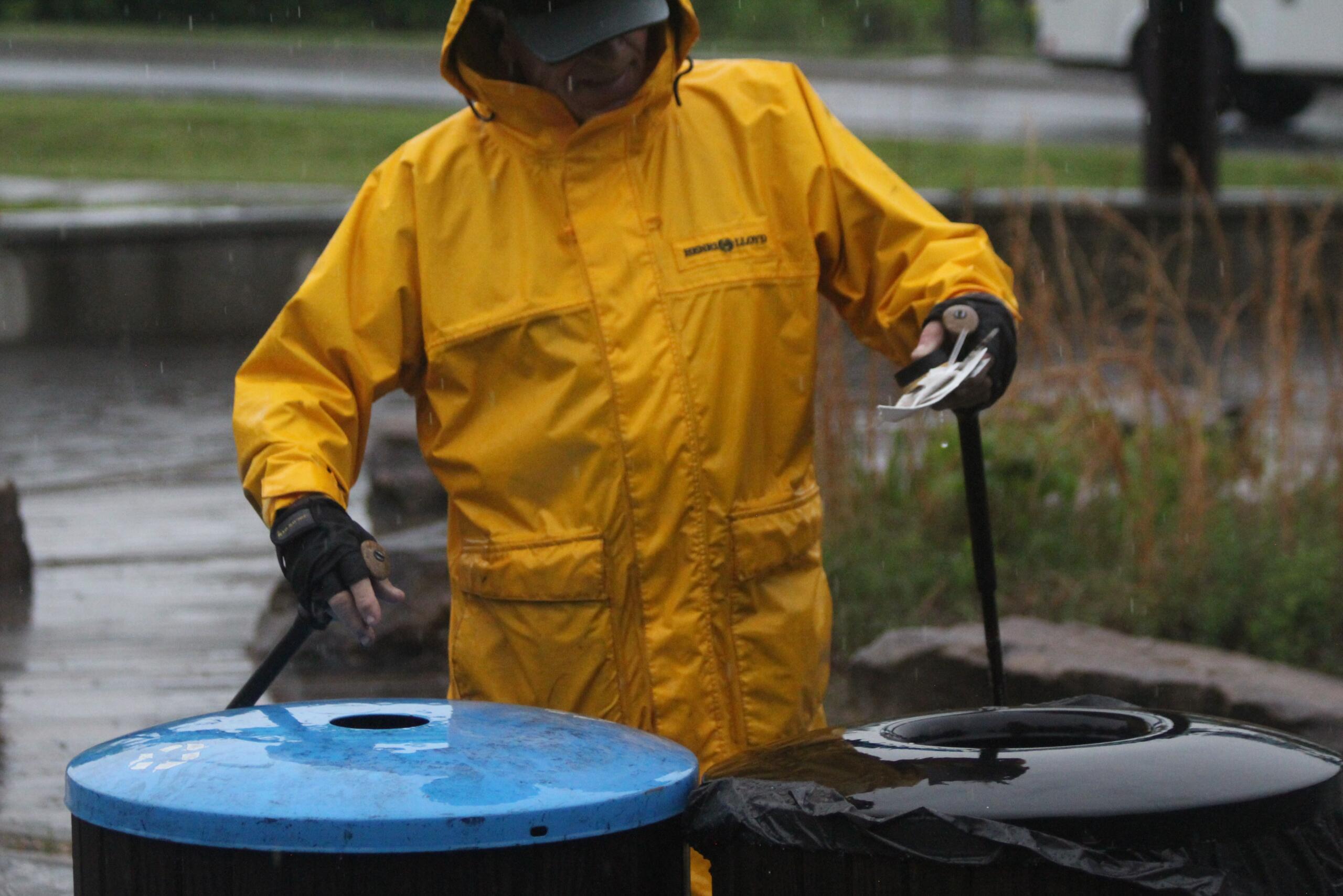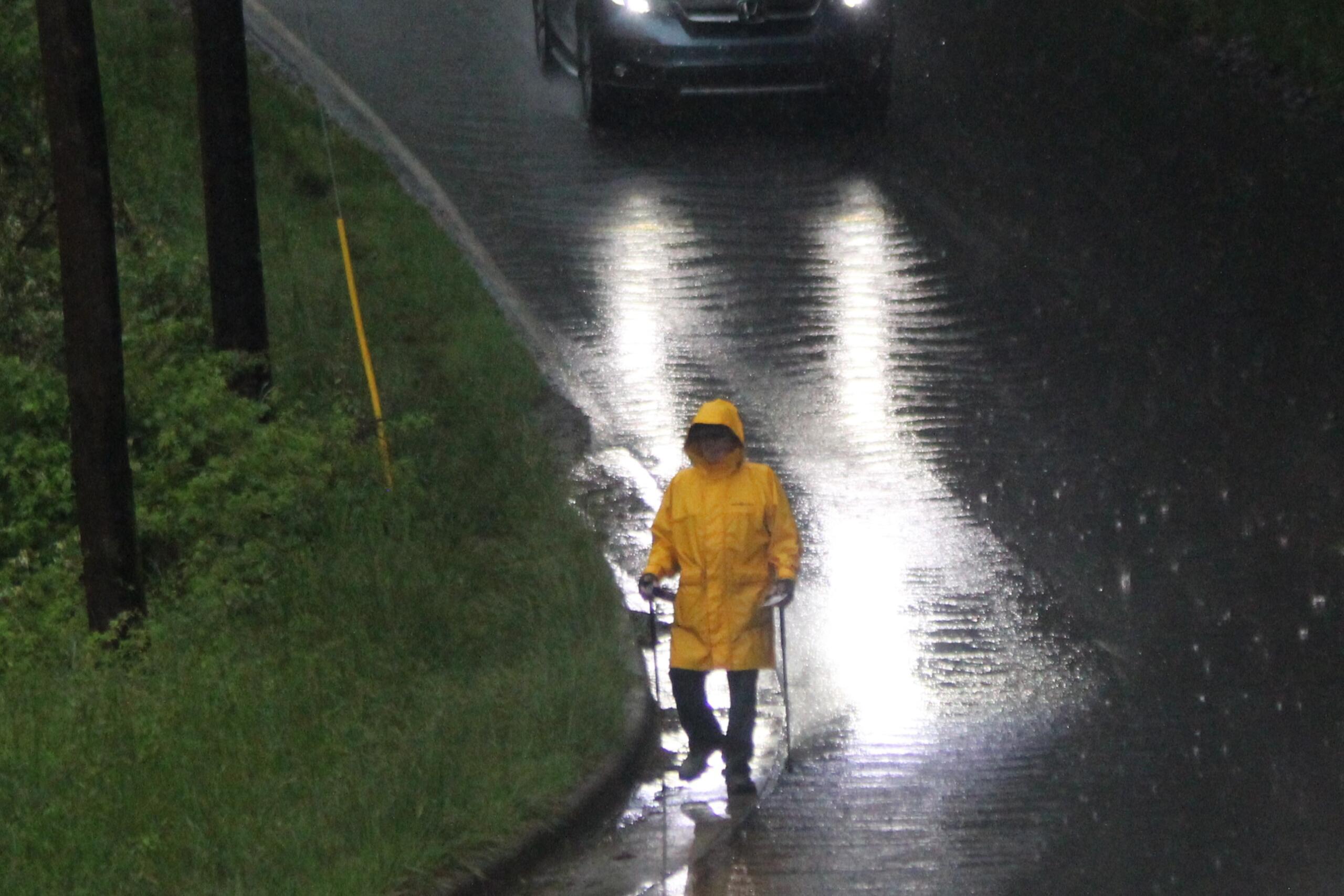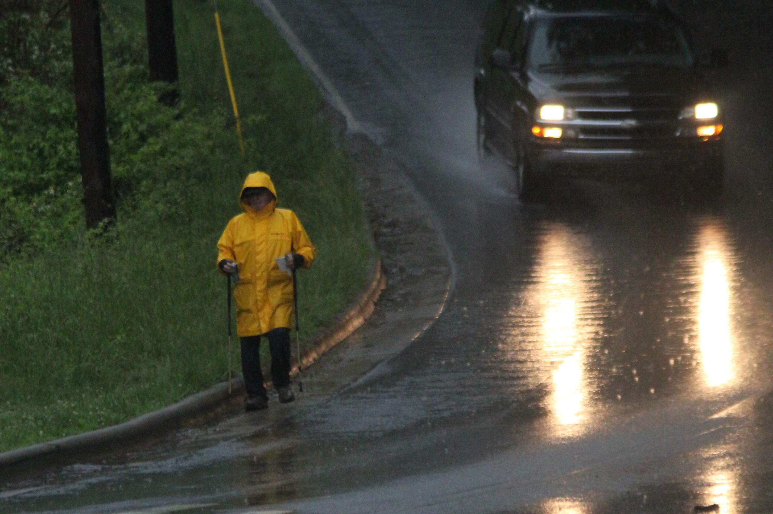 In the middle of the area’s latest thunderstorms, his gloved hands were full, clutching a pair of walking sticks along with handfuls of trash he kept stopping to pick up from the roadway.