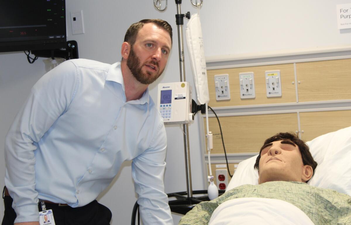 In another simulation room, a mannequin breathes, blinks and reacts to CPR. His pulse can be measured. His oxygen levels rise and fall. He can go into cardiac arrest on cue.