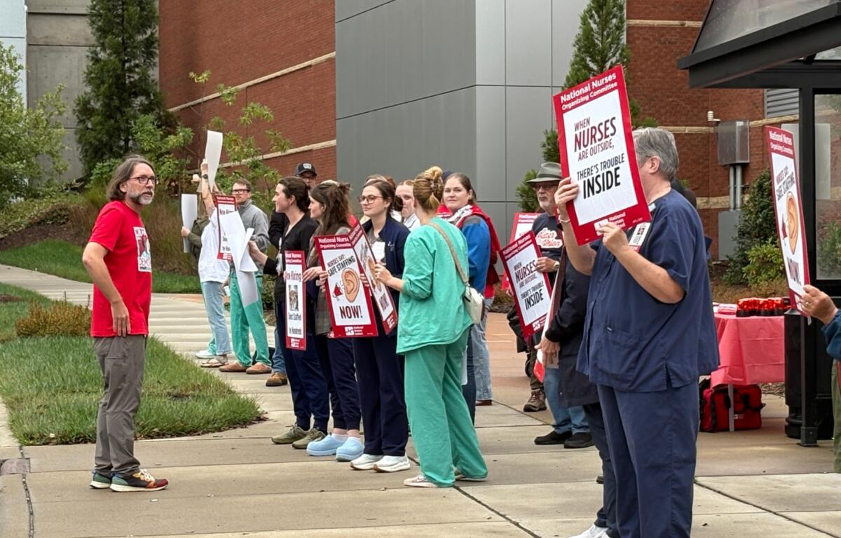 About two dozen nurses gathered near the hospital entrance, holding signs and chanting as passing drivers honked in support. The demonstration was organized by the National Nurses Organizing Committee-North Carolina, part of National Nurses United, the country’s largest nurses union.