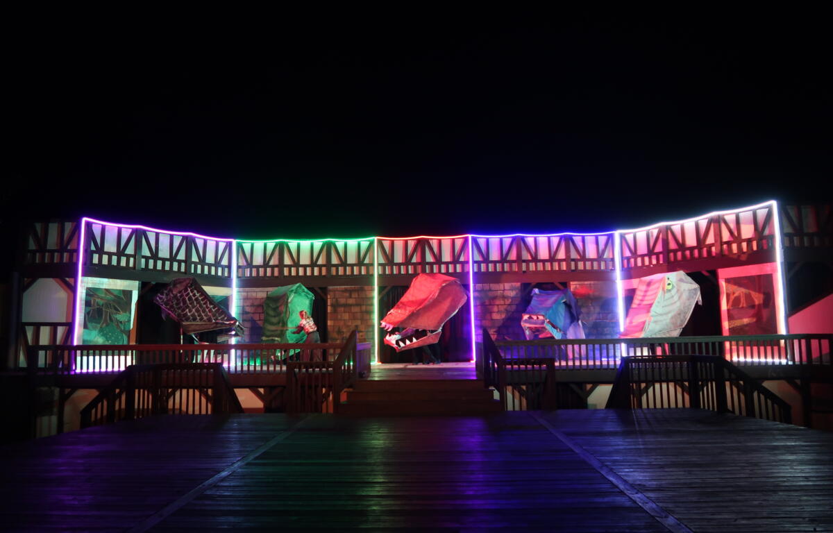 The funniest performances of the night were contributed by Will Storrs as Chuck and Brooks Wallace as Steve, the latter a recurring bit character who began to elicit cheers from the audience any time he appeared onstage. In the world of Tilly’s campaign, Steve is an ineffectual adventurer routinely and gruesomely murdered by the foes Tilly, Agnes and their party encounter. Several of these opponents, including a massive “gelatinous cube” and a five-headed dragon, were brought to life by incredible puppets and defeated with elaborate fight choreography contributed by Smith, Wallace, assistant director Gabby Bailey and Jon Robinson. The swordplay and squibs in “She Kills Monsters” were ubiquitous and impressive.