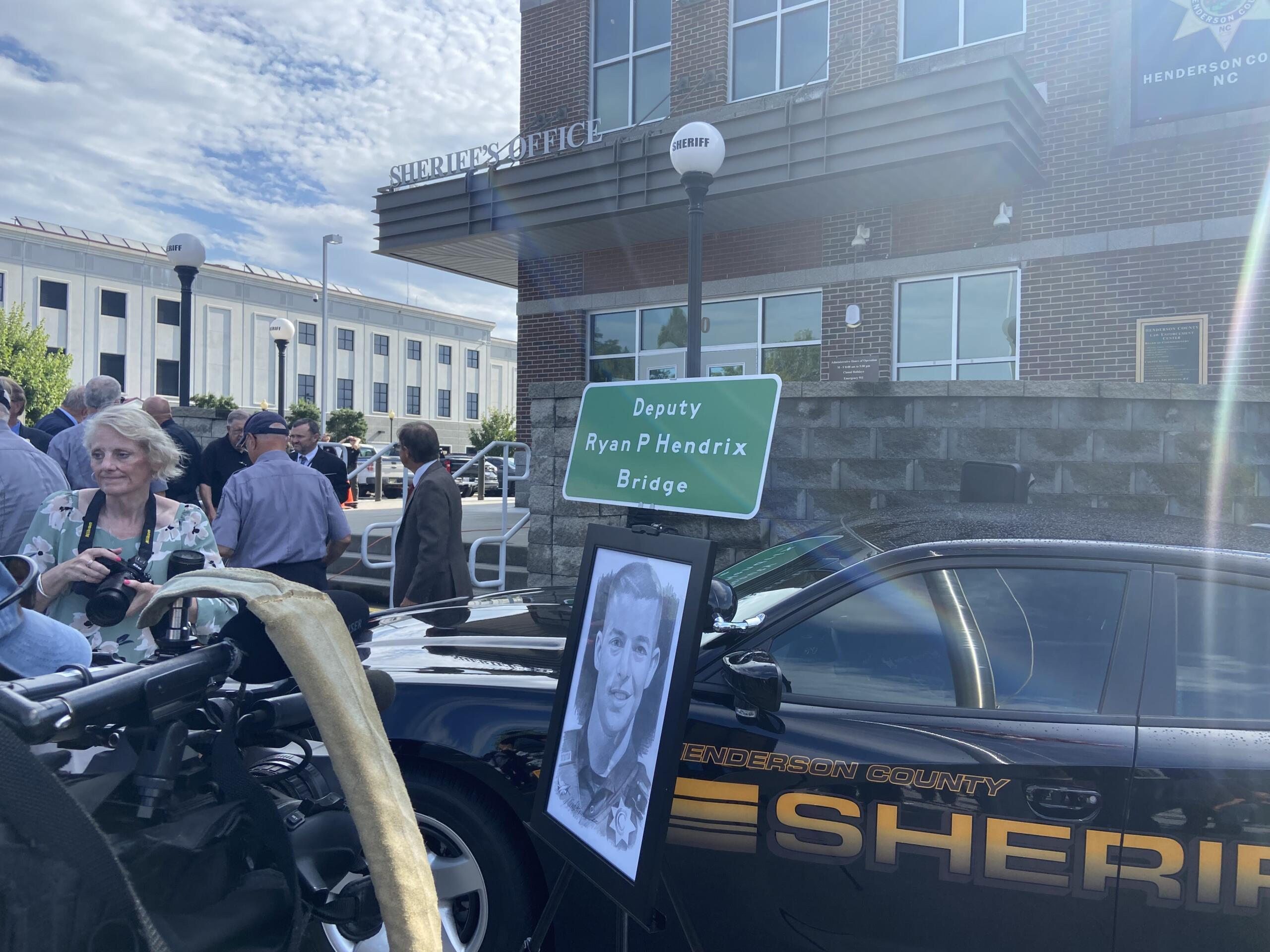 Early morning rain set a somber tone for July 18, 2024. But clouds quickly parted by mid-morning and the sun shined down on community members who gathered outside the Henderson County Sheriff’s Office to remember the fallen deputy. A ceremony was held to dedicate and rename the bridge located on Hendersonville’s Four Seasons Boulevard at the I-26 overpass to Deputy Ryan P. Hendrix, who was killed in the line of duty in 2020.