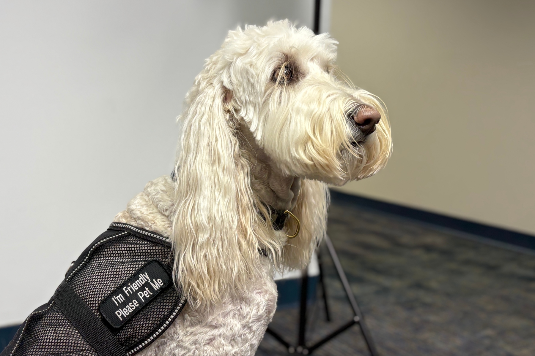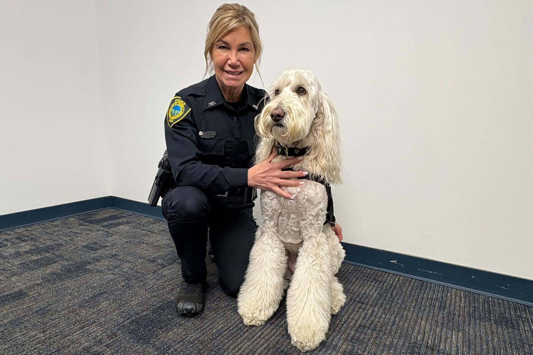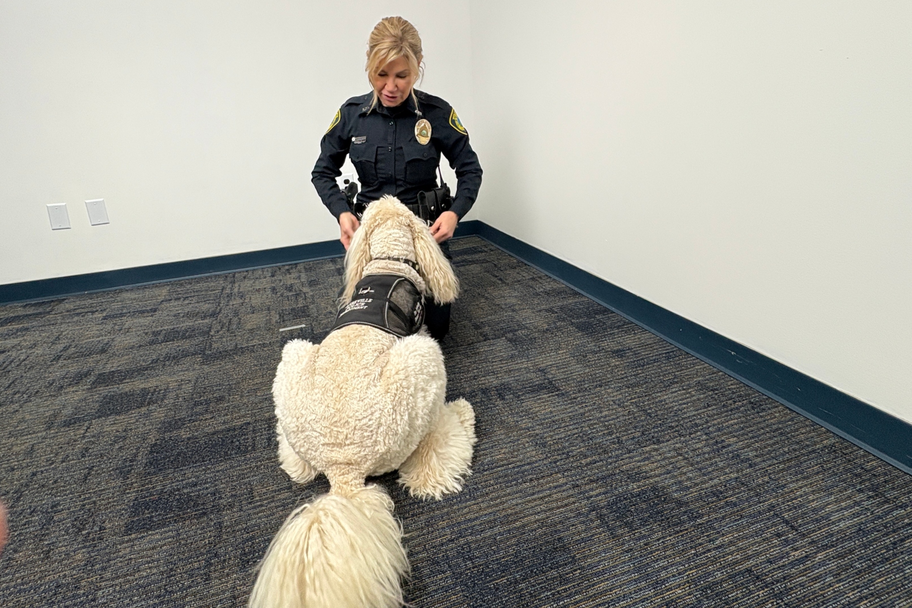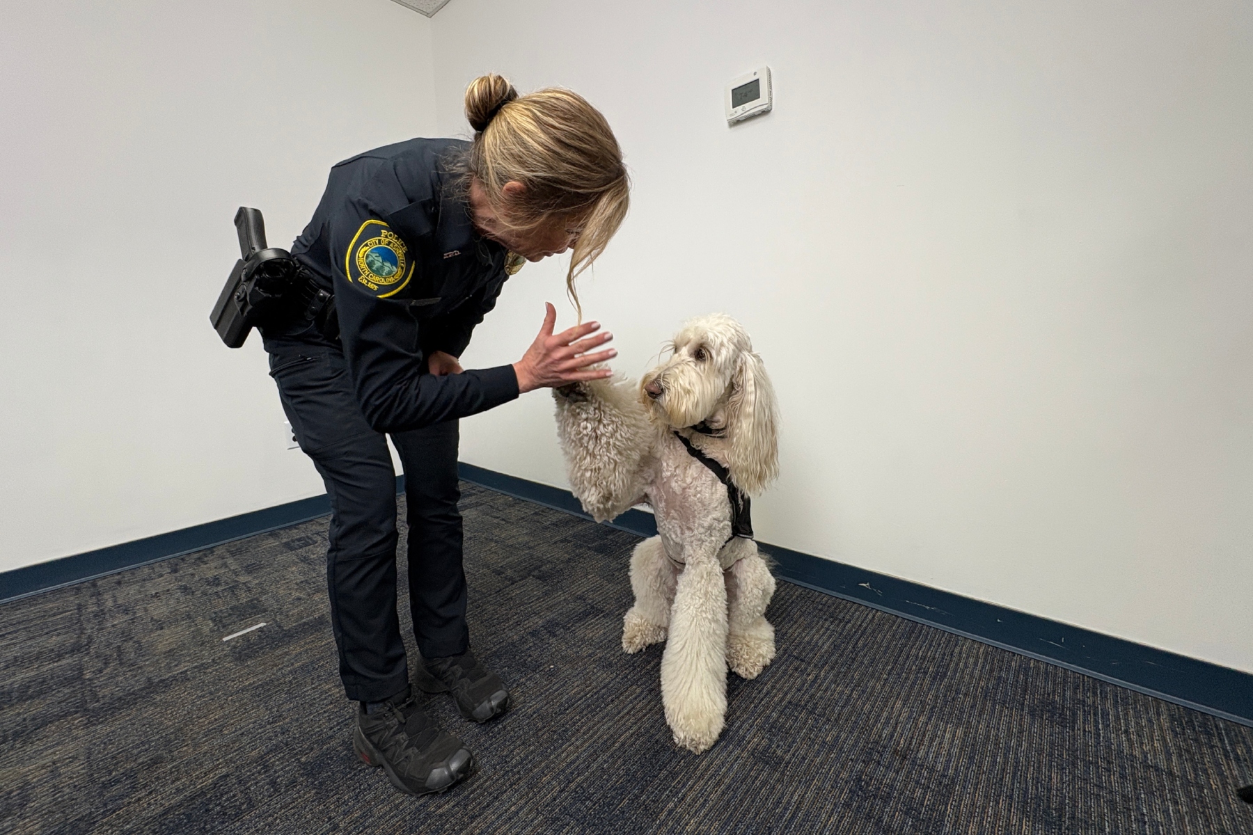 The big white Goldendoodle doesn’t carry a badge, track suspects or sniff for drugs. Instead, she gives high-fives, leans in for hugs and, when needed most, climbs gently into someone’s lap to deliver what her handler calls “compression therapy” — the steady, calming weight of a dog who seems to know exactly when she’s needed.