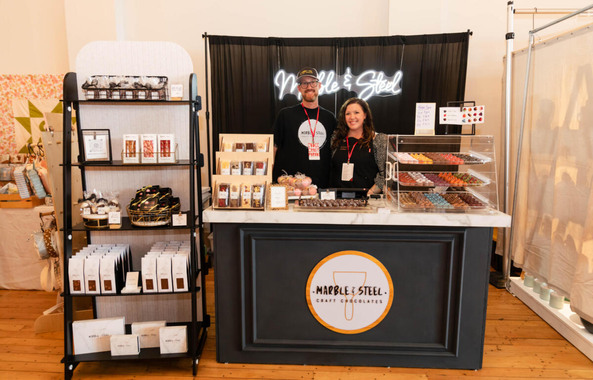 “I don’t know if you’ve seen our logo, but we have a steel scraper as the logo icon. In the business, at least where we worked, we called it a steel,” Cook explained. “So, I was thinking like, husband and wife team, you have to use a marble top table to table tempered chocolate, and you gotta grab your steel to move it around. Two hand-in-hand things that goes into making the product that we have, and kind of a nod to the team of chocolatiers making it.”