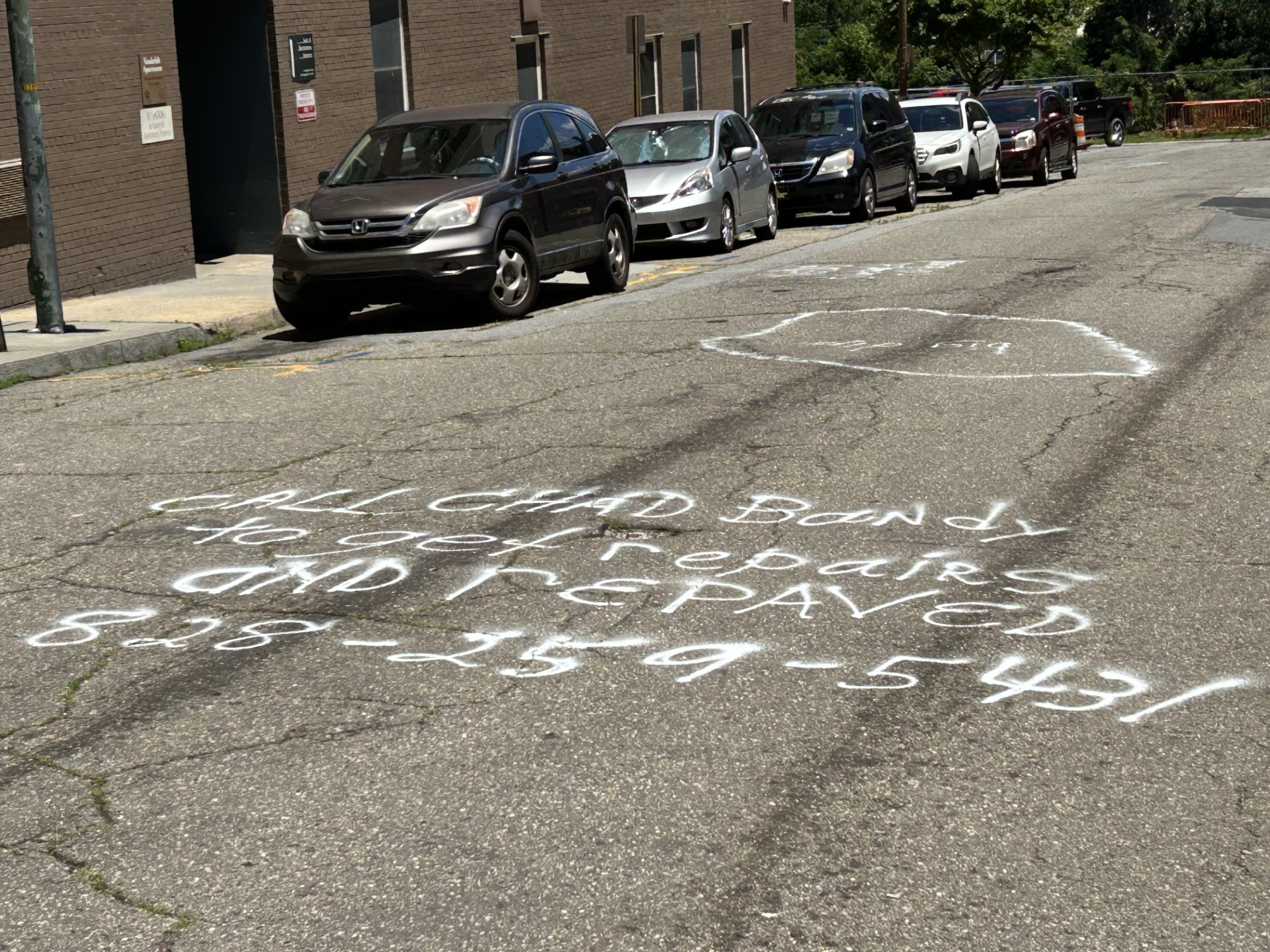 And, at the entrance to the road, which runs beside Pack Memorial Library and Vanderbilt Apartments on the way to the Harrah’s Cherokee Center parking garage, the helpful person painted the contact information for Bandy.