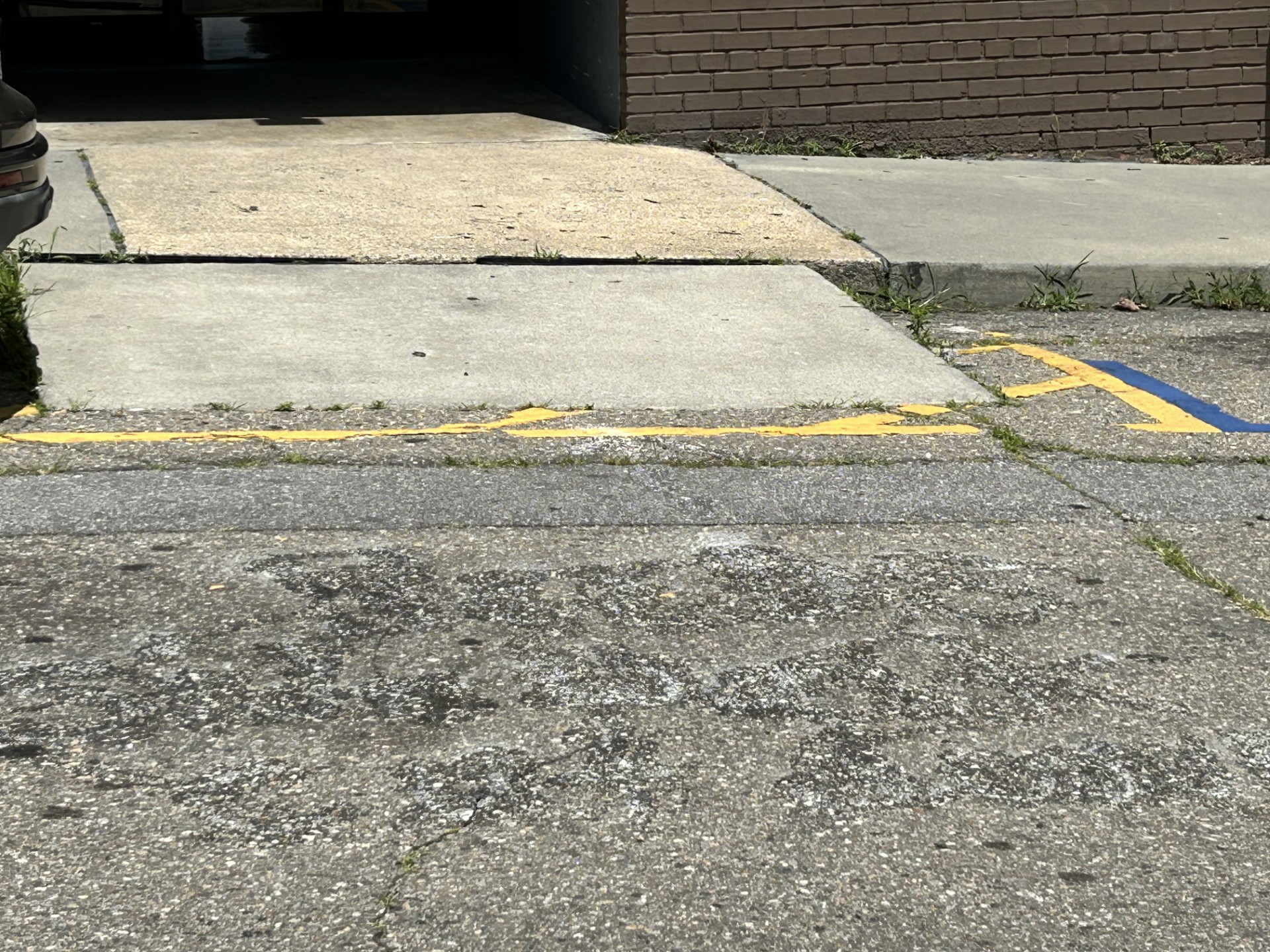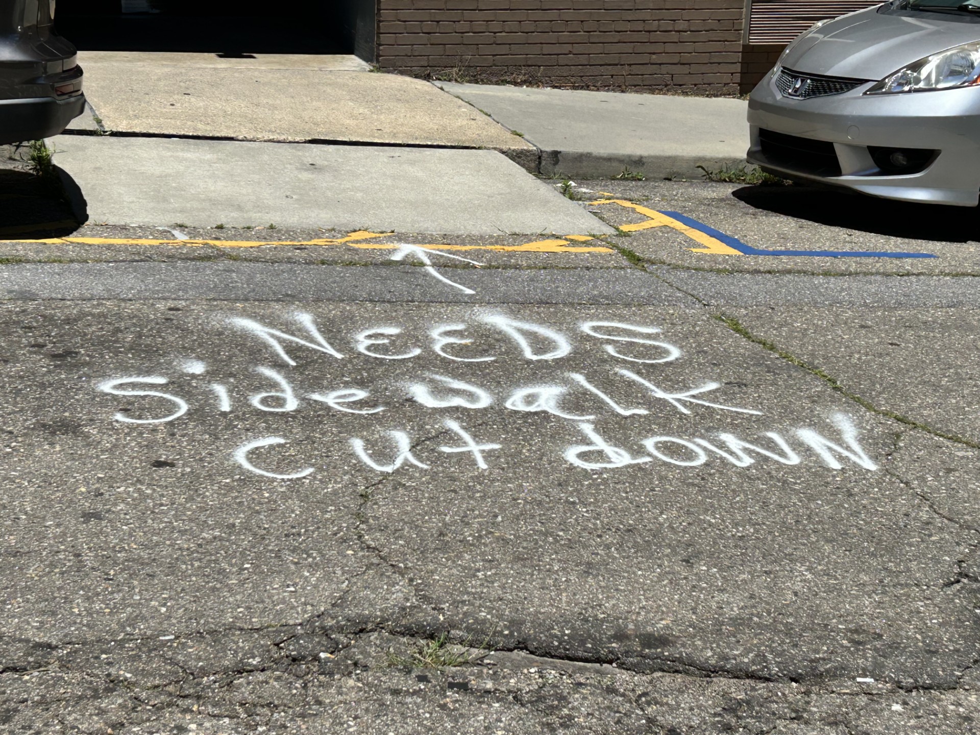 A white arrow pointed to the sidewalk beside Vanderbilt Apartments with the words, “Needs sidewalk cut down” painted on the road.