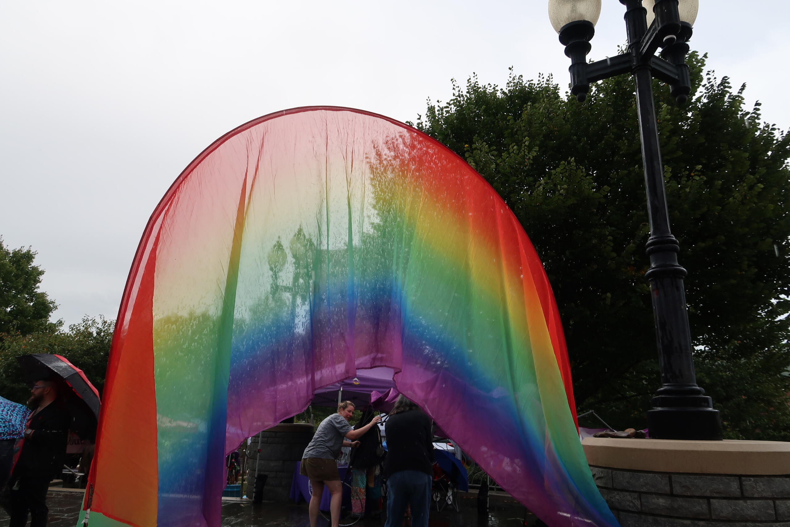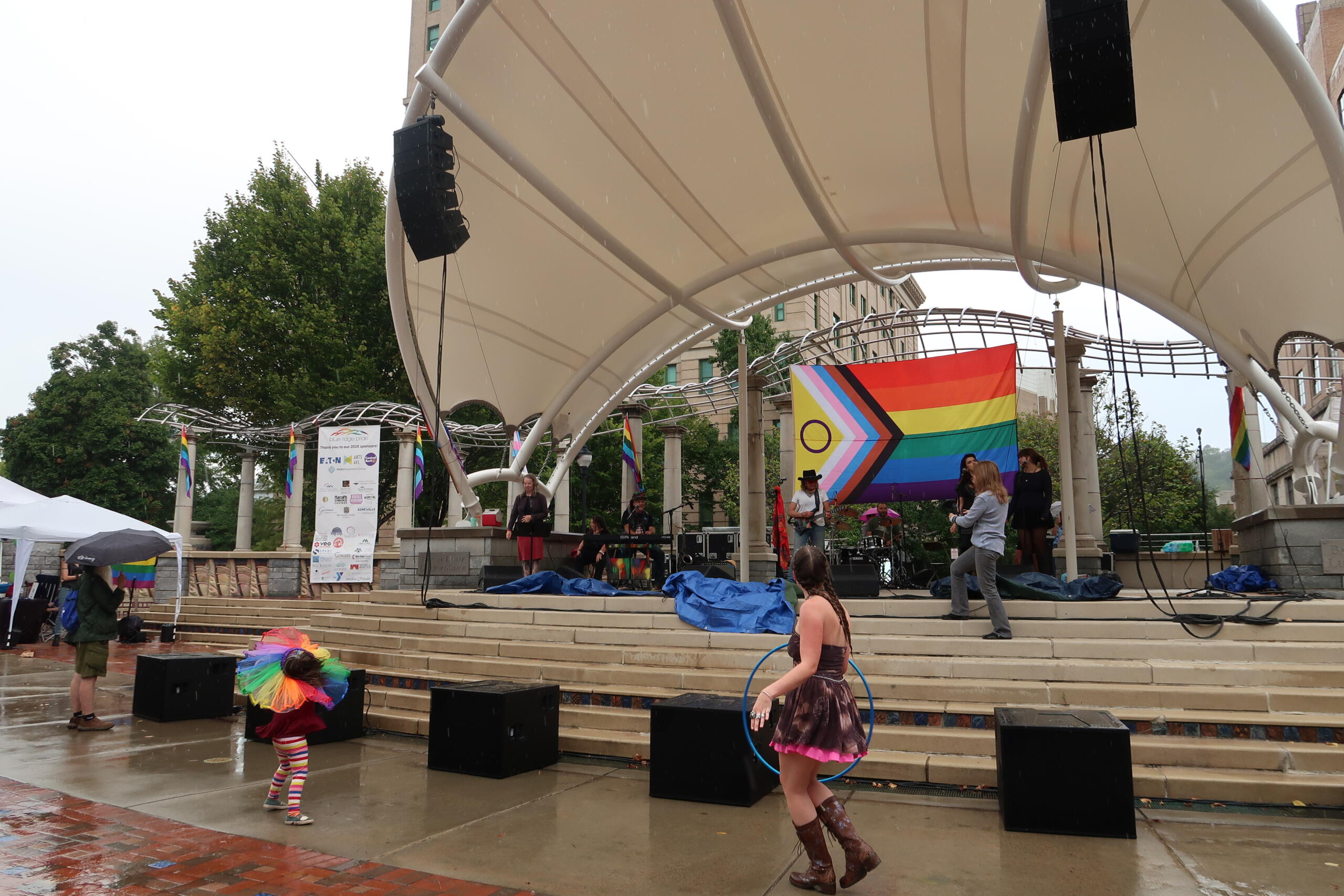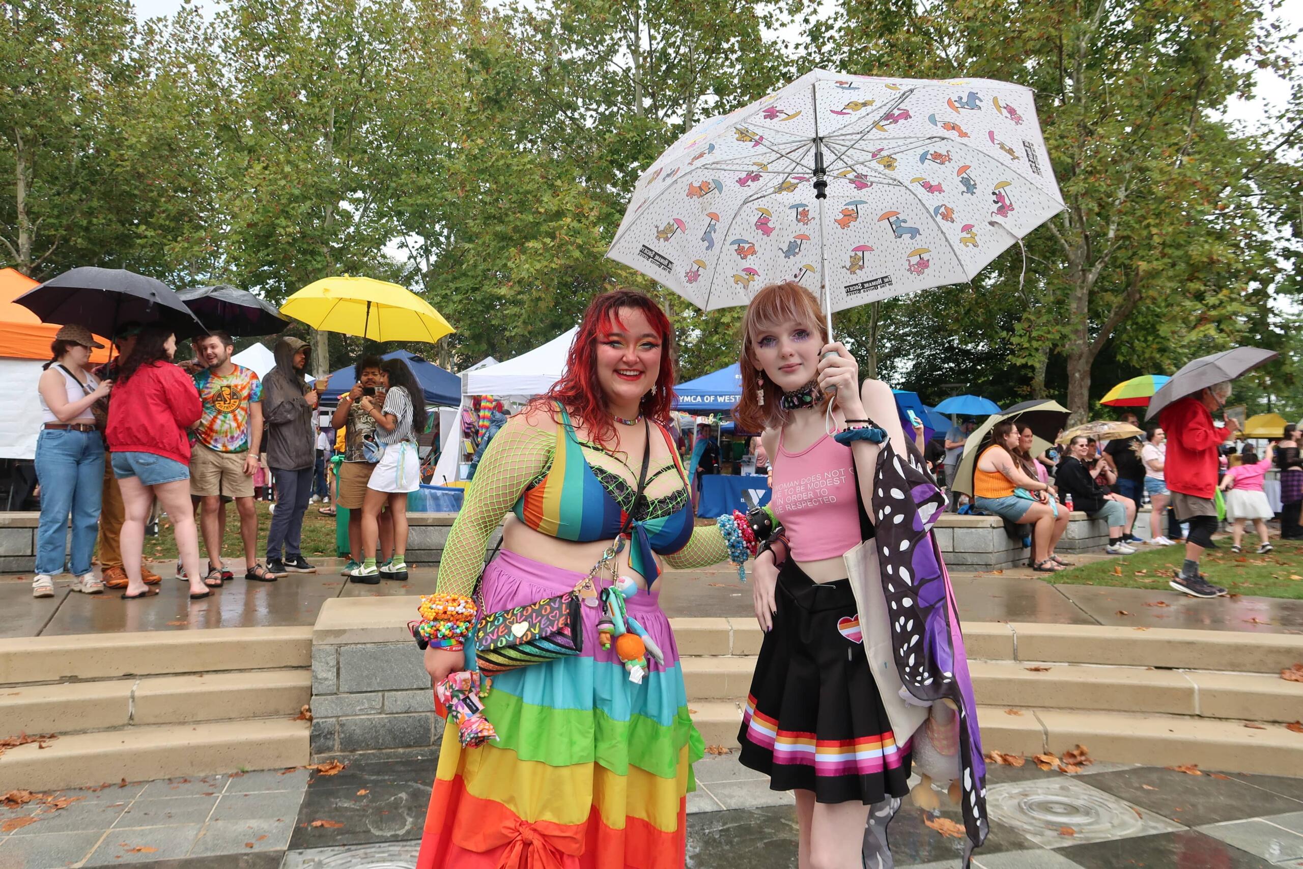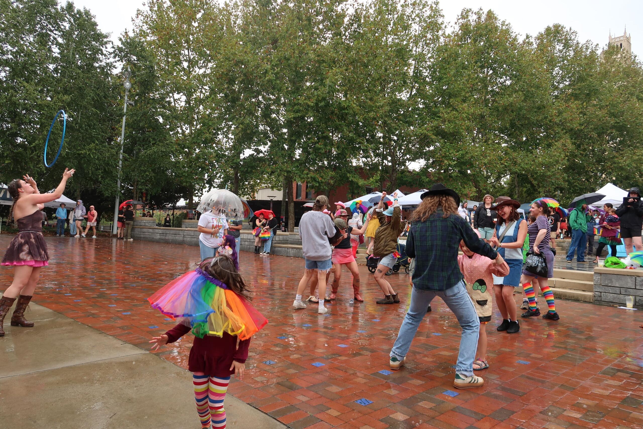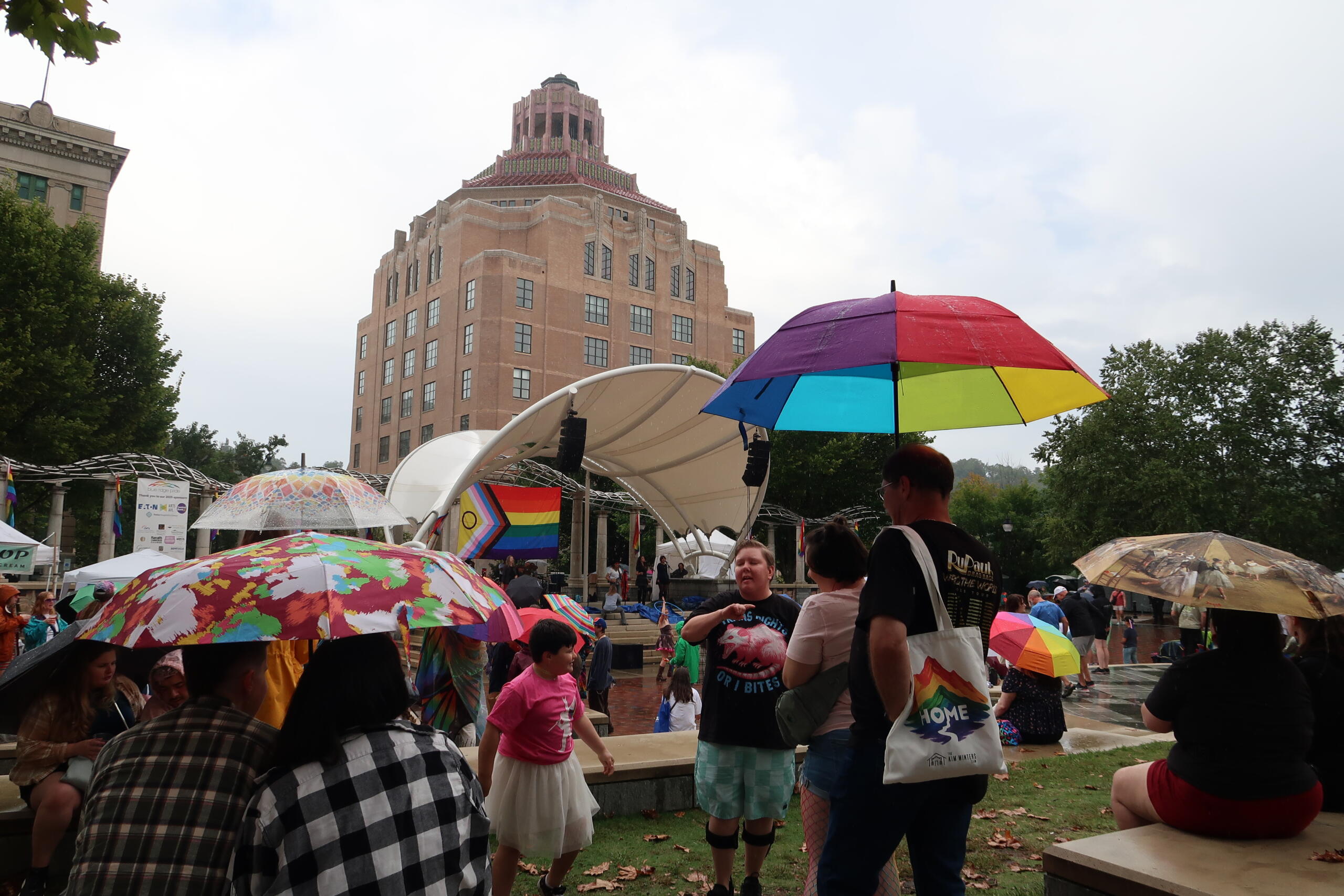 There were hundreds of Pride participants celebrating in downtown Asheville, most decked out in their best rainbow regalia. Several rainbow umbrellas also dotted the crowd as rain fell, but Asheville’s queer community weathered the storm, dancing, singing and chatting as bands played on the two festival stages.