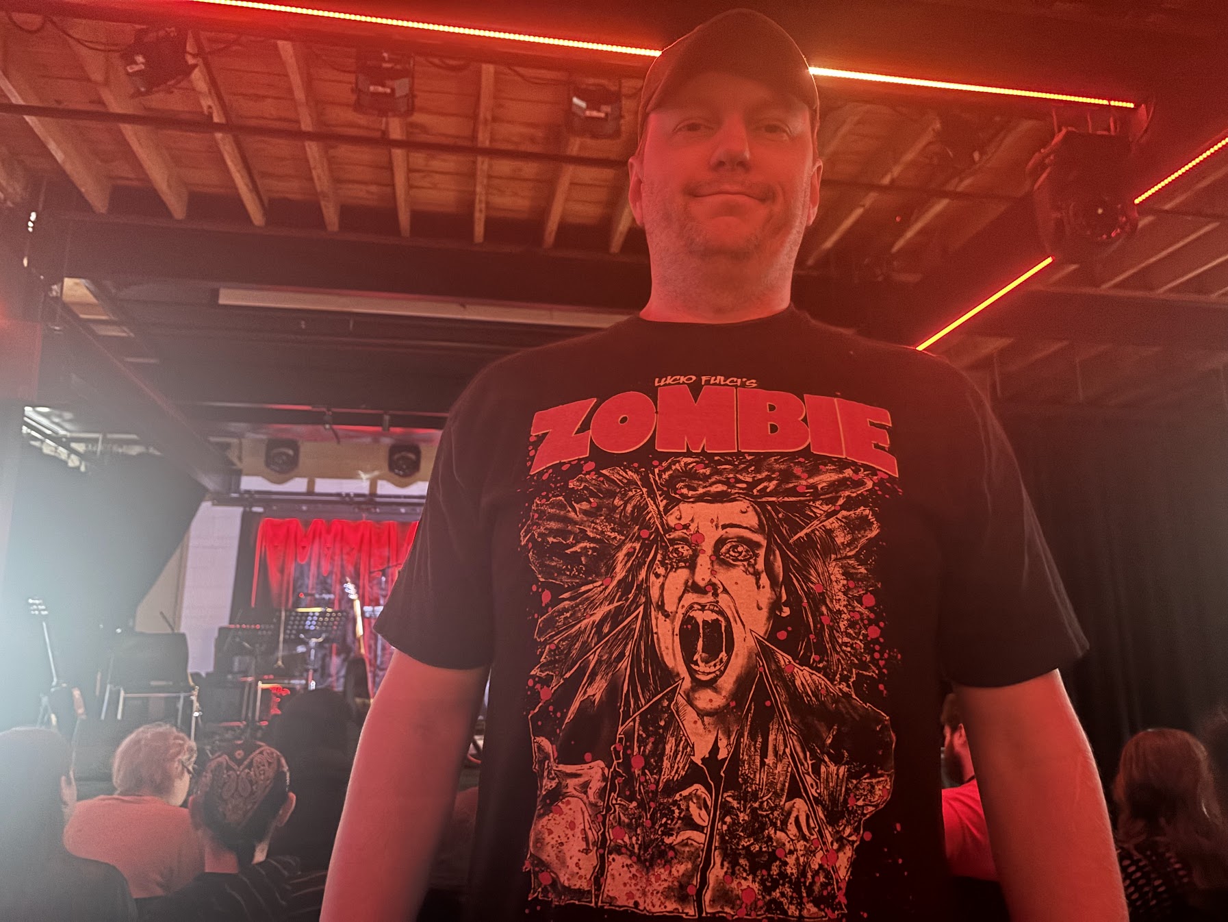 Despite the gross-out factor of a movie like “Zombie Flesh Eaters” – also known as “Zombi 2” or simply “Zombie” – Eulogy was a packed house on Friday night. Black-clad fans filed into their seats to watch the film while Frizzi and his band played their psychedelic, synth-heavy score behind a projector screen. People hooted and hollered during the gnarliest zombie action and cheered for Frizzi at musical climaxes. Many even wore “Zombi 2” T-shirts to the event.