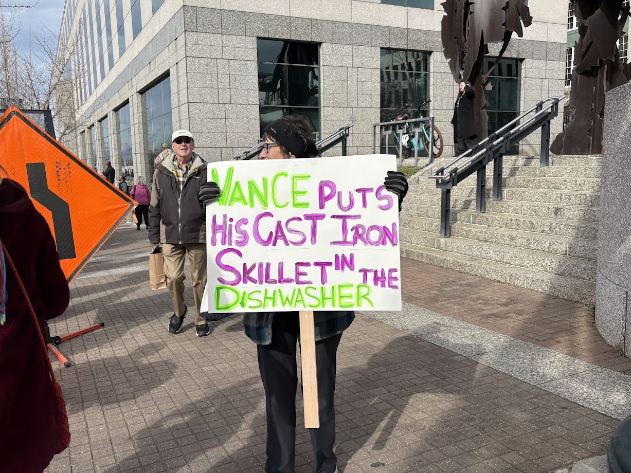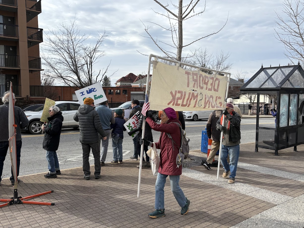 The protest came as President Donald Trump was set to address a joint session of Congress on his turbulent first weeks in office. It was also the same day the Trump administration imposed 25 percent tariffs on Canadian and Mexican imports and doubled the tariff slapped last month on Chinese products to 20 percent.