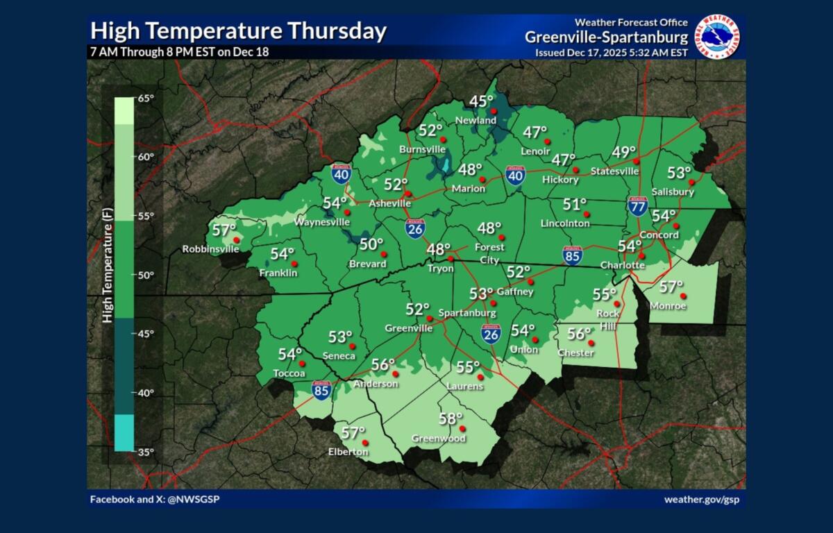 Forecasters said overnight low temperatures will continue a recent warming trend, rising to above normal for the first time in several days as deeper moisture spreads across the western Carolinas. Rain is expected to develop Thursday afternoon and continue through Thursday night.