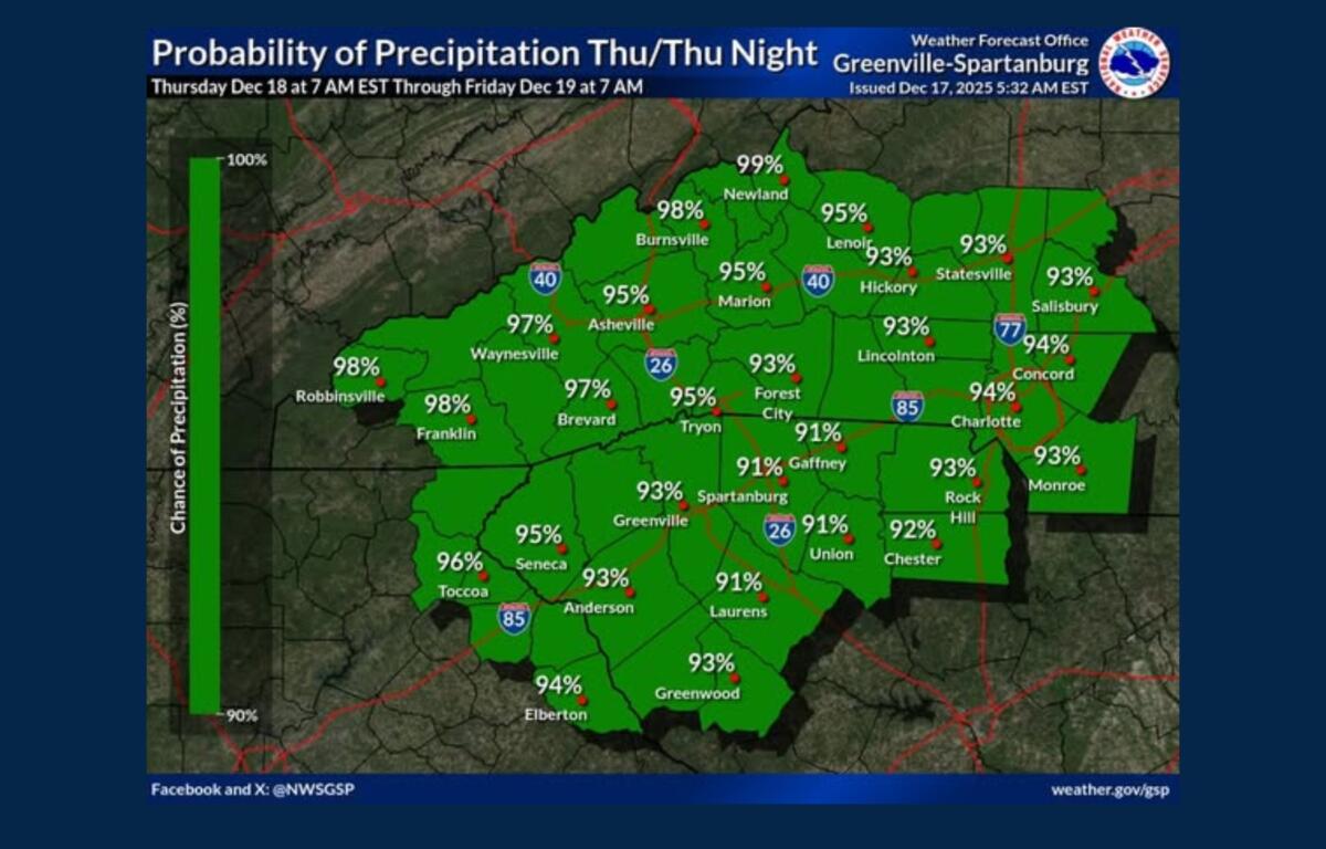 ASHEVILLE, N.C. (828newsNOW) — Rain is expected to return to Western North Carolina on Thursday as a cold front moves through the region, bringing periods of showers and cooler temperatures, according to the National Weather Service in Greenville-Spartanburg.