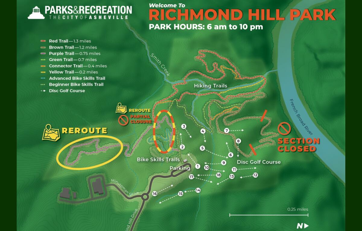 “Reopening of trails at Richmond Hill Park is a significant step forward for our community,” APR Director D. Tyrell McGirt said in a news release. “This phased approach allows us to restore access to this treasured green space for the first time in many months. We are deeply grateful to our dedicated APR team and volunteer partners like WNCDGA and Pisgah Area SORBA for their work to make this possible.”