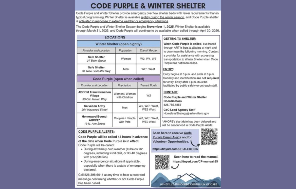 Buncombe County announced that Code Purple season will run through April 30, 2026, providing emergency shelter when temperatures drop to 32 degrees or below, or 33-40 degrees with precipitation.