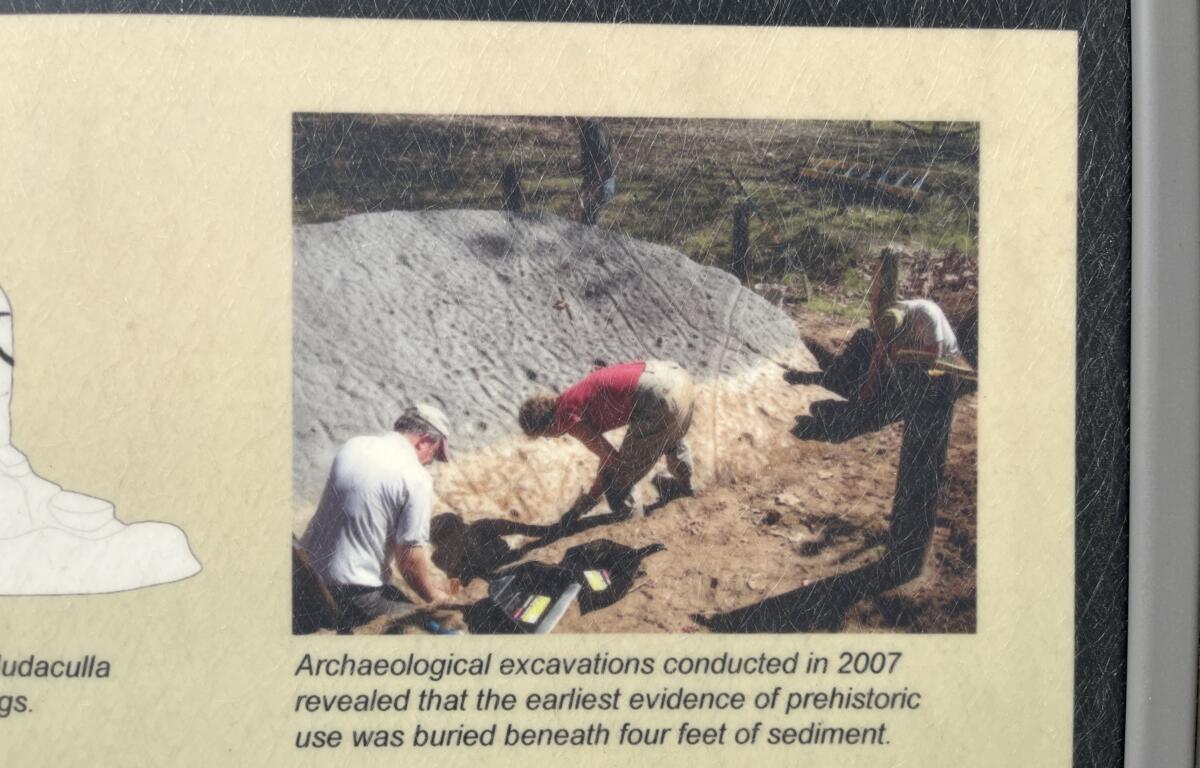 As explained by the plaques surrounding the boulder, the 2007 partial excavation in the immediate vicinity of the boulder unearthed some evidence that pointed to habitation around 3,000 years ago, digging down four feet to find it.