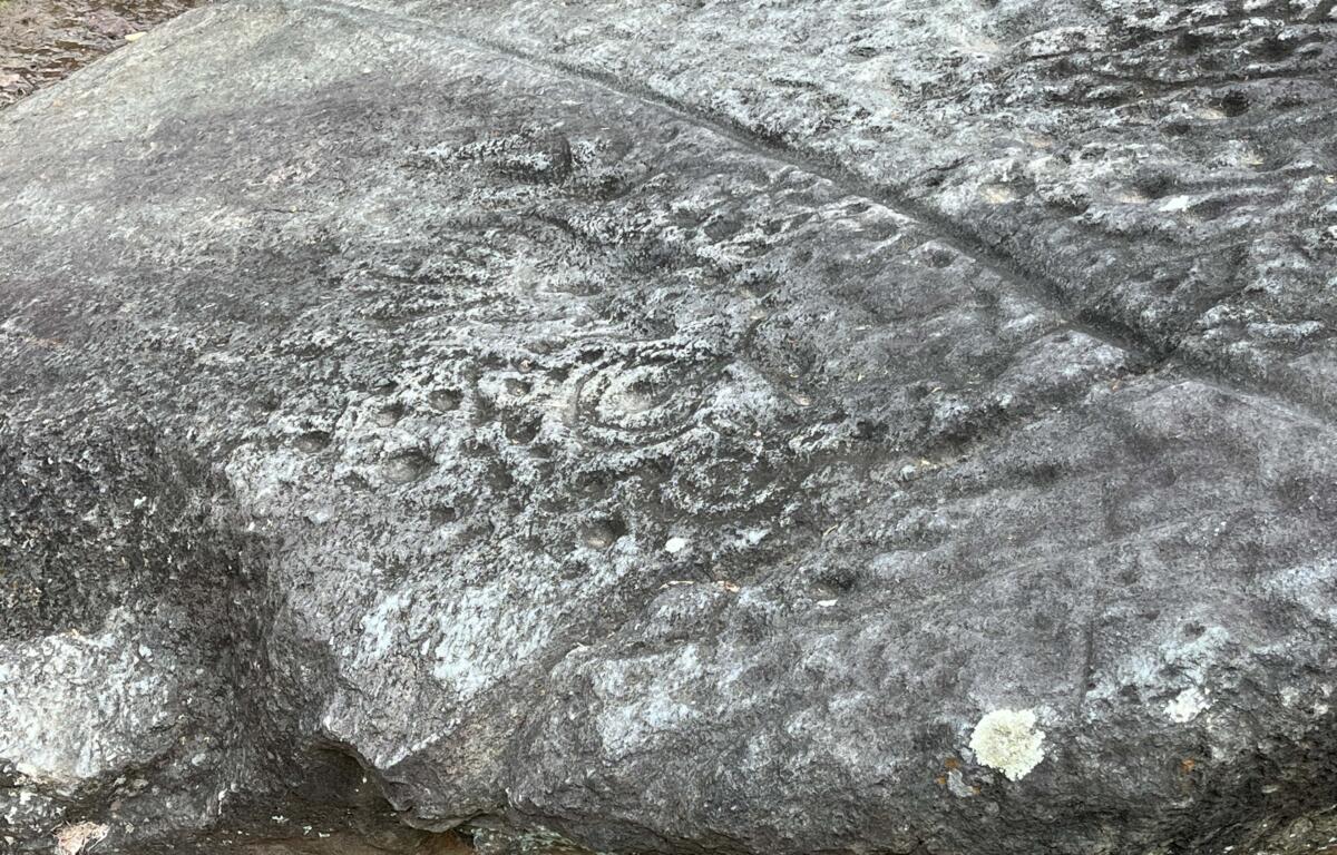The soapstone boulder known as the Judaculla Rock is roughly 20 feet by 10 feet. How deep underground it goes is unknown. Approximately 1,548 designs cover the majority of its surface. According to the Blue Ridge Heritage Trail, the Judaculla Rock has “more [carvings] than any other known petroglyph boulder in the eastern United States.” At its base, there are bowl-making stations chiseled out of the stone.