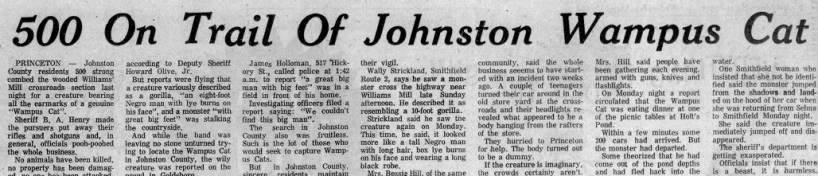 Then, in 1964, the legend stepped out of the shadows in another part of the state. In Johnston County, southeast of Raleigh, a rumor of a “Wampus Cat” on the loose drew nearly 500 residents into the woods near Williams Mill Crossroads. Witnesses described everything from a gorilla to a “tall man in a long black robe.” Deputies closed roads and issued traffic tickets as people gathered nightly with rifles and flashlights. Sheriff Howard Olive Jr. eventually declared the affair “a teenage prank and a poor joke,” insisting there was no Wampus Cat to be found.