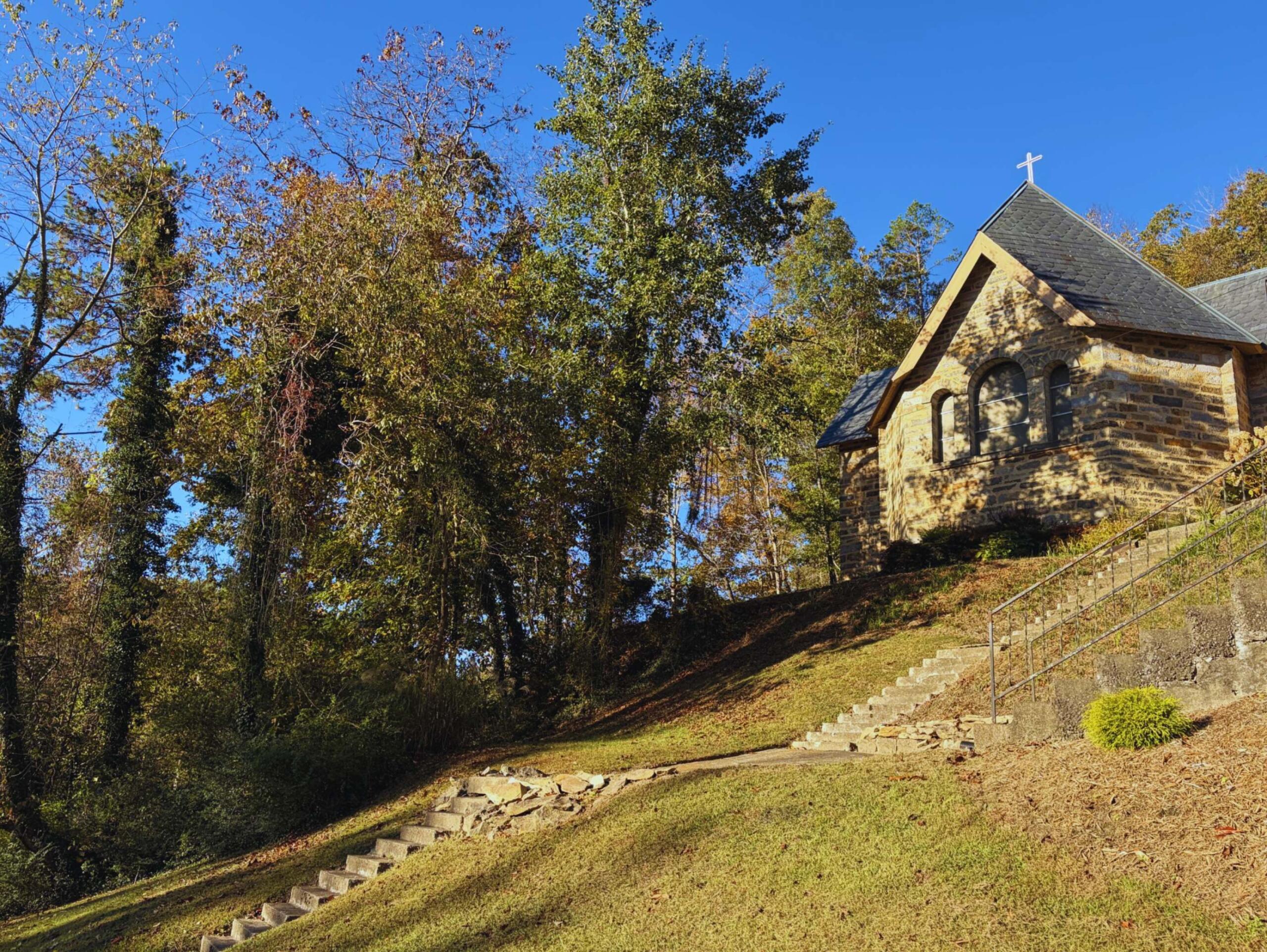 Stone steps lead up the hillside to the Church of the Redeemer in Woodfin, North Carolina, where local legend tells of a ghostly figure seen descending toward the French Broad River. Photo contributed by Shannon Ballard.
