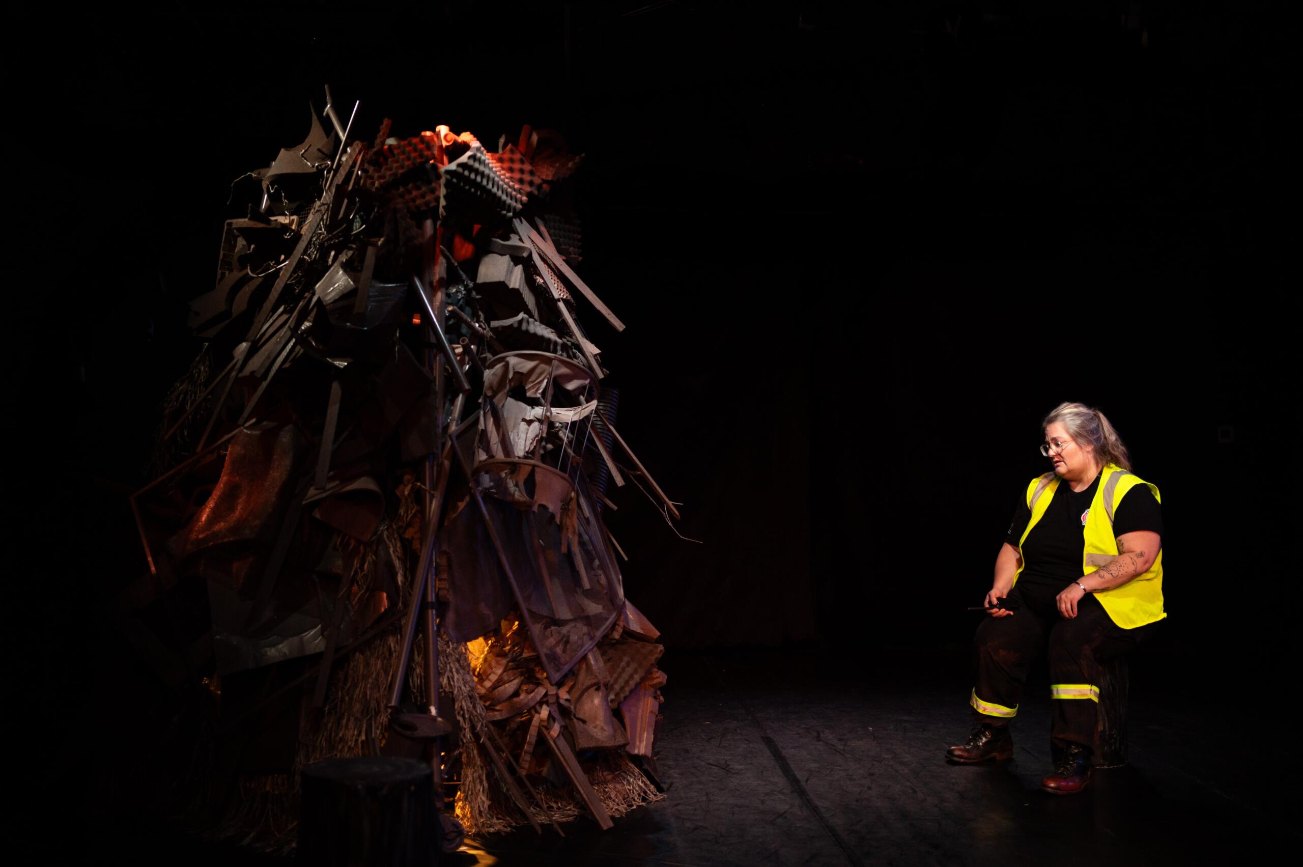 McCarson plays Michel, a volunteer rescue worker assigned to watch a rubble-covered body before the flood victim can be extracted. The set design for the show is spare and all too familiar for Helene survivors, featuring three dark stumps littered around a grey, hulking pile of garbage, artfully arranged in an impressive conical sculpture. The greyscale set, filled in with darkness on the black box theater stage, relied on McCarson’s performance of the quirky, befuddled Michel to bring color to the show.