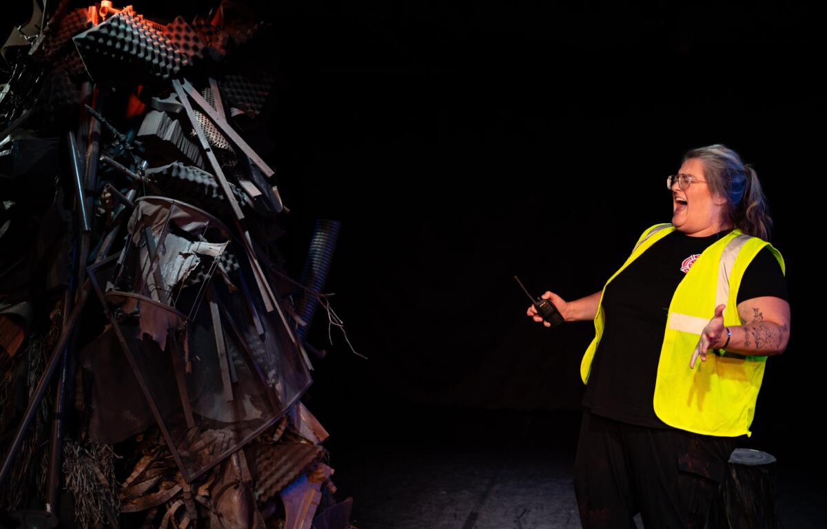 McCarson plays Michel, a volunteer rescue worker assigned to watch a rubble-covered body before the flood victim can be extracted. The set design for the show is spare and all too familiar for Helene survivors, featuring three dark stumps littered around a grey, hulking pile of garbage, artfully arranged in an impressive conical sculpture. The greyscale set, filled in with darkness on the black box theater stage, relied on McCarson’s performance of the quirky, befuddled Michel to bring color to the show.